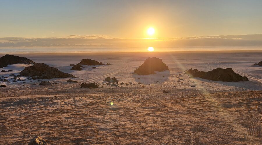 Dienstag, 3. Februar 2026 Der Tag bricht sonnig an. Es hat keinen Nebel. Wir packen zusammen und fahren in die Stadt. Am Strand entlang stehen …