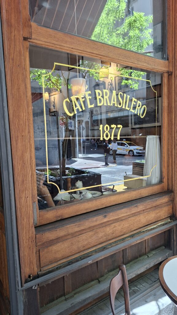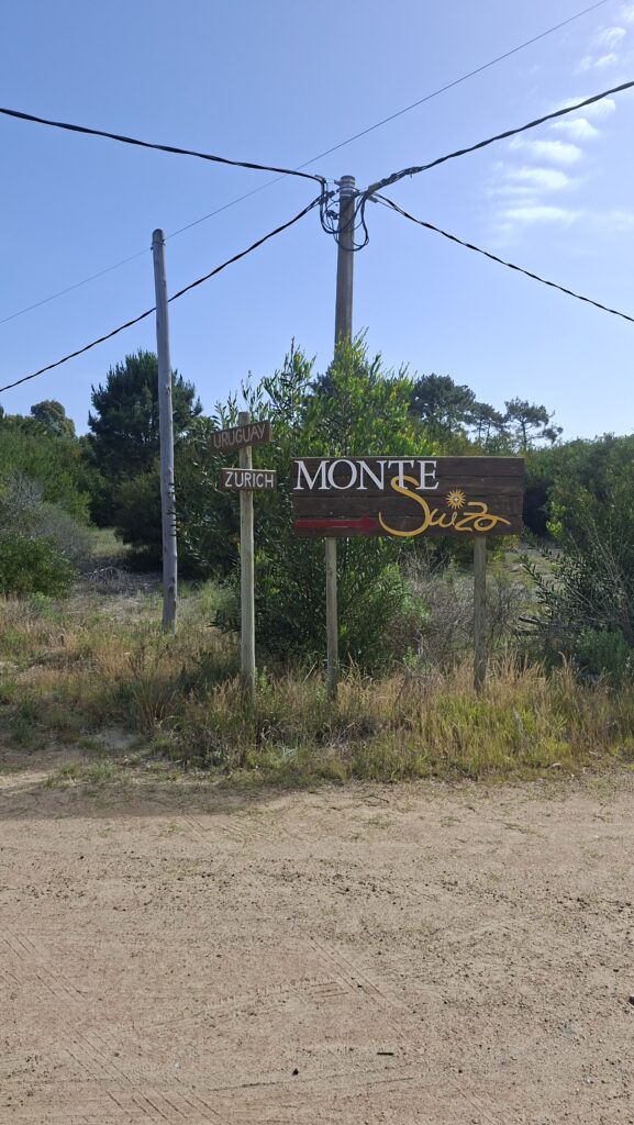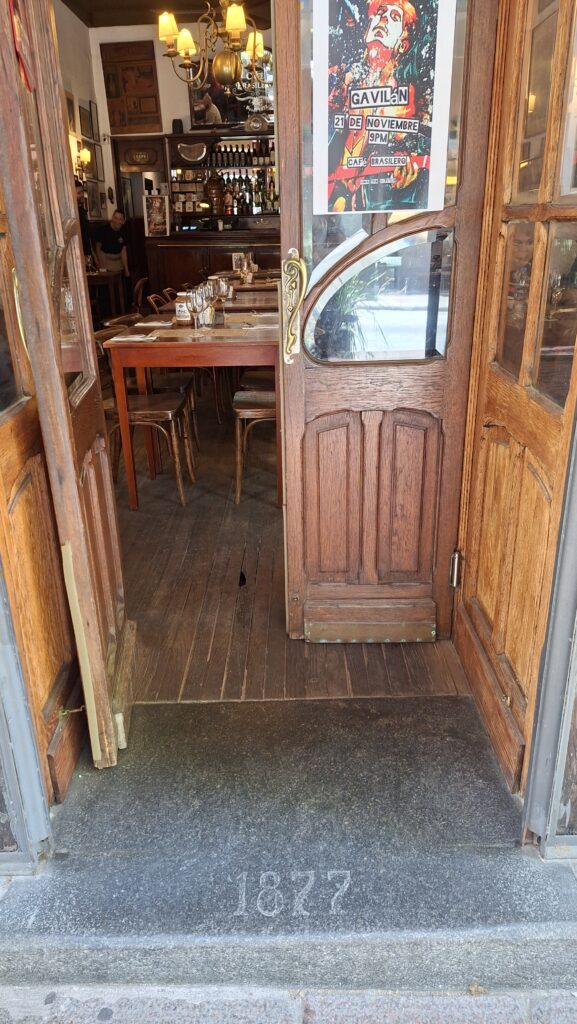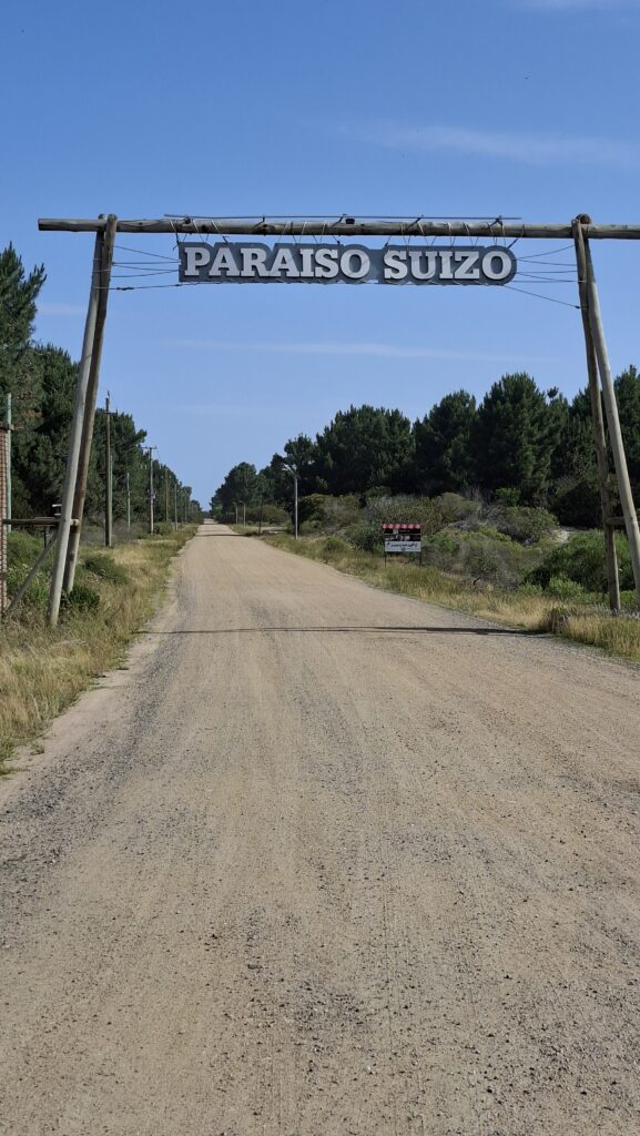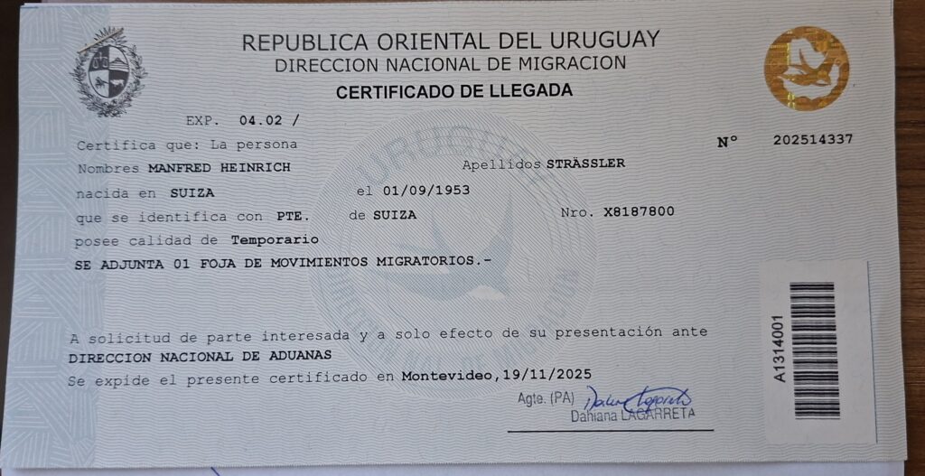 Manfred muss sich um 7:30 Uhr auf dem Weg zum Bus machen. Er läuft eine lange, gerade Staubstrasse bis zur Hauptstrasse. Dort hängt ein Schild, das den Weg zum Campingplatz zeigt. Manfred muss in Montevideo zur Immigration, um ein Dokument zu bekommen. Dieses braucht unser Agent, um unseren Camper aus dem Hafen zu bringen. Bis der Bus nach «Hause» fährt hat Manfred noch Zeit und besucht ein altes Café.