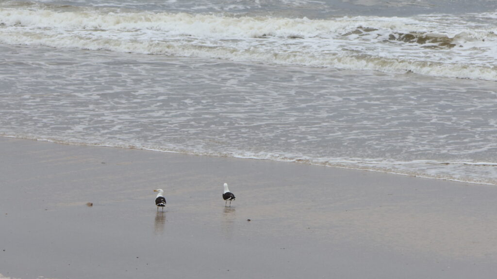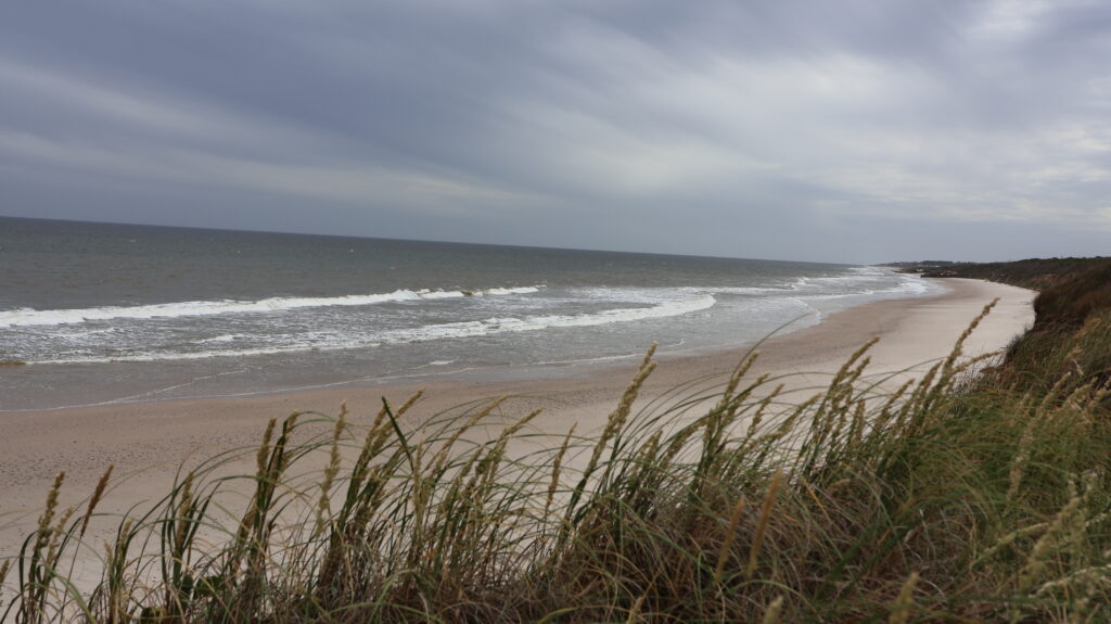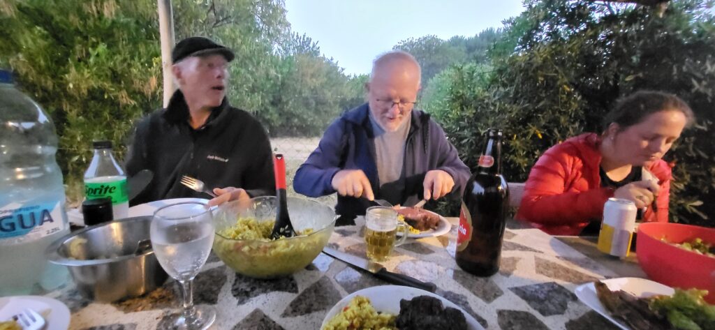 Wir hören das Meer immer stärker. Der Himmel wird schwarz, der Wind frischt auf und ich laufe zum Steilufer. Kein Mensch hält sich am Strand auf. Nur zwei Möwen sind zu sehen. Am Abend wird gegrillt. Zuerst wird in einem Behälter Feuer gemacht. Die Glut fällt hinunter und wird zum Grillrost hinübergezogen. Das Fleisch schmeckt vorzüglich und ist butterzart.