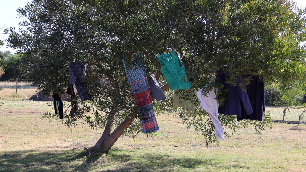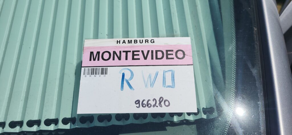 Während Manfred nach Montevideo gefahren wird, kümmere ich mich um die Wäsche. Da ich keine Wäscheleine habe, hänge ich die Wäsche an Kleiderbügel aus dem Kasten und dann an die Äste eines Baumes. Der Wind trocknet die Wäsche im Nu. Schon bald schickt mir Manfred ein Bild von unserem Camper im Hafen. Im Büro des Agenten steht eine argentinische Gasflasche, zurückgelassen von einem Schweizer. Manfred kauft sie und nun ist ein weiteres Problem gelöst.