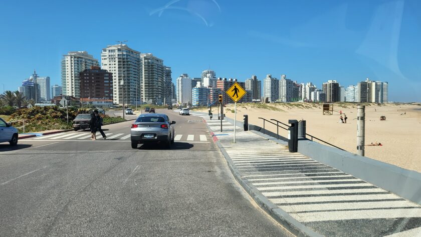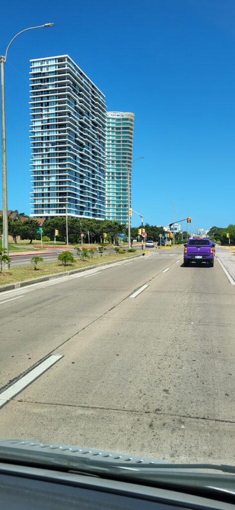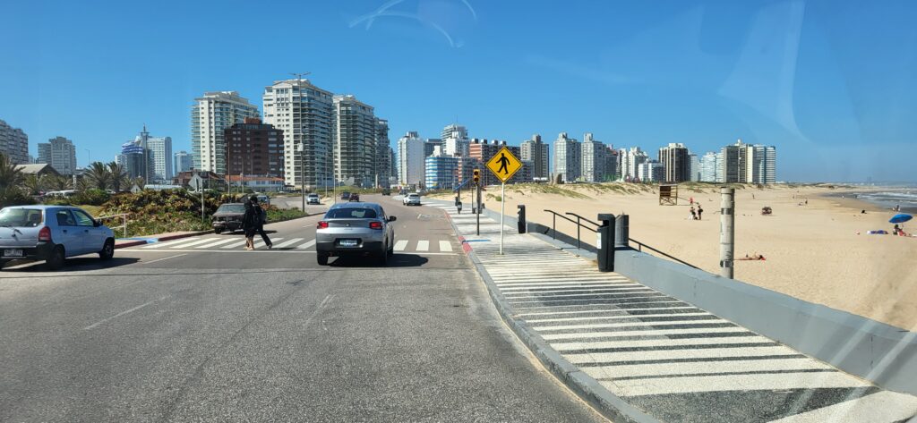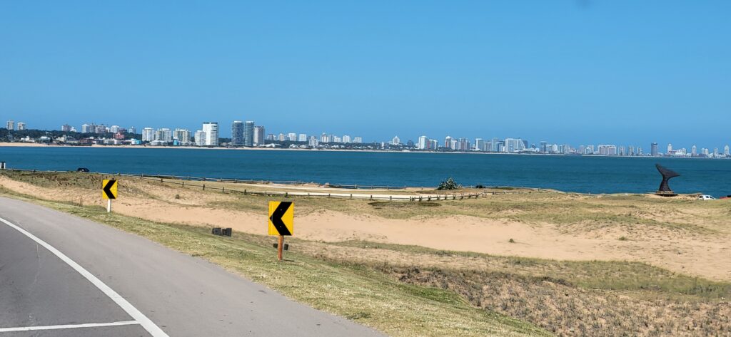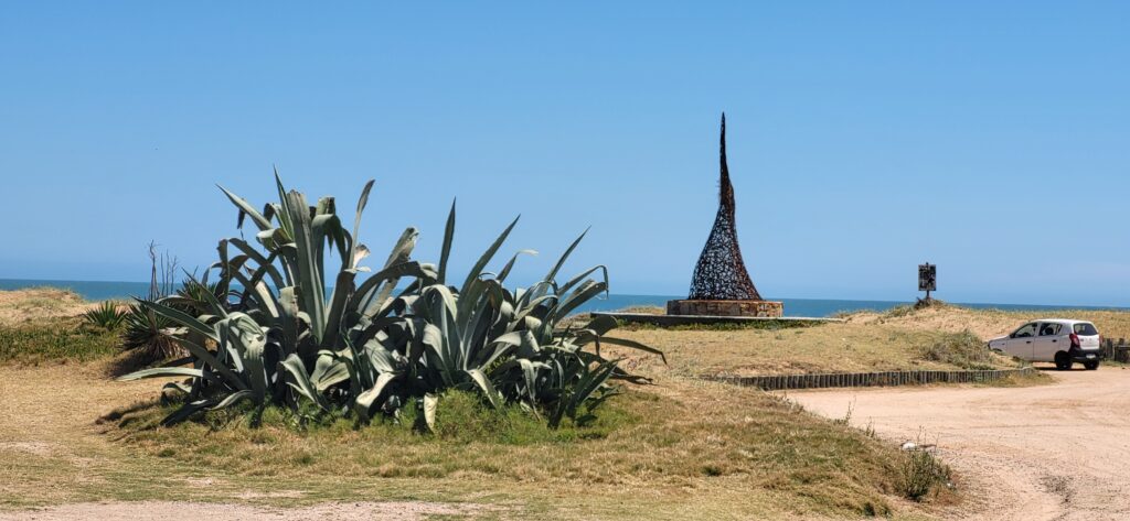 Heute ist es einmal wieder heiss. In der brütenden Sonne entfernen wir all die Zettel und Versiegelungsstreifen von unserem Camper. Später bringen wir den leeren Gaszylinder zum Auffüllen nach Piriapolis. Wir kaufen uns ein Sandwich und fahren weiter Richtung Punta del Este. Aber wenn bei Manfred der Magen befriedigt ist, beginnen die Lider zu fallen. Kurz vor der Ortschaft findet er einen Parkplatz, um ein Nickerchen zu machen. Punta del Este ist ein Ferienort. Es erinnert mich stark an Miami. Viele der Wohnungen sind im Winter leer. Trotzdem wird munter weiter gebaut.