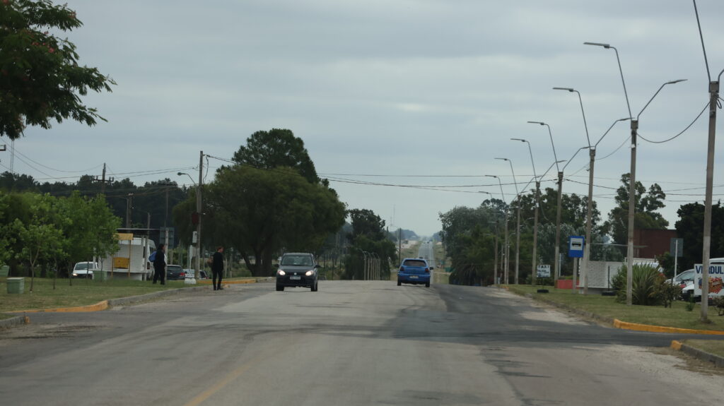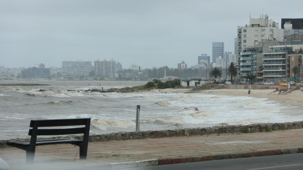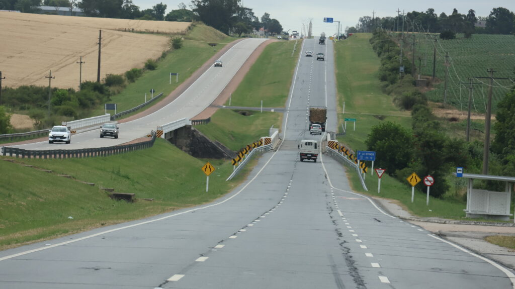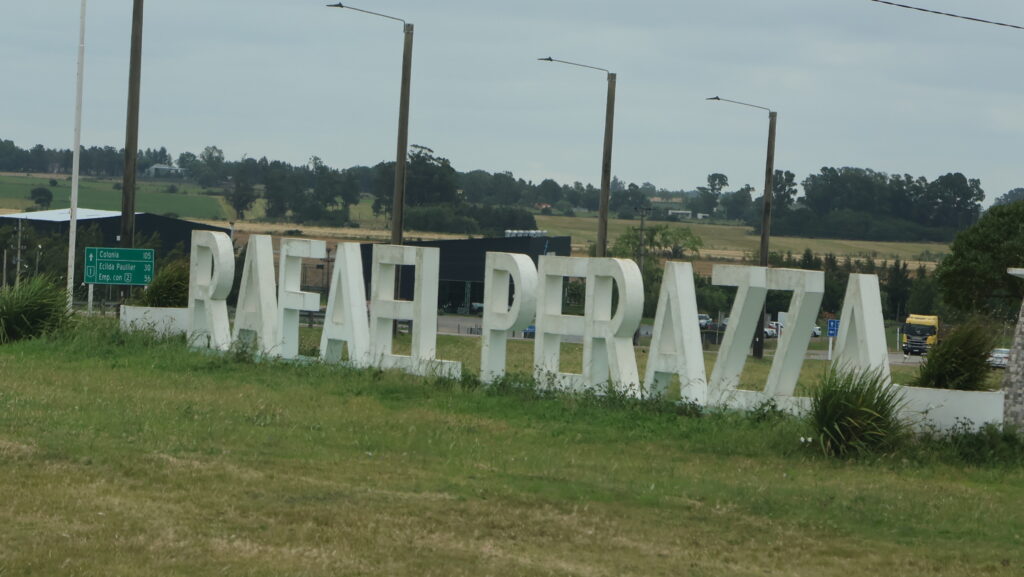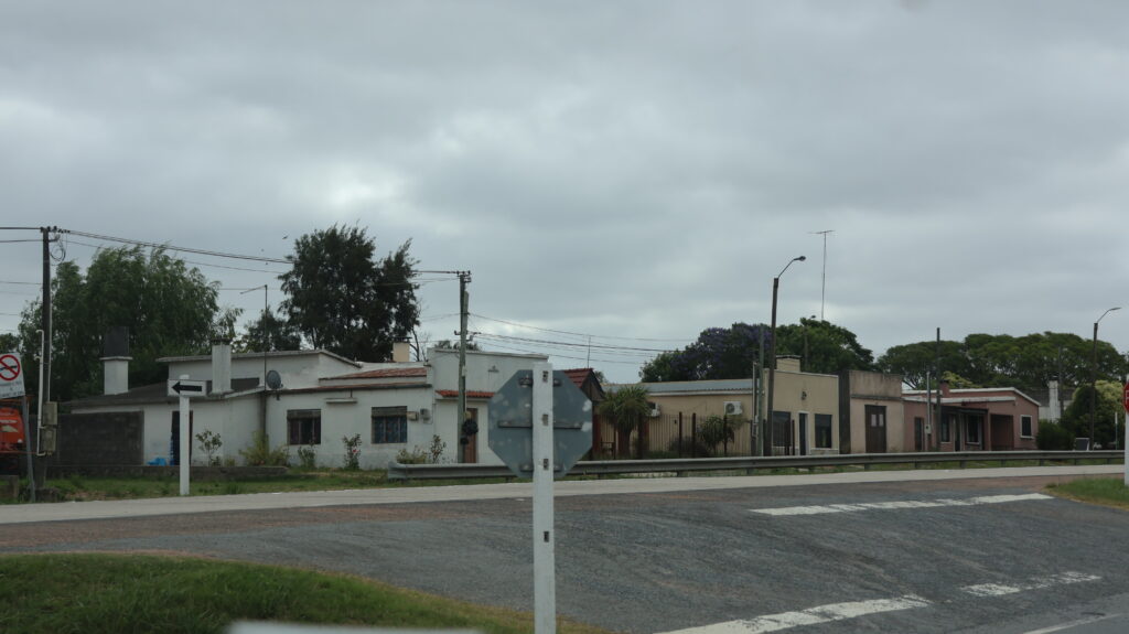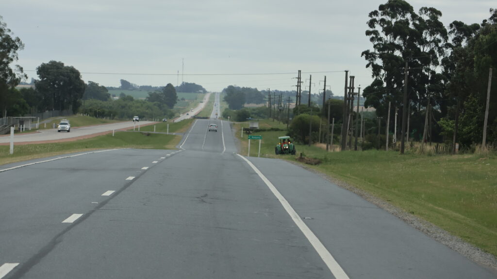 Zuerst wollen wir nach Montevideo fahren. Manfred will einen kleinen Kompressor kaufen, damit er die Räder aufpumpen kann. Auch ein bestimmtes Kabel für Star Link will er noch. Die Reise habe ich schon mal mit dem Bus gemacht. Teilweise sind die Häuser von der zweispurigen Schnellstrasse nur durch eine Servicestrasse getrennt. An der Servicestrasse stehen auch Geschäfte. Andere Dörfer stehen ein wenig von der Schnellstrasse weg. Sie sind dann an der Schnellstrasse gross angeschrieben. Ansonsten links und rechts Landwirtschaft. Manchmal, wenn wir über einen Bach fahren, wird die Strasse eng. Alle paar hundert Meter kann man über den Mittelstreifen umkehren. Je näher wir Montevideo kommen, umso mehr windet es.