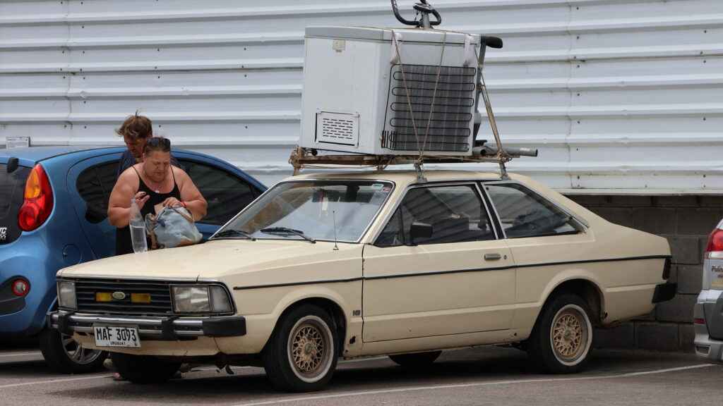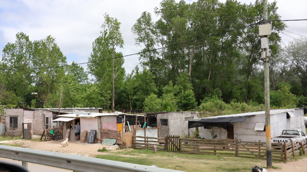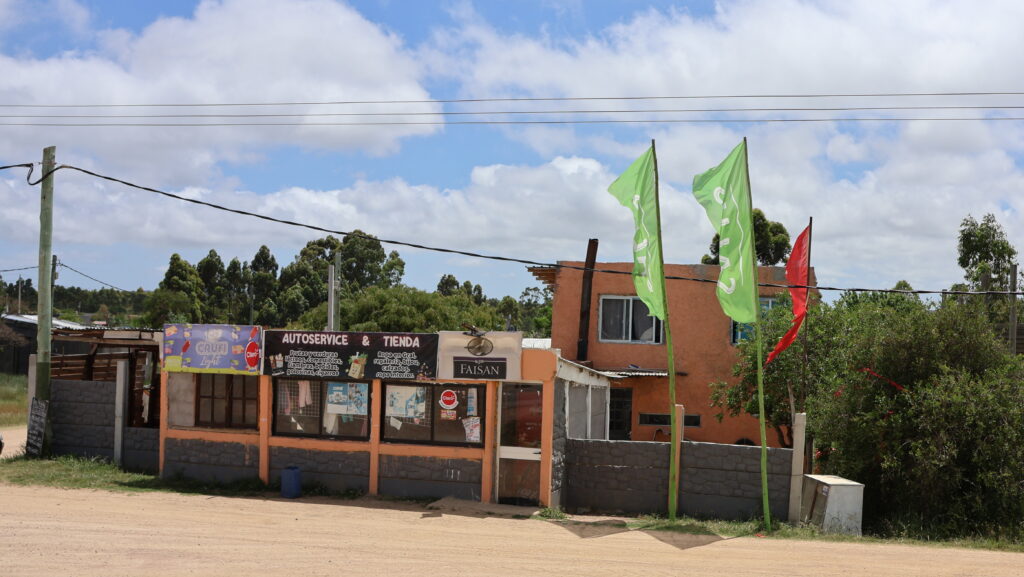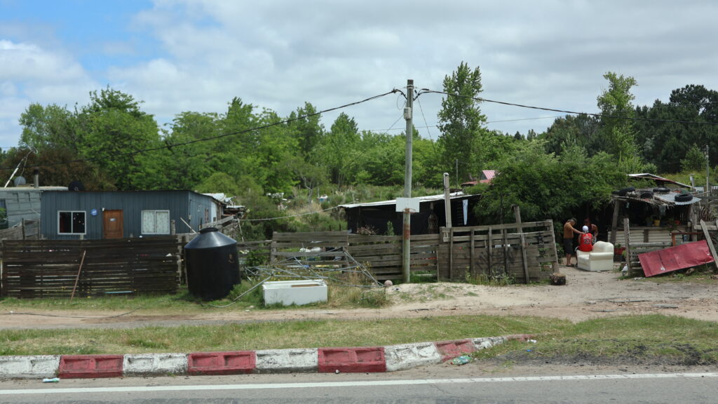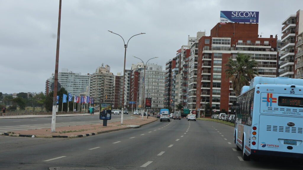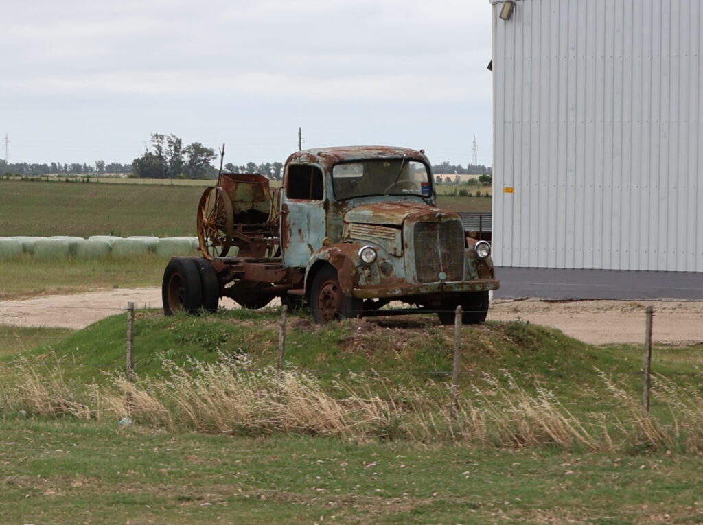 Zuerst wollen wir nach Montevideo fahren. Manfred will einen kleinen Kompressor kaufen, damit er die Räder aufpumpen kann. Auch ein bestimmtes Kabel für Star Link will er noch. Die Reise habe ich schon mal mit dem Bus gemacht. Teilweise sind die Häuser von der zweispurigen Schnellstrasse nur durch eine Servicestrasse getrennt. An der Servicestrasse stehen auch Geschäfte. Andere Dörfer stehen ein wenig von der Schnellstrasse weg. Sie sind dann an der Schnellstrasse gross angeschrieben. Ansonsten links und rechts Landwirtschaft. Manchmal, wenn wir über einen Bach fahren, wird die Strasse eng. Alle paar hundert Meter kann man über den Mittelstreifen umkehren. Je näher wir Montevideo kommen, umso mehr windet es.