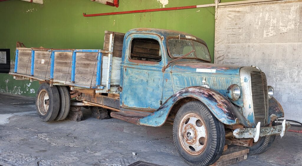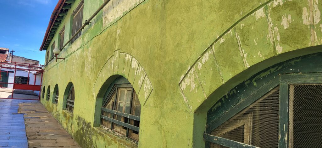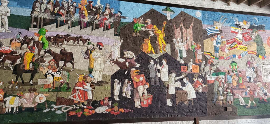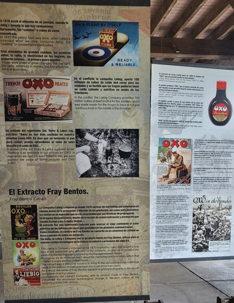 Justus von Liebig, ein deutscher Chemiker hat herausgefunden, wie man aus 30 Kilo Rindfleisch 1 Kilogramm «Rindsbouillon» macht. Mit deutschen und englischen Geldgebern hat er hier in Uruguay 1859 eine Fabrik eröffnet. Es gab in Uruguay viel Fleisch, das die wenigen Einwohner hier nicht brauchten. Von den Rindern brauchten sie das Leder. Durch die Fabrik lebten hier ca. 30’000 Menschen. Es wurde rund um die Uhr gearbeitet. Pro Schicht waren zwischen 3’000 und 5’000 Menschen im Einsatz. 3’000 Rinder wurden pro Tag geschlachtet. Die Tiere wurden angeliefert, auf Krankheiten untersucht und dann durch ein Bad getrieben. Danach mussten sie über eine Rampe nach oben ins Schlachthaus laufen. Dort stand ein Mann, der das ankommende Rind mit einem Hammer bewusstlos schlug. Die Kehle wurde aufgeschlitzt und das Tier zum Ausbluten aufgehängt. Jeder Arbeiter im Schlachthaus hatte immer die gleichen Arbeiten zu erledigen. Aufschlitzen, Ausnehmen, Haut abziehen und Zerteilen, wurde wie am Fliessband erledigt.