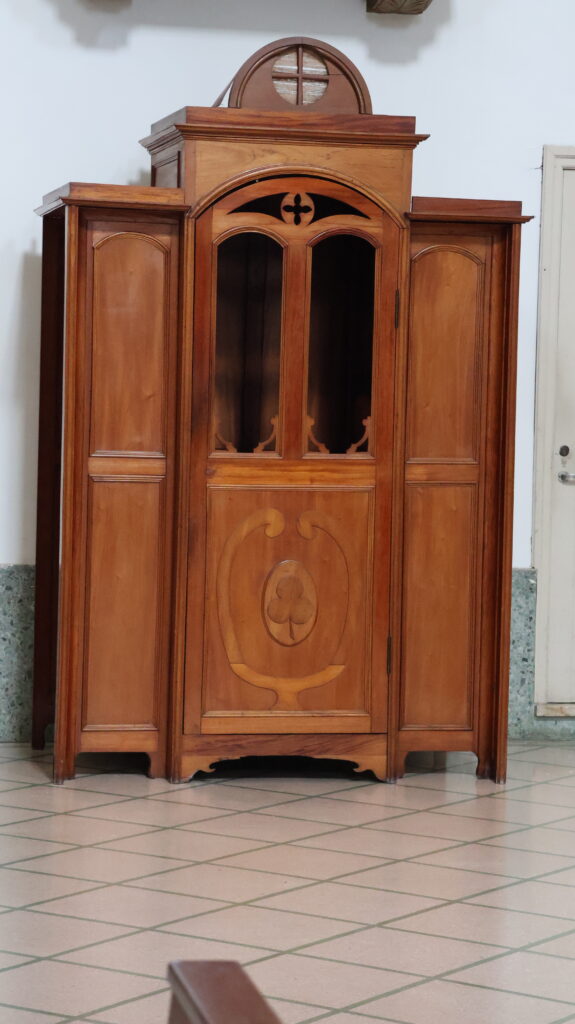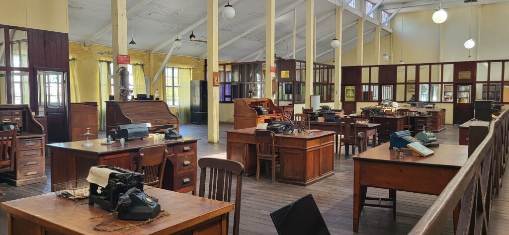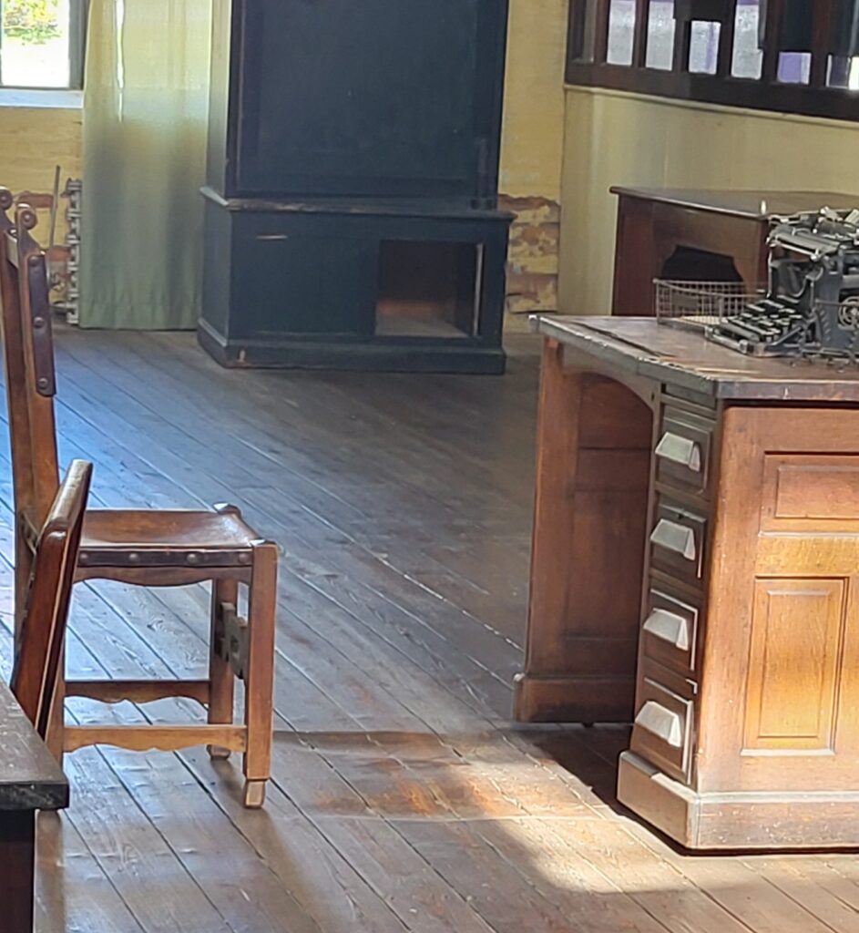 Natürlich gab es auch Büros. Ein über 2 Meter grosser Mann habe dort 40 Jahrelang gearbeitet. Er hatte viele Probleme mit seinen langen Beinen und musste sie viel bewegen. Da es aber nur 2 Mal erlaubt war pro Arbeitszeit, sich zu erheben, ( Ein mal Pipi, ein mal essen!) hat er immer unter seinem Pult die Füsse bewegt. Daher gibt es dort jetzt 2 längliche Vertiefungen.