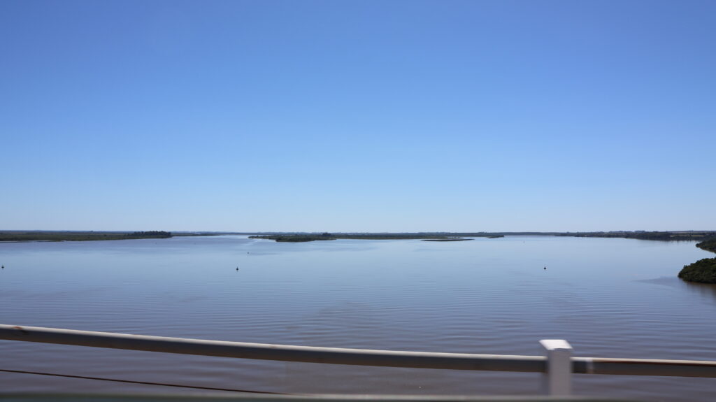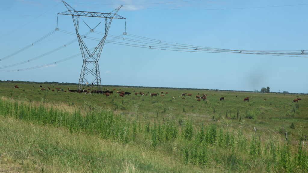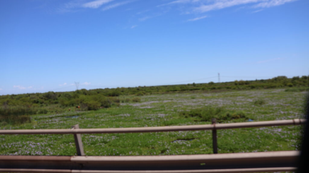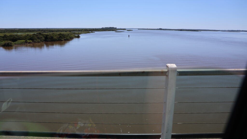 Wir überqueren den Rio Uruguay. Ein sehr breiter Fluss. Die Strassen sind schlechter als in Uruguay und es hat auch viel Unrat auf der Seite. In den Masten der Überlandstromleitungen haben Vögel Nester gebaut. Wir sehen Schafe und Rinderherden. Die kleinen Flüsse sind meist mit Wasserhyazinthen bedeckt. Wasser ist keines zu sehen.