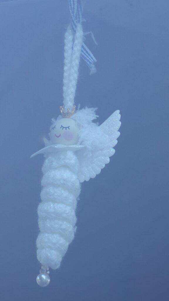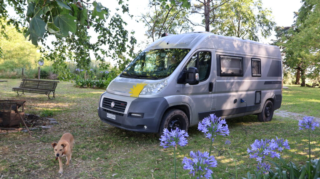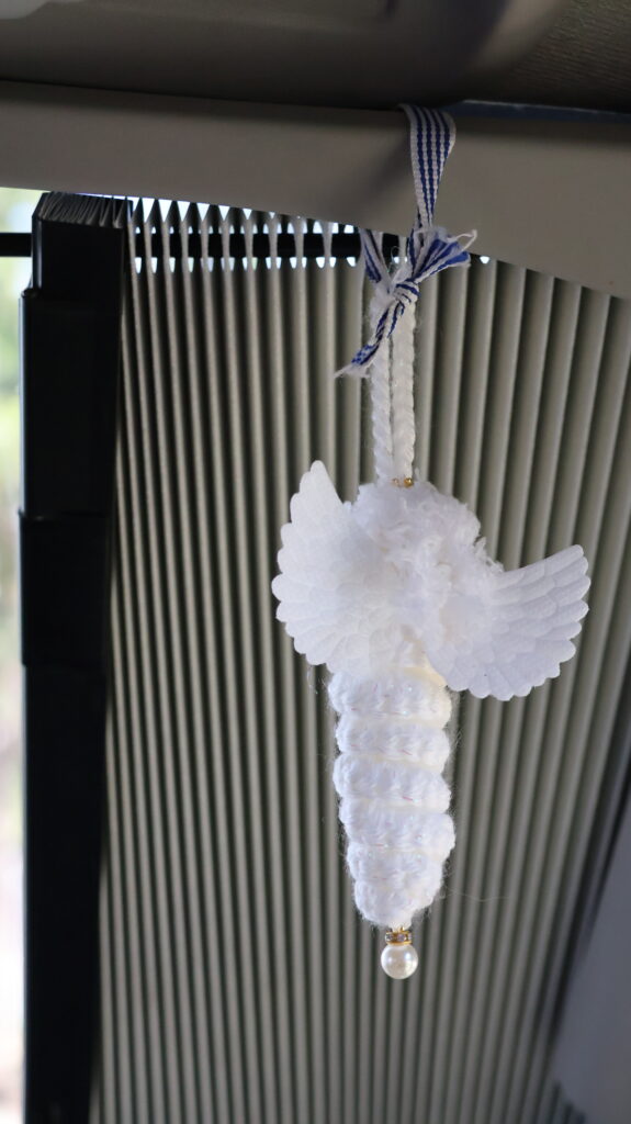 Von einem Arbeiter auf dem Campingplatz habe ich ein argentinisches Freundschaftsband bekommen. Mit dem habe ich unseren Schutzengel aufhängen können. Meine Schwester Iris hat uns den gehäkelt. Jetzt kann er auf die Strasse schauen und muss nicht mehr in der Schublade liegen.