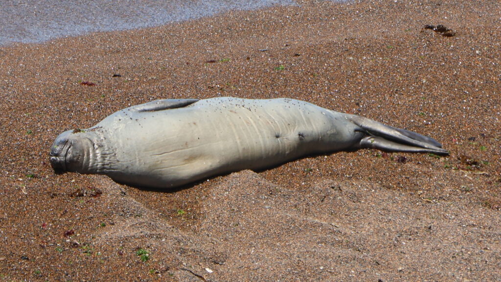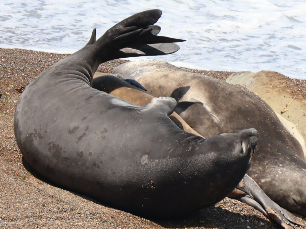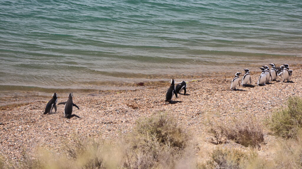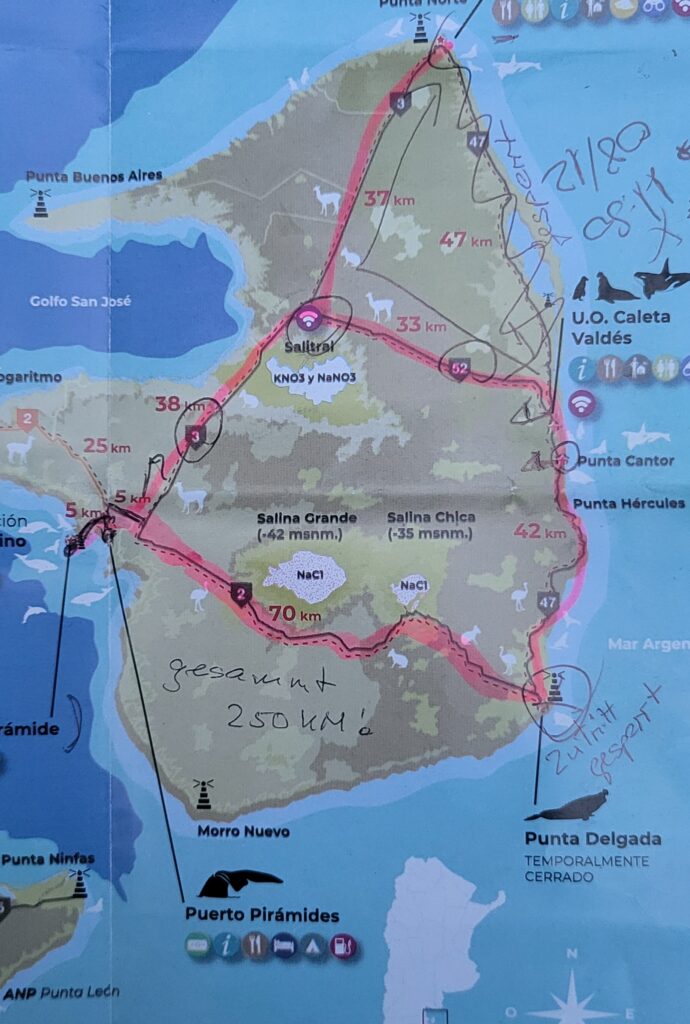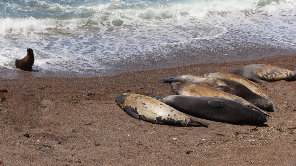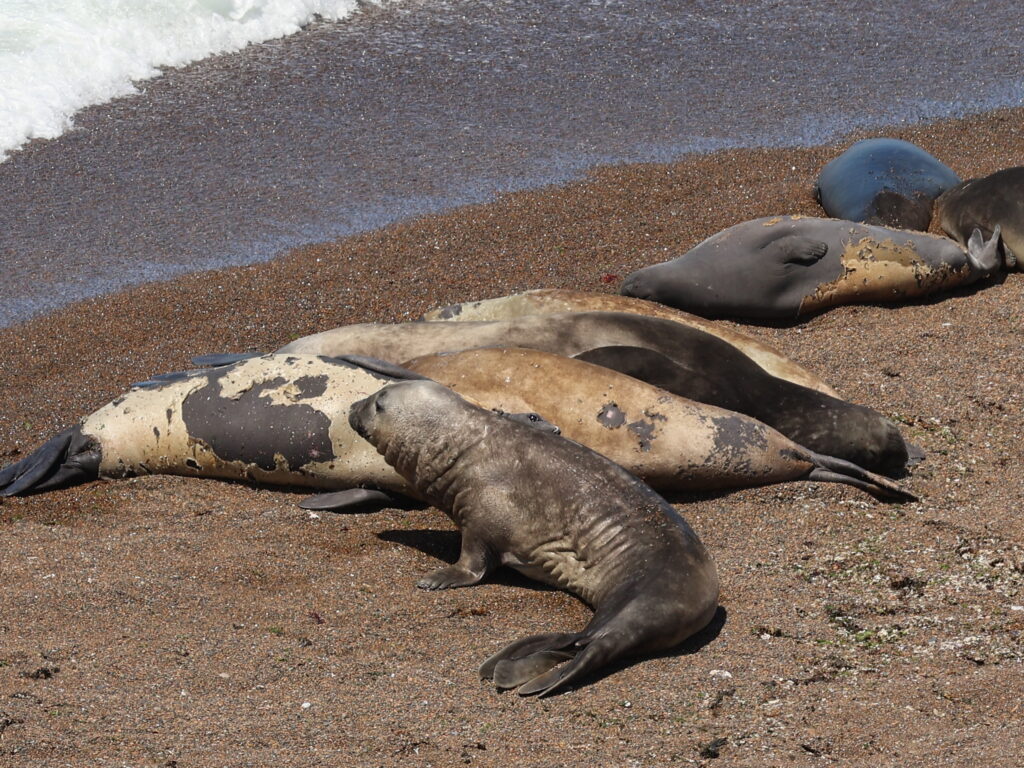 An einem Aussichtspunkt können wir die Magellan-Pinguine von Nahem sehen. Sie sind nicht scheu. Ganz vorne am Punta Norte liegen weibliche Seeelefanten und ein paar Männchen. Seelöwenweibchen sehen wir nur im Meer und weit weg. Man hat uns gesagt in Punta Norte gäbe es ein Restaurant, das ist aber nur so eine Art Kiosk. Wir sind froh wieder auf dem Campingplatz zu sein. Wir haben auf den 250 Kilometern gehörig Staub geschluckt und freuen uns auf eine Dusche.