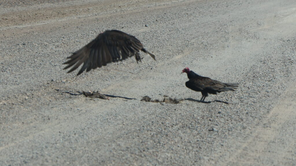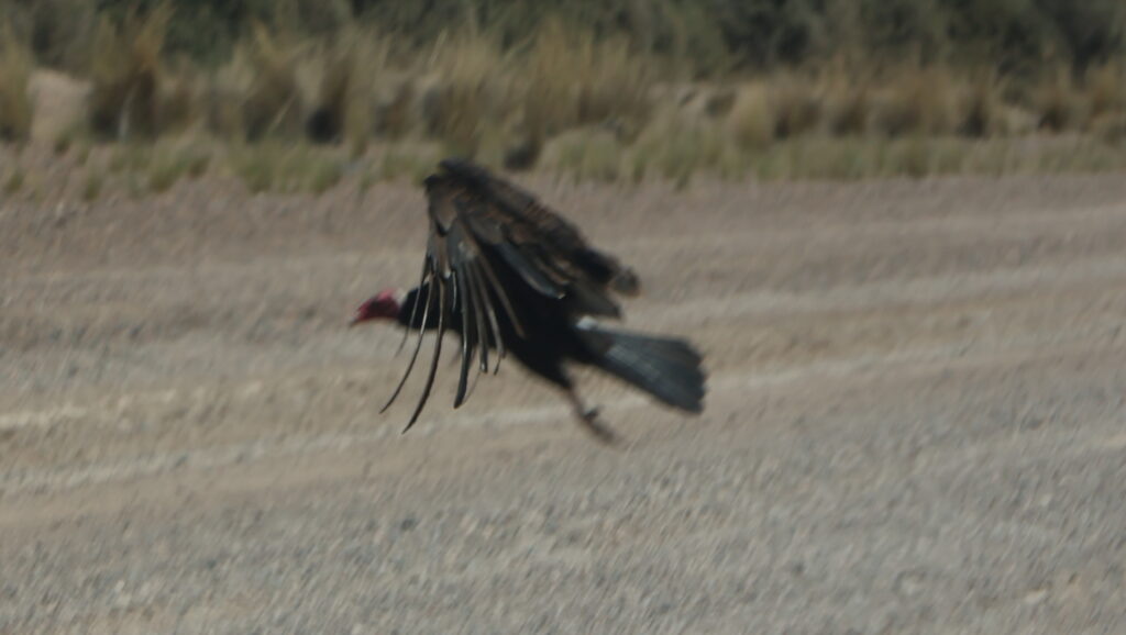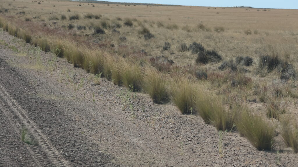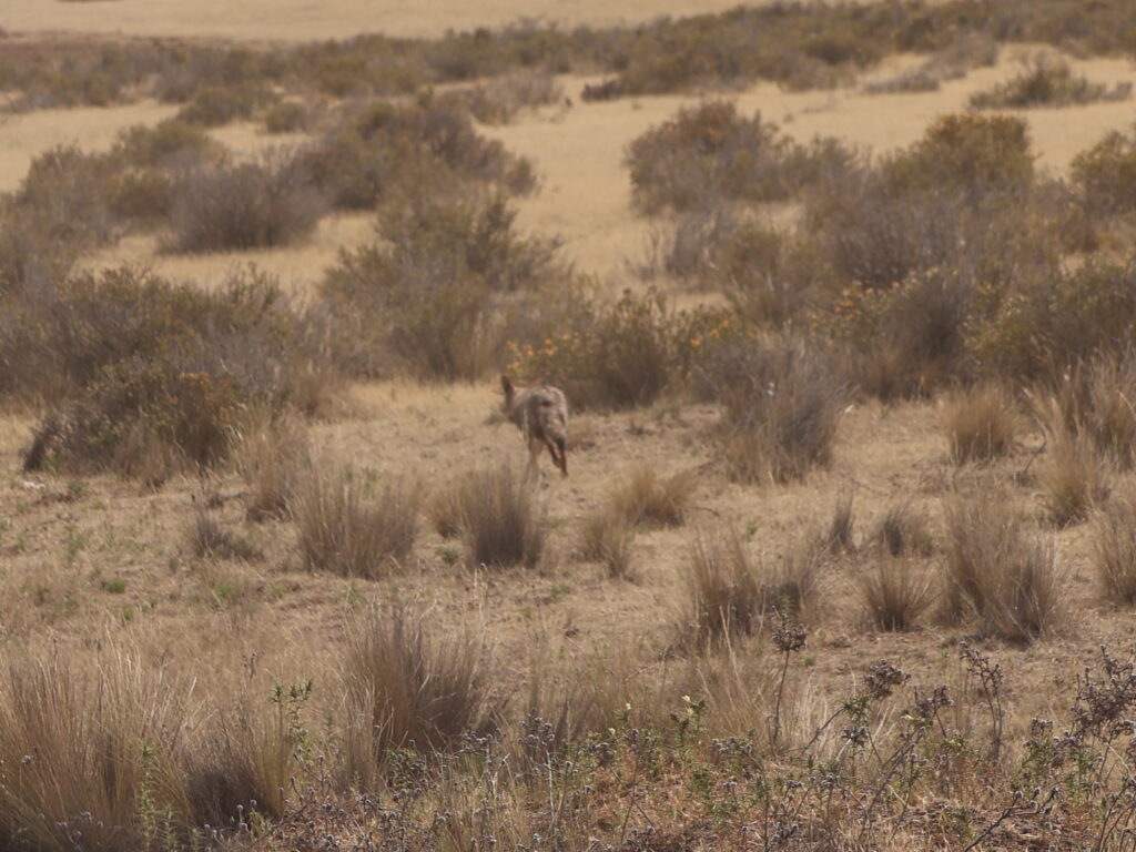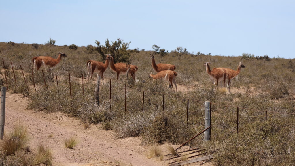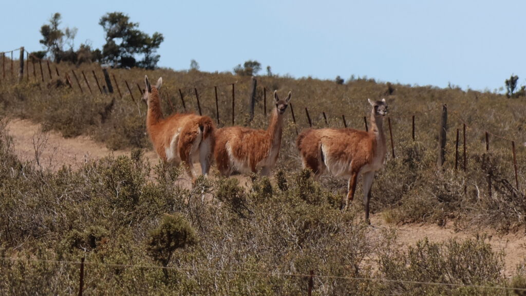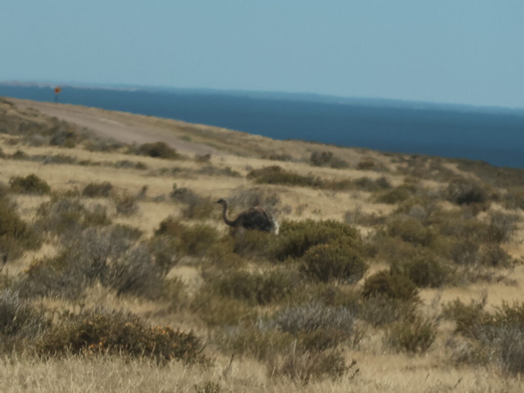 Vorerst sehen wir nur Schafe. Es gibt einige Schaffarmen im Park. Der erste Aussichtspunkt ist geschlossen. Die Weiterfahrt dem Meer entlang ist gesperrt!Trotzdem sehen wir Guanakos und später noch Nandus. Wir erhaschen auch mal einen Blick aufs Meer. Ein Fuchs rennt über die Strasse und versteckt sich sogleich hinter den Büschen.