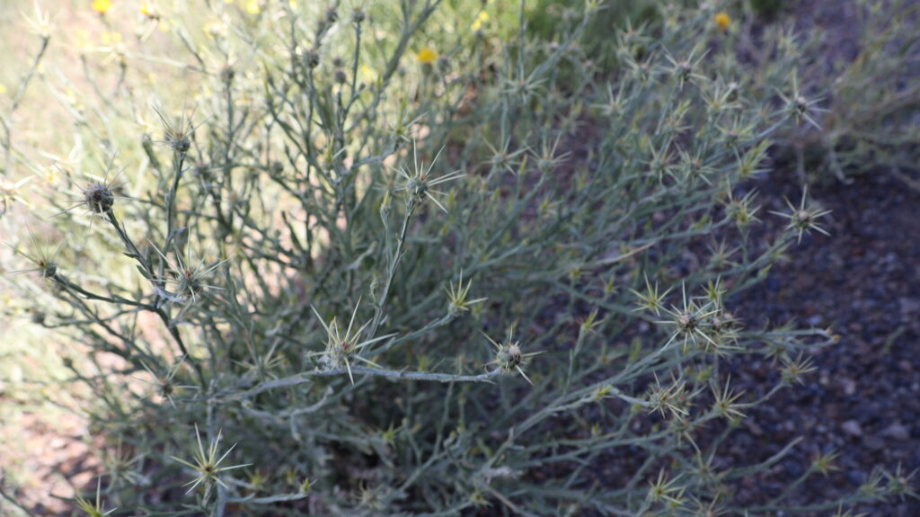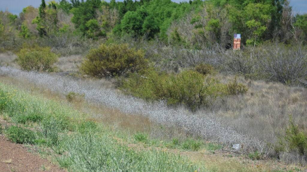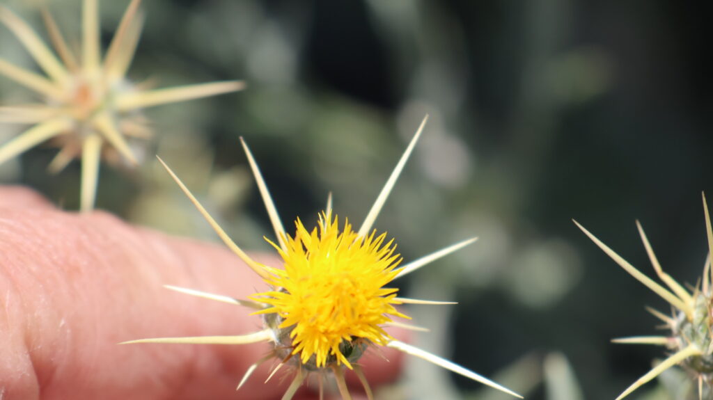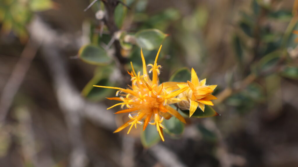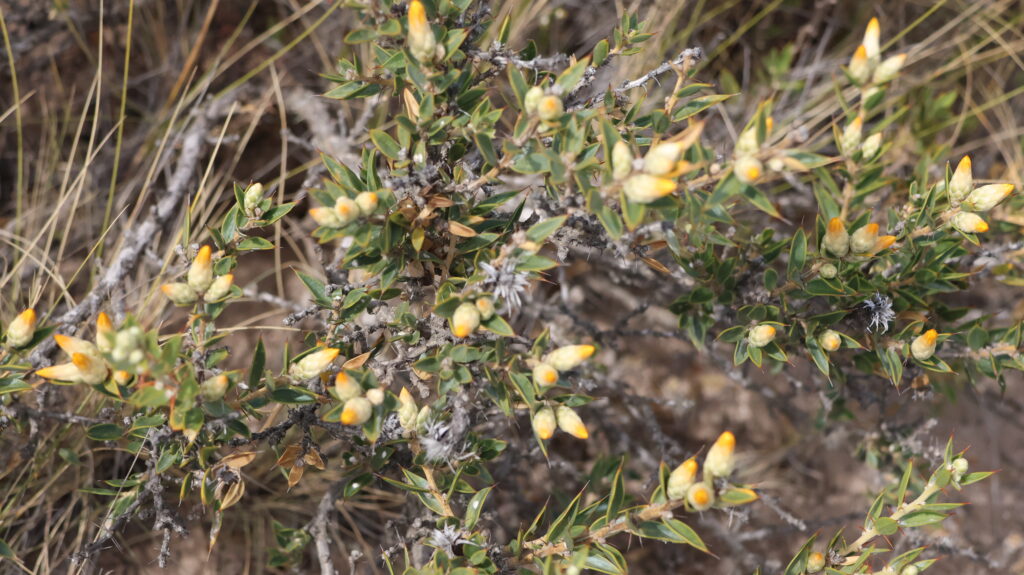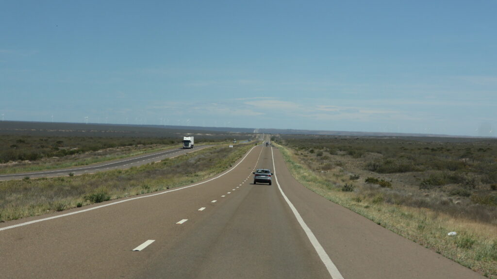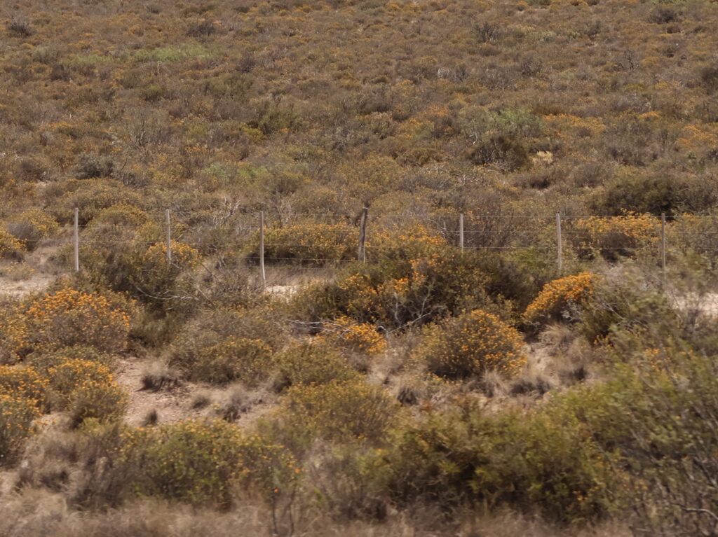 Auf der Weiterfahrt Richtung Trelew habe ich auf der Seite bläuliche Blumen wahrgenommen. Auch Manfred meint sie schimmern bläulich. Als ich sie dann aber von Nahem seh, sind sie weiss. Ich weiss nicht, sind es Blumen oder Samen. Sie sehen aus wie eine Miniatur vom Wollgras. Daneben blüht eine stachelige, gelbe Schönheit. Vorgestern habe ich bei einem Busch, der hier viel vorkommt, zahlreiche Knospen fotografiert. Einige waren schon geöffnet und zeigten eine zierliche gelbe Blüte. Heute sind die meisten Büsche erblüht und die Gegend schimmert gelblich. Ansonsten hat sich landschaftlich nicht viel verändert. Es kommt mir eher noch karger vor.