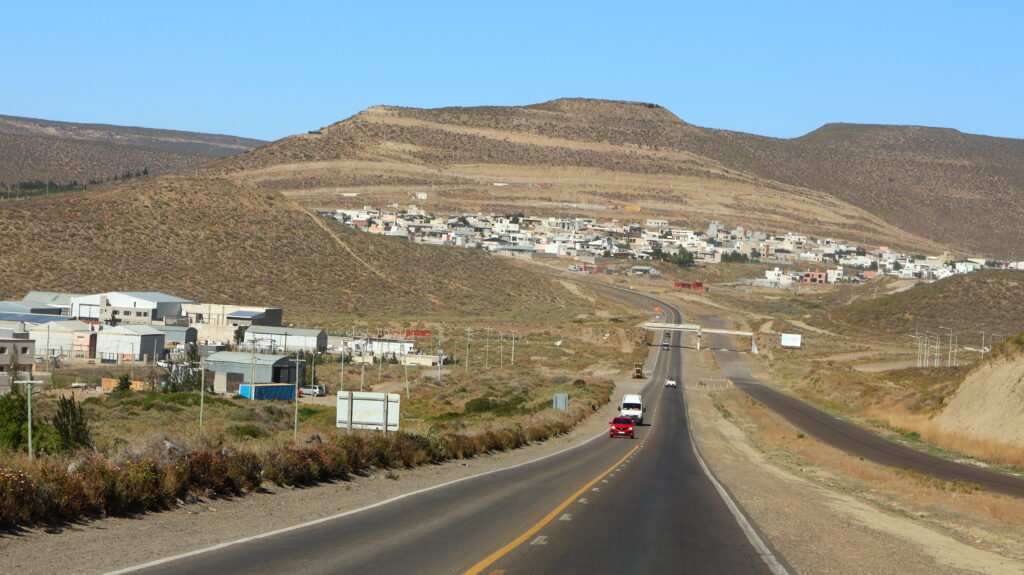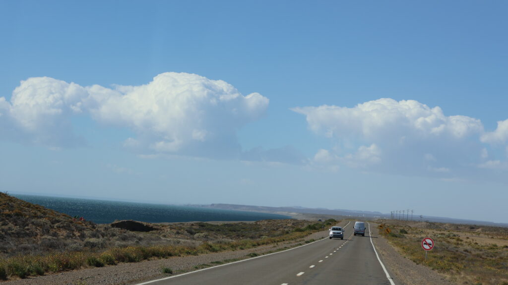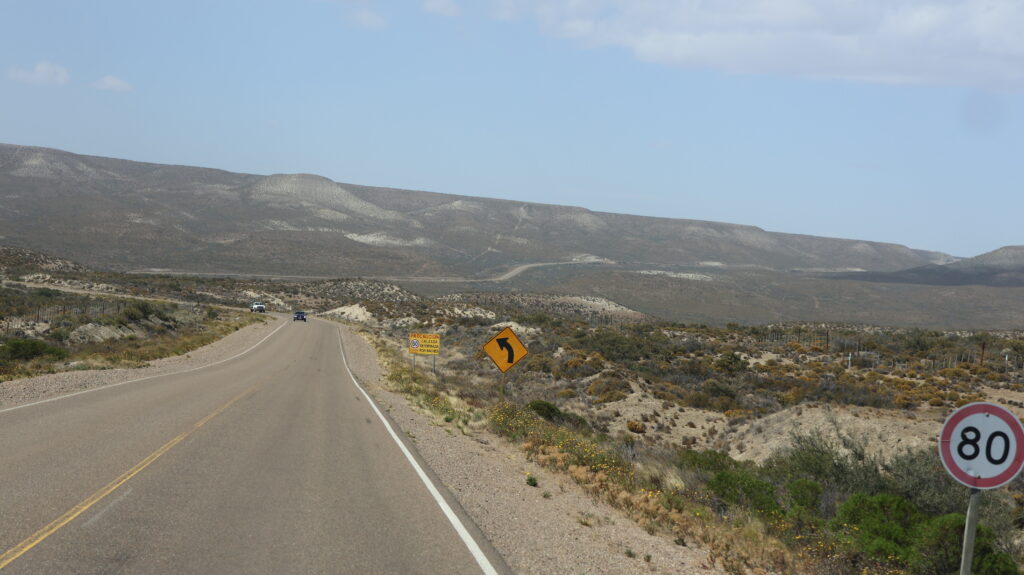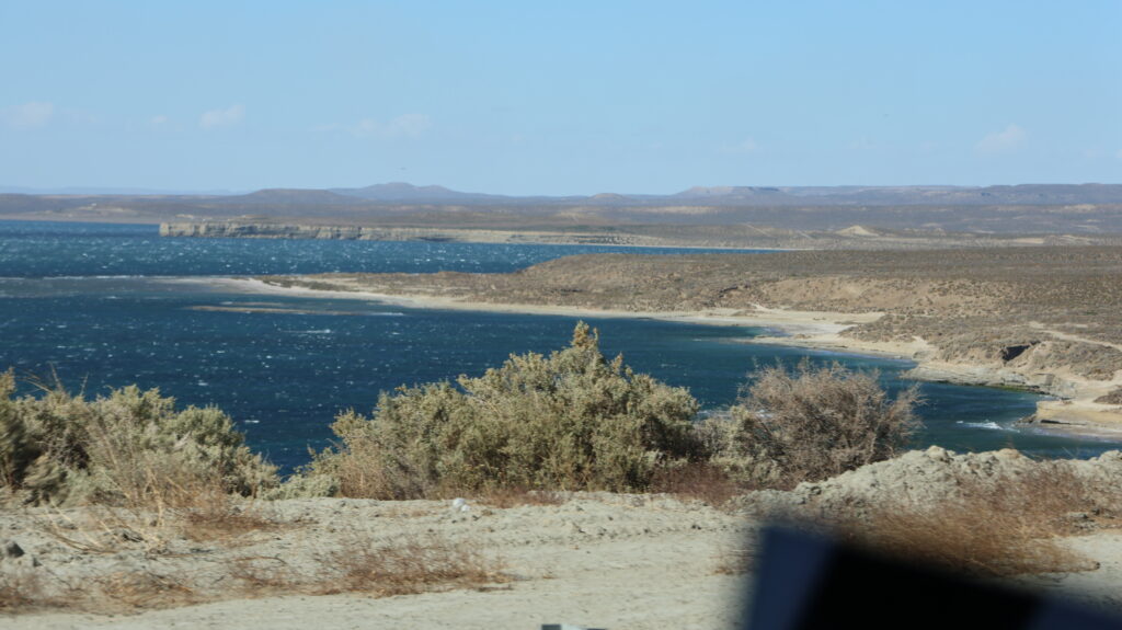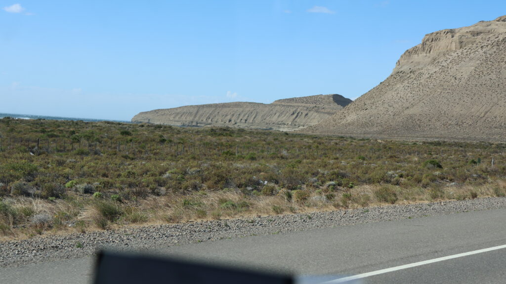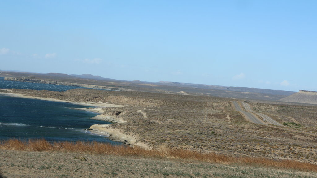 Es ist kühl geworden in der Nacht. Da der Wind am Morgen nur säuselte, konnte Manfred den Storen mit einem neuen Spannset befestigen. Kaum fertig, legte der Wind sofort wieder zu. Die ersten paar Kilometer, bis Caleta Olivia sind noch abwechslungsreich, da die Strasse am Meer entlangführt und etliche Kurven enthält.