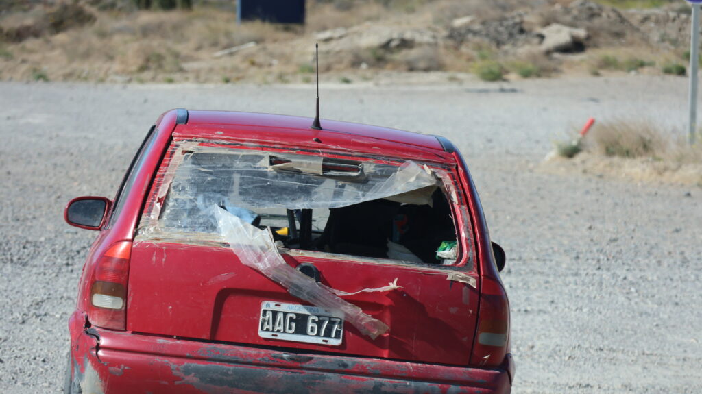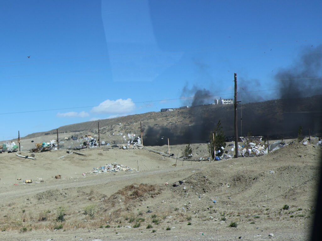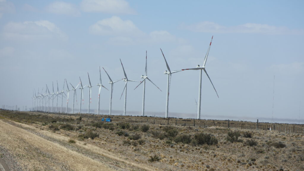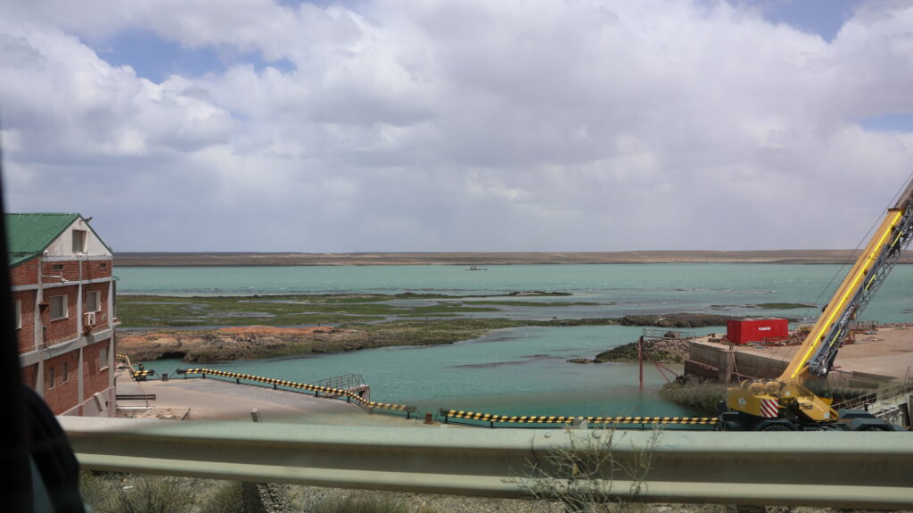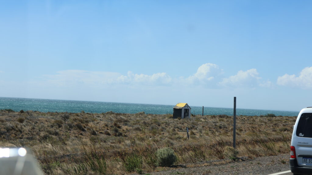 Es ist kühl geworden in der Nacht. Da der Wind am Morgen nur säuselte, konnte Manfred den Storen mit einem neuen Spannset befestigen. Kaum fertig, legte der Wind sofort wieder zu. Die ersten paar Kilometer, bis Caleta Olivia sind noch abwechslungsreich, da die Strasse am Meer entlangführt und etliche Kurven enthält.