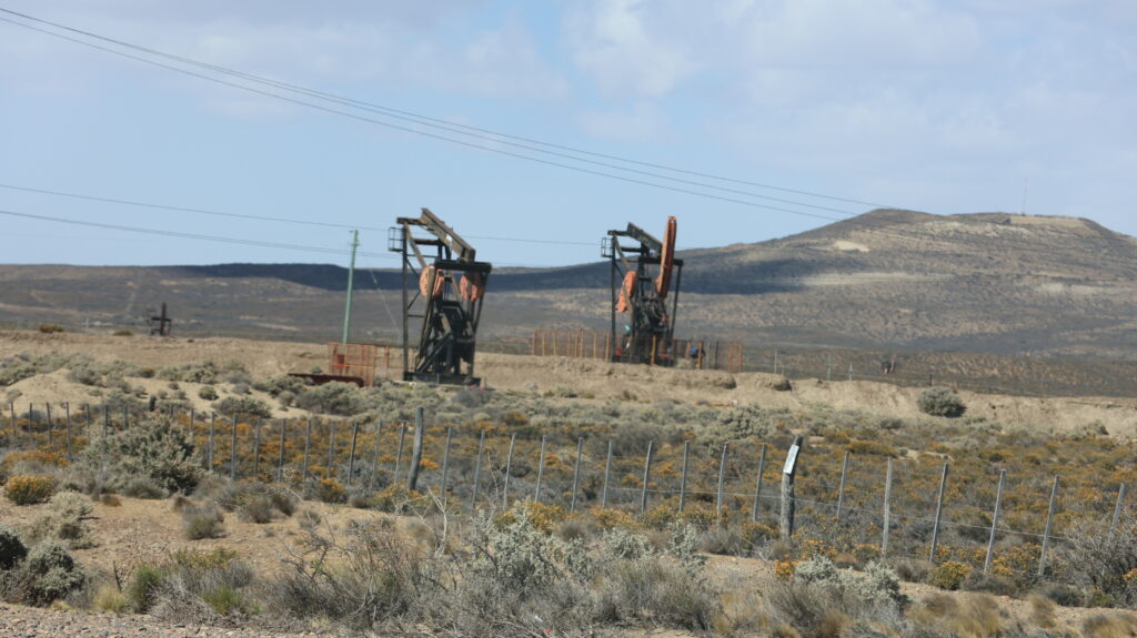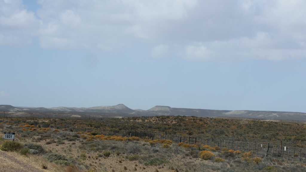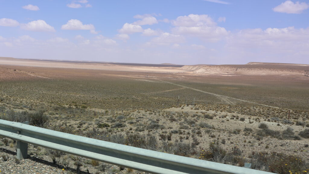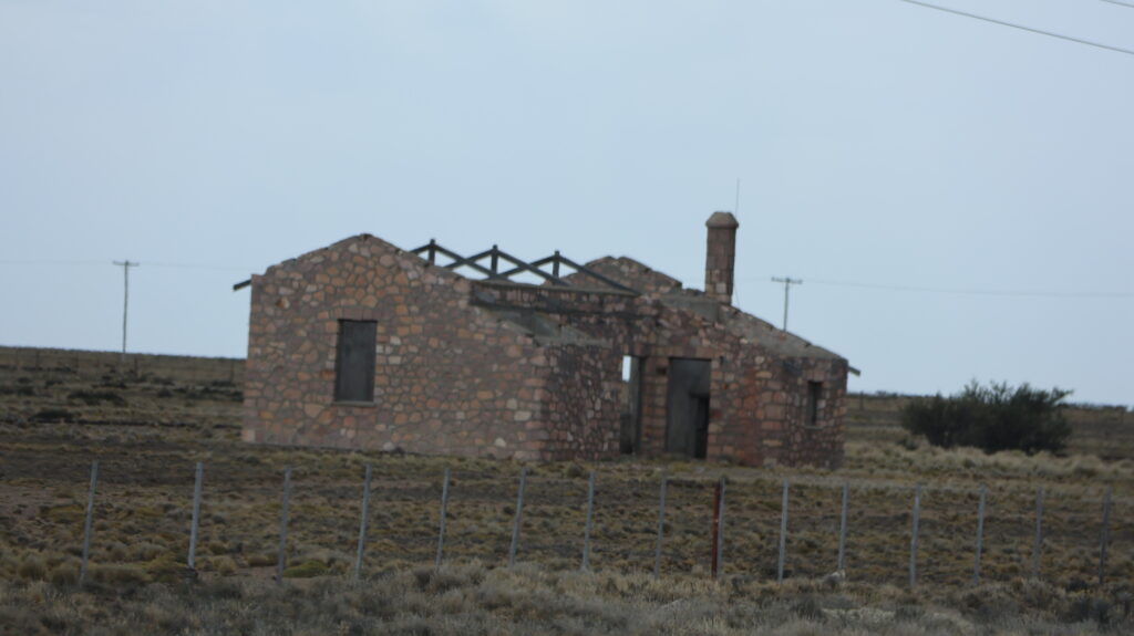 Danach wird es aber wieder langweilig. Nach der Abzweigung von der 3 Richtung Puerto Deseado, ist es wieder flach wie eine Flunder und die Strasse schnurgerade. Auf der einen Seite sieht man noch die alten Geleise. Es gab mal eine Bahnstrecke hier, die in den 70iger Jahren geschlossen wurde. Ein paar Ruinen an der Strecke waren wohl mal Bahnhöfe.