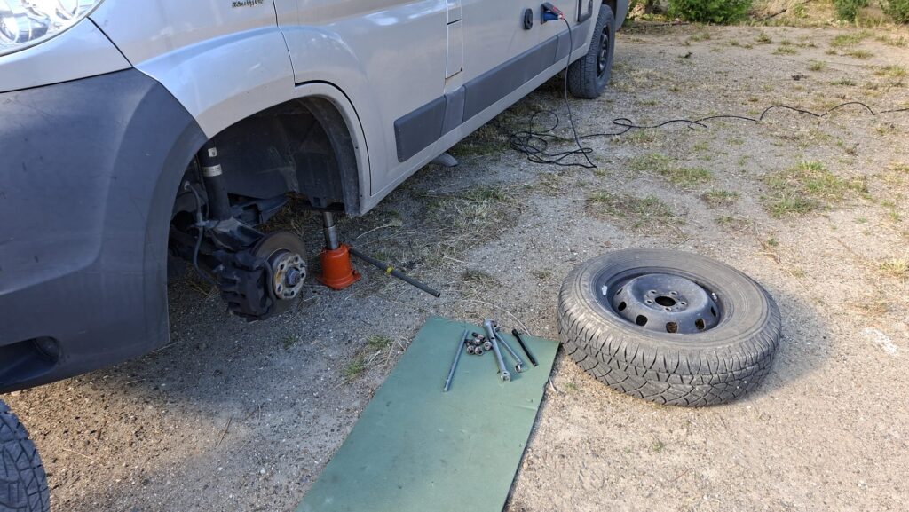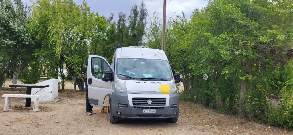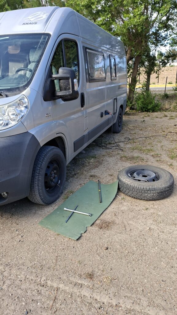 Eigentlich wollten wir heute weiterreisen, aber es kam etwas dazwischen. Manfred hat heute Morgen das linke Rad ausgewechselt. Er hat das zweite Reserverad montiert, da beide Reserveräder neue Reifen draufhaben. So sind beide vorderen Räder wieder gleich bereift. Dabei hat er festgestellt, dass auch im linken Reifen eine Schraube steckt. Es ist dort minim Luft entwichen. Das heisst, wir haben zwei nicht brauchbare Reserveräder. So können wir nicht weiterfahren. Wir müssen bis morgen Montag warten, um die Räder zum Flicken zu bringen. Wir können also den Sonntag geniessen.