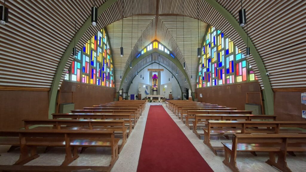 Wir laufen der Hauptstrasse entlang und es ist menschenleer. In einem Haus findet eine Weihnachtsausstellung statt. Meist Frauen stellen ihr selbstgebasteltes zum Verkauf aus. Wir kommen an der Kirche vorbei. Sie ist abgeschlossen. Durch die Glastüre können wir das Innere fotografieren.