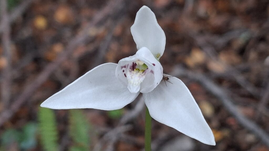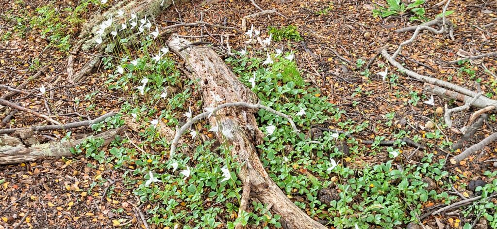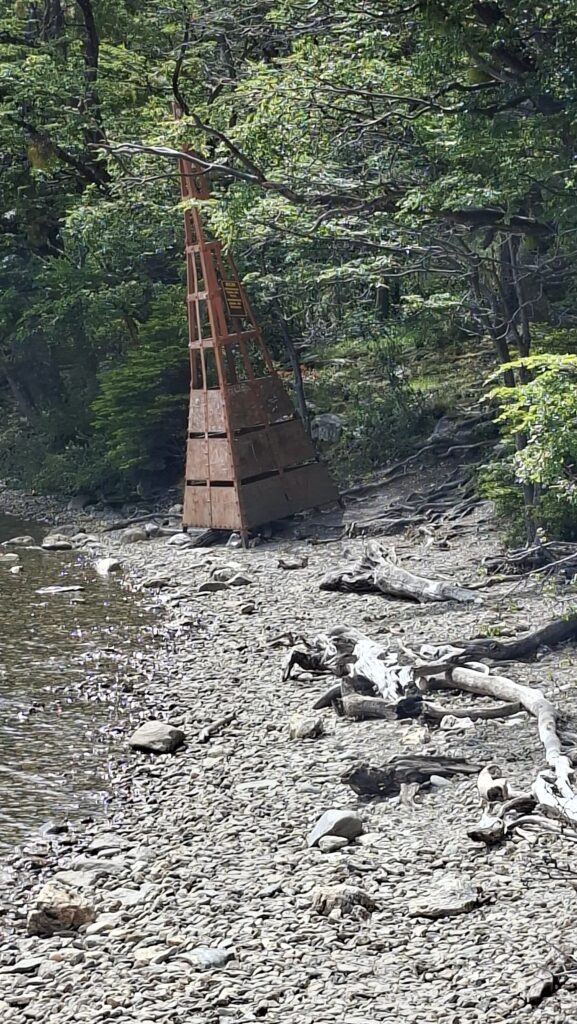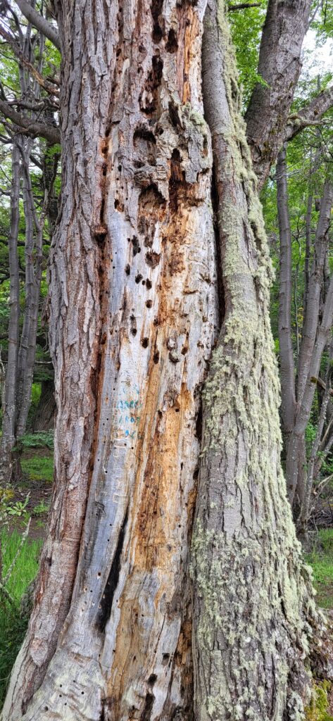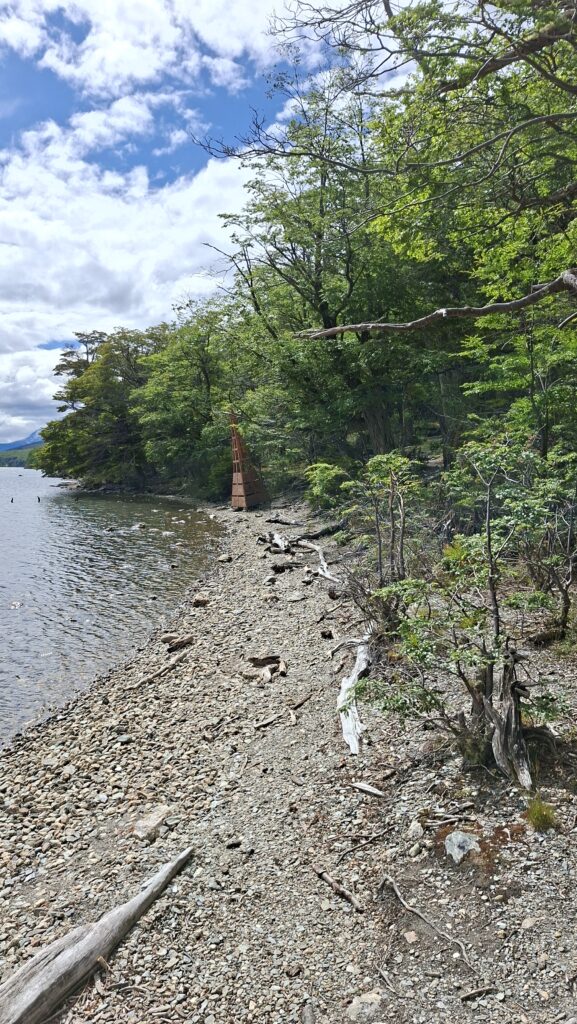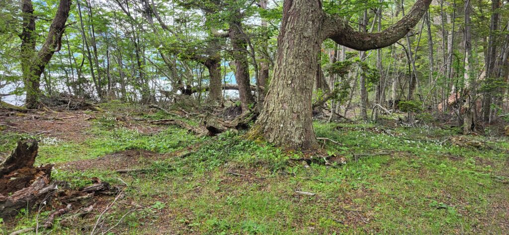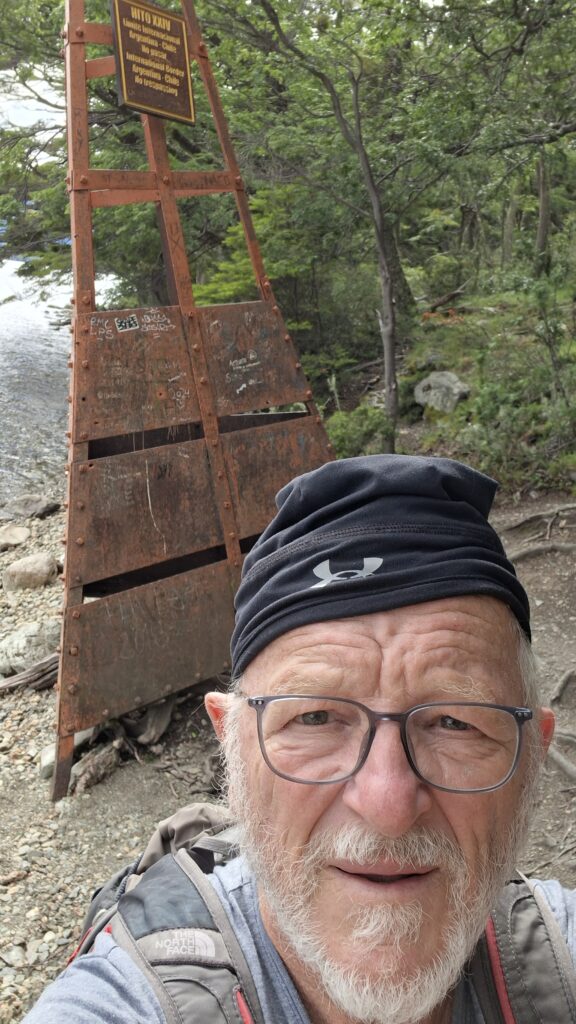 Trotzdem nehmen wir die Wanderung entlang dem Acigami Lake in Angriff. Zuerst schöner, flacher Wanderweg. Danach geht’s auf und ab über Stock und Stein. Viele Baumwurzeln müssen beachtet werden. Auch im Wald gibt es Blumen. Die Weissen, die aussehen wir Orchideen, wachsen so zahlreich, dass es aussieht wie bei uns, wenn im Frühling das Buschwindröschen blüht. Wir schaffen es bis zur Grenze von Chile. Ich bin K.O.