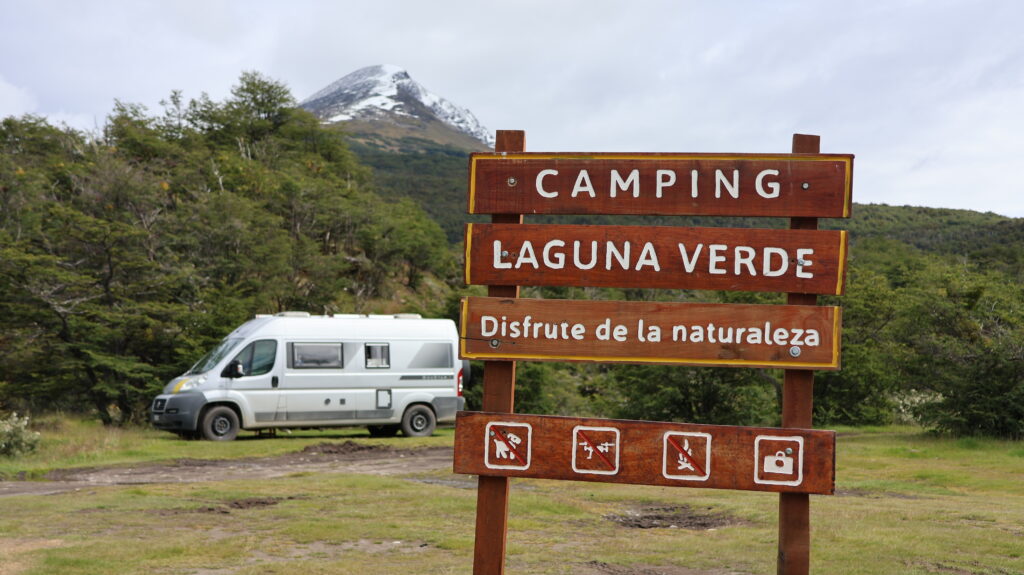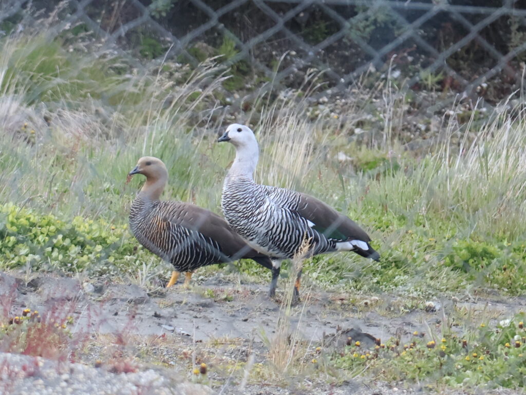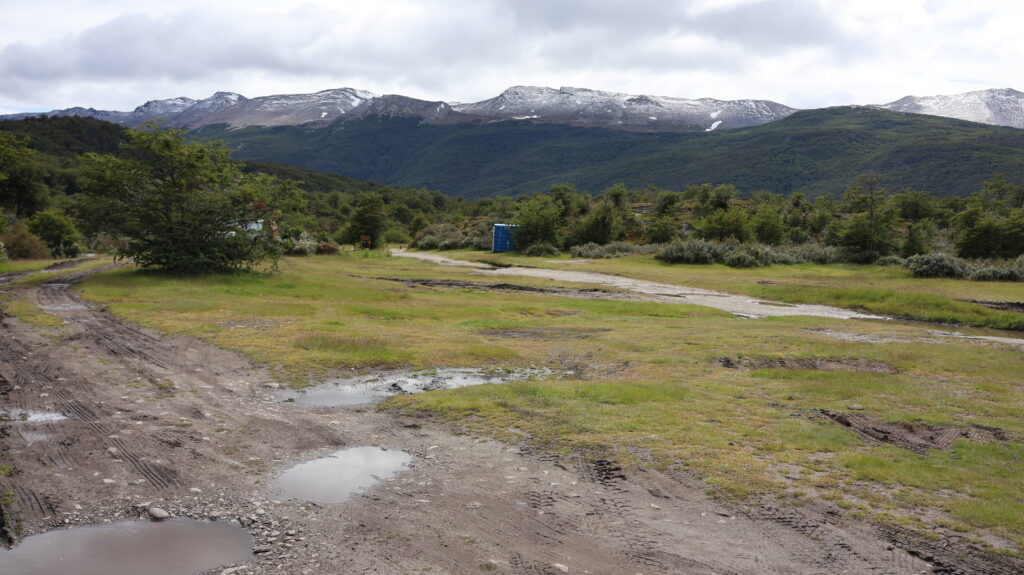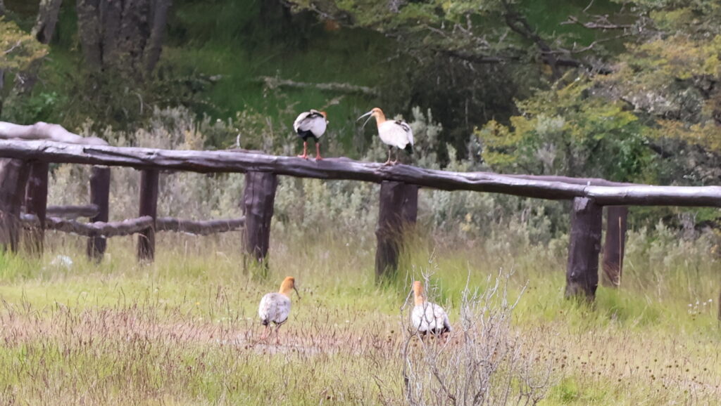 Wegen des Regens ist da ein bisschen eine Sauerei auf dem Campingplatz. Man muss aufpassen, wo man durchfahrt. Wir bekommen Besuch von Black Faced Ibis und Schmetterlingen. Auch die Magellangans läuft hier herum. Das Weibchen sieht ganz anders aus als das Männchen. Sie trägt auch orange Strümpfe, der Herr schwarze. Der Karakara macht Manfred das Leben schwer beim Grillen. Er will alles wegzerren und lässt sich nicht verscheuchen.