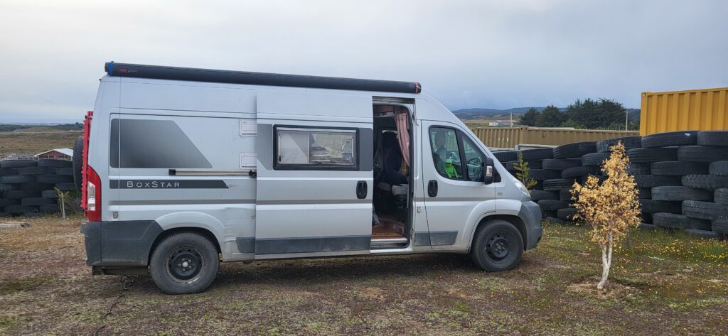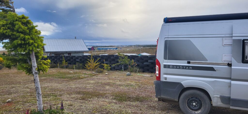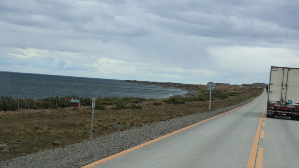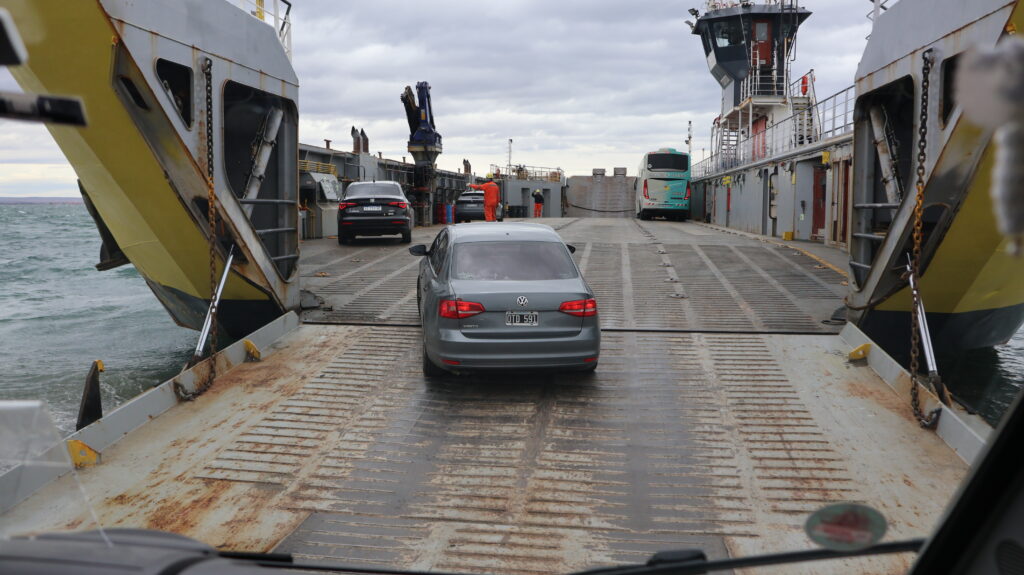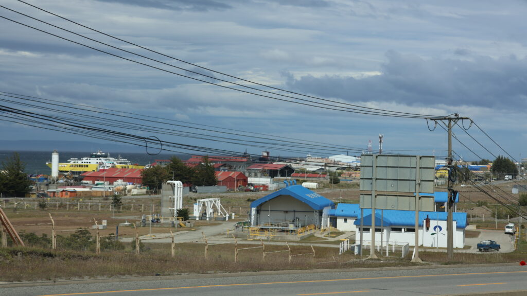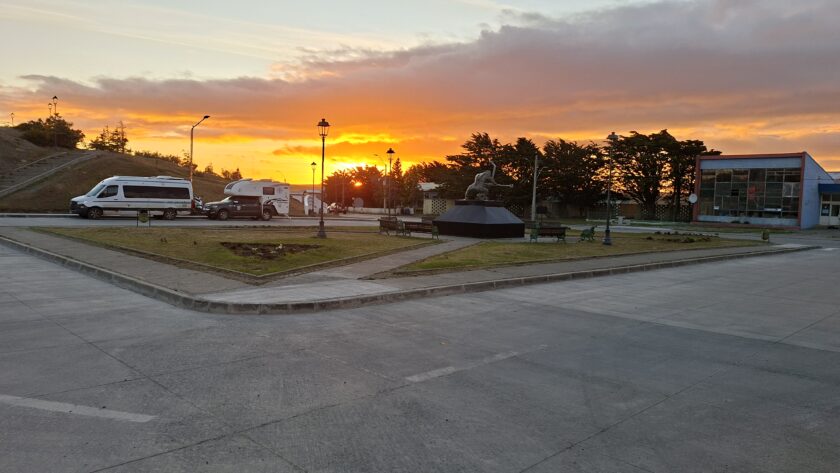 Bis am Morgen sind 4 Camper auf dem Parkplatz gestanden. Manfred hat den Sonnenaufgang erwischt, als ich noch in den Federn liege. Wir sind nicht die Letzten, die aufbrechen. Unser Ziel ist erst mal die Fähre über die Magellanstrasse. Wir verpassen eine Fähre knapp.
