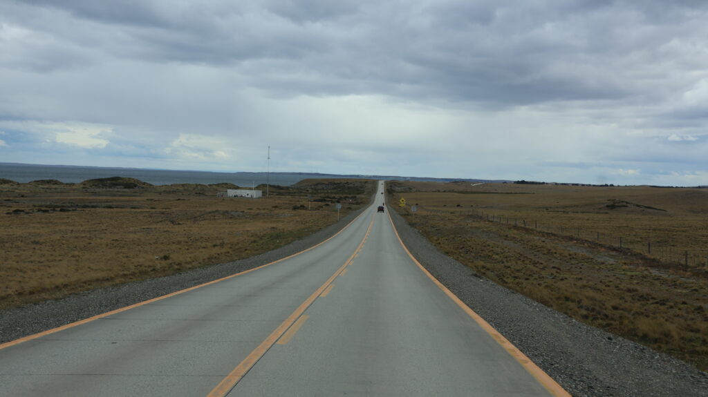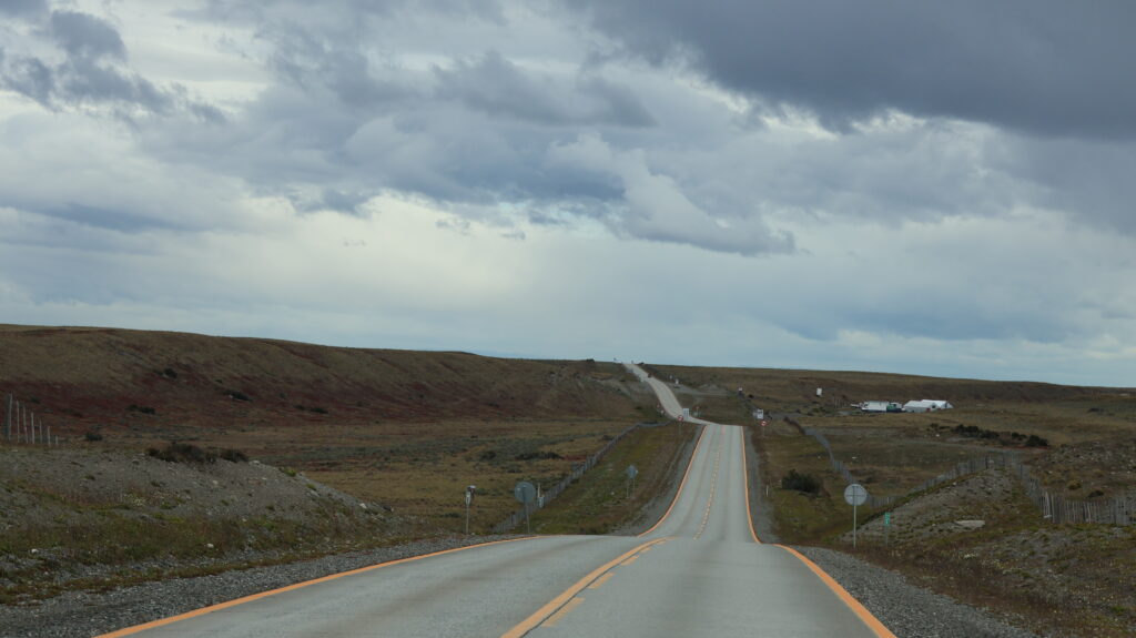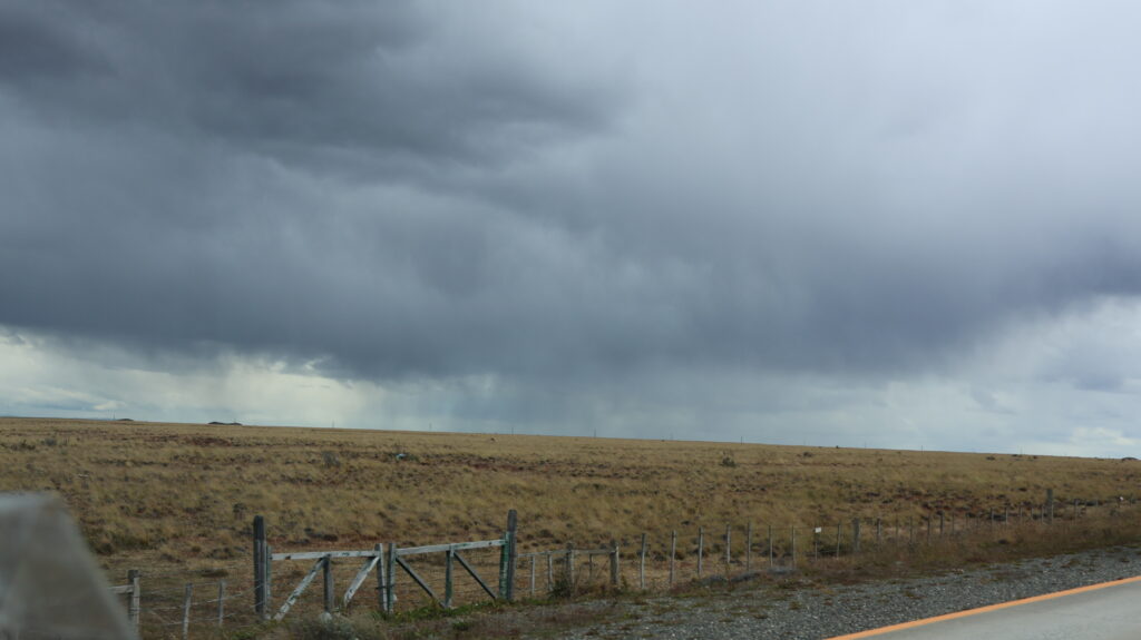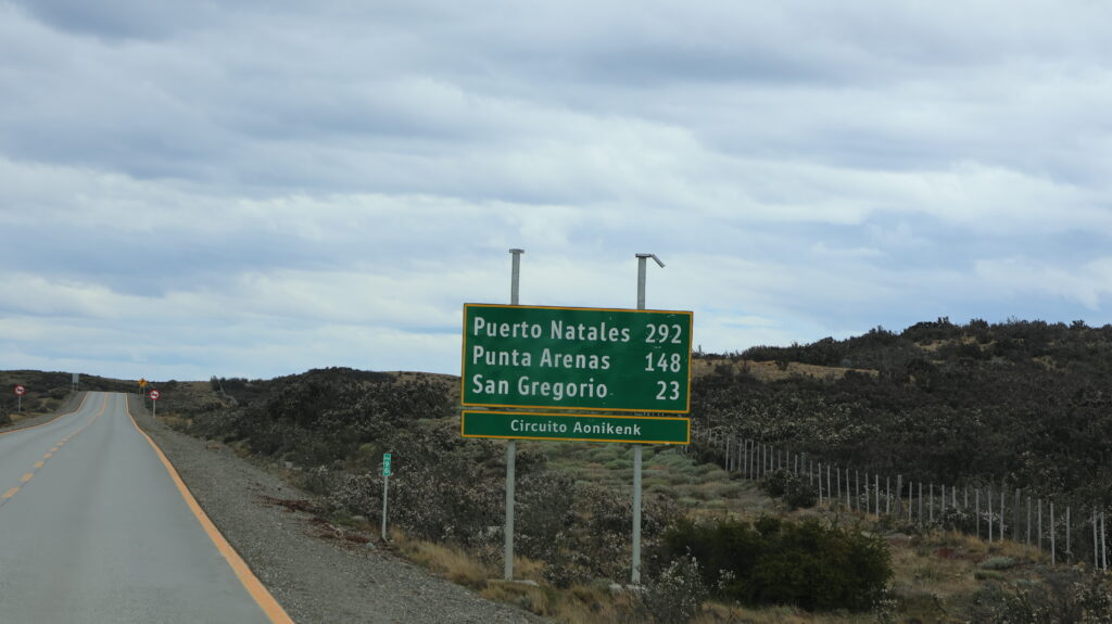 Es ist schon schöner, auf den chilenischen Strassen zu fahren. Keine Schlaglöcher wie in Argentinien. Langsam zeigen sich wieder Büsche in der Landschaft. Auf der rechten Seite begleitet uns eine Hügelkette. Die Estanzias liegen näher an der Strasse als in Argentinien.