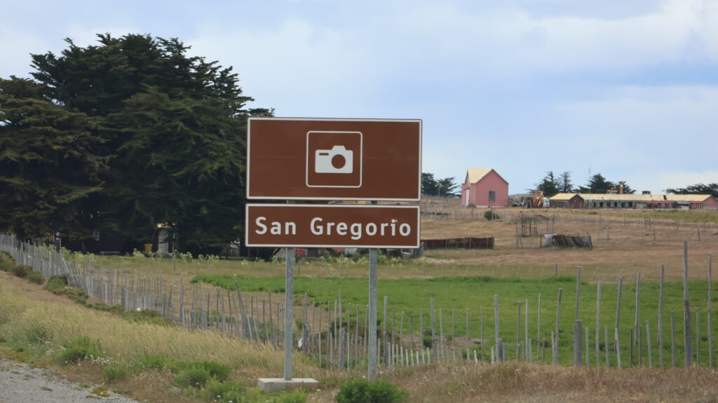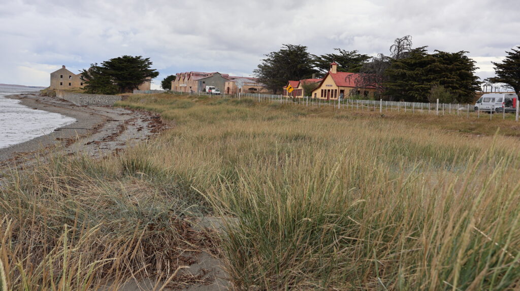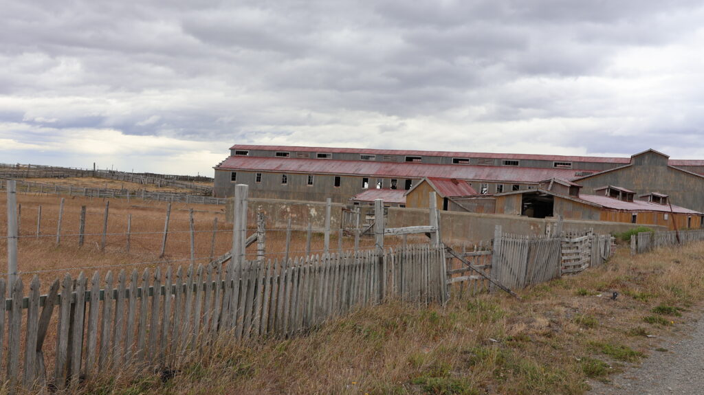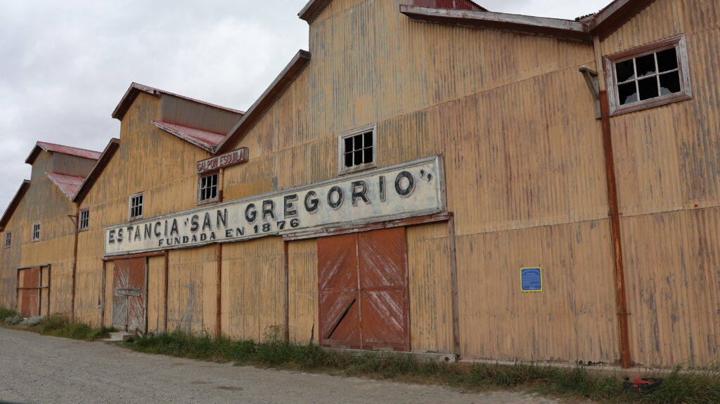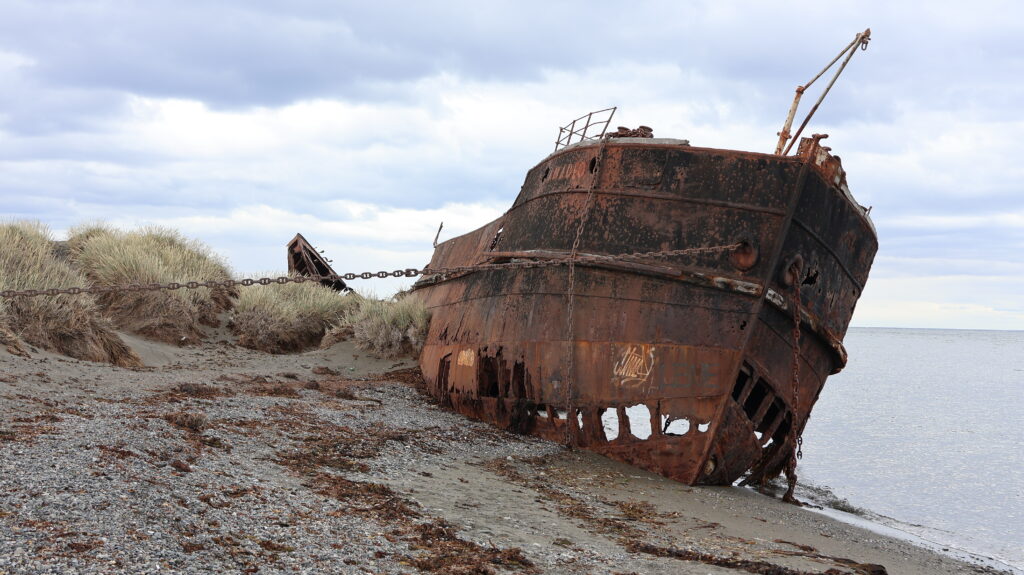 Wir halten bei der verlassenen Estanzia Gregorio. Das alte Garagentor sieht hübsch aus. Gegenüber im Wasser liegt ein Schiffswrack.