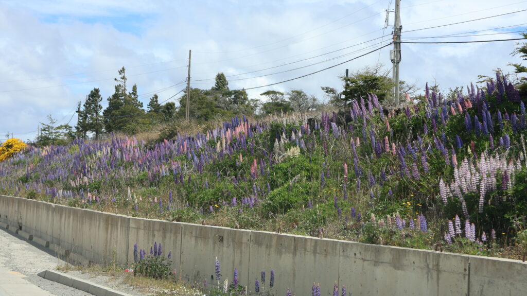 Zweimal werden wir durch Strassenbauarbeiten aufgehalten. Als wir in Punta Arenas einfahren, begrüssen uns links und rechts der Strasse blühende Lupinen. Das ist eine Augenweide.