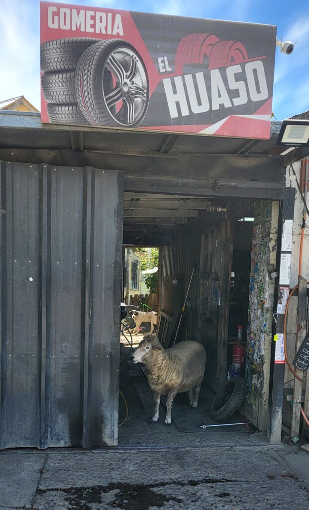 In einem moderneren Geschäft können wir einen neuen Tritt für den Camper einkaufen. Manfred bindet ihn mit einer Schnur an meinem Sitz an. So sollten wir ihn nicht mehr vergessen einzuladen. Wir sehen ein richtiges Schaf in der Türe eines Reifenhändlers. Wir dachten zuerst, es sei eine Attrappe.