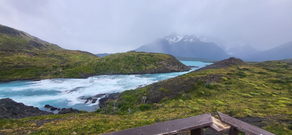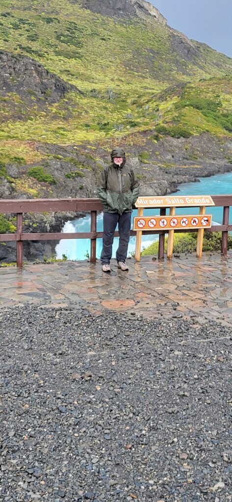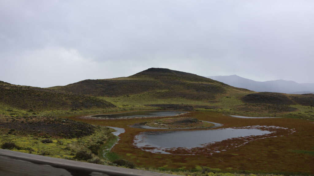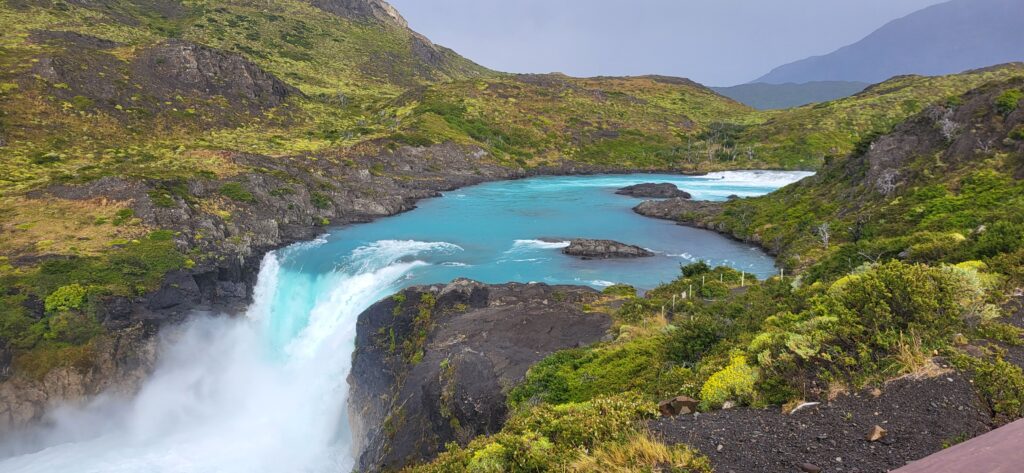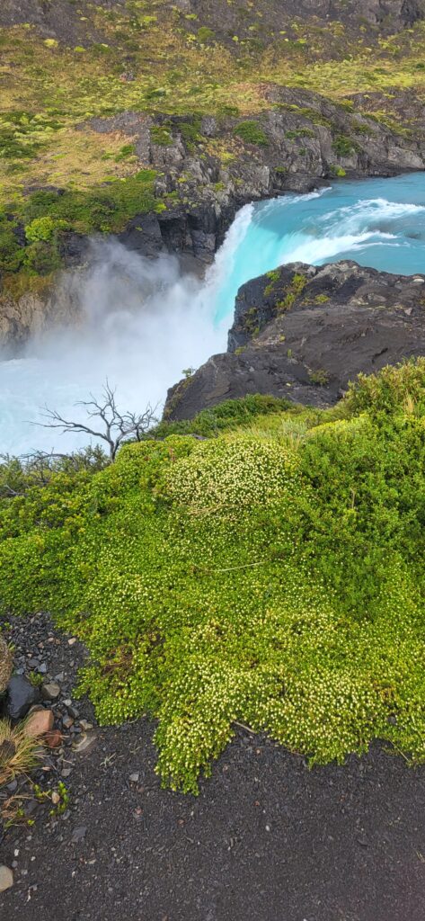 Wie der Wetterbericht voraussagte, es ist heute regnerisch und neblig. Trotzdem fahren wir zum grossen Wasserfall. Schon von der Strasse aus kann man ihn sehen. Doch man muss noch ein paar Kilometer fahren und dann noch ein bisschen laufen. Der Wind holt nach, was er gestern versäumt hat. Wir bestaunen den Wasserfall und vor allem die Farbe.