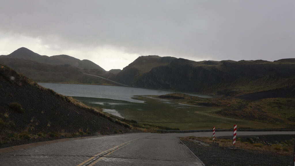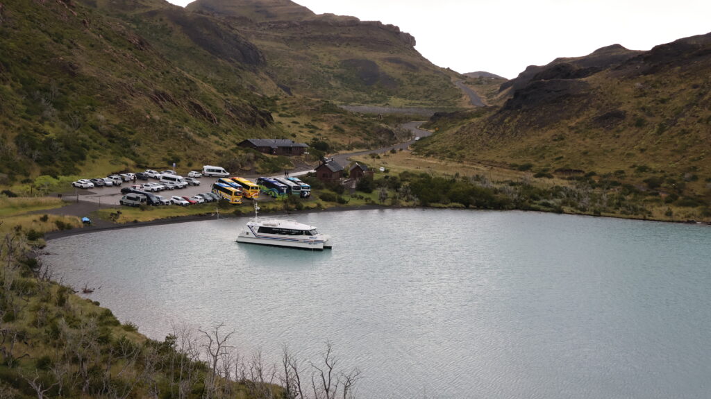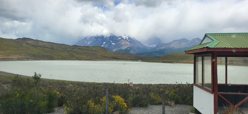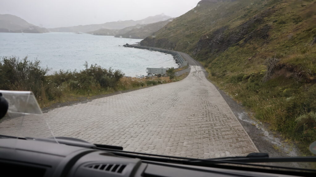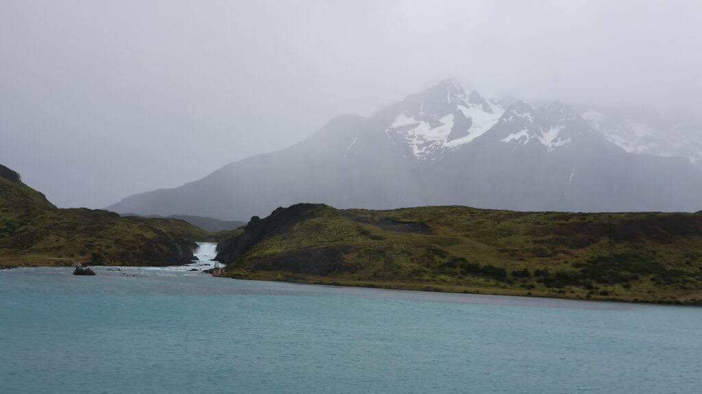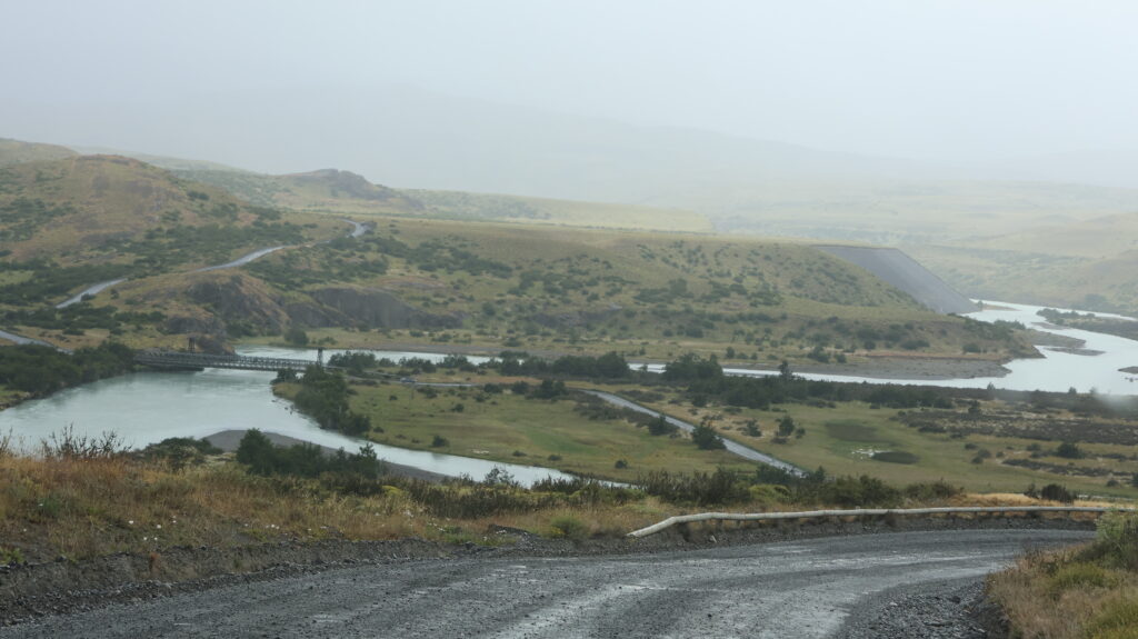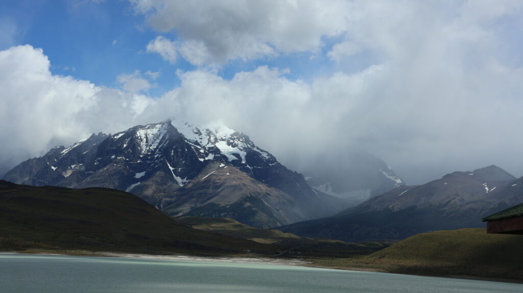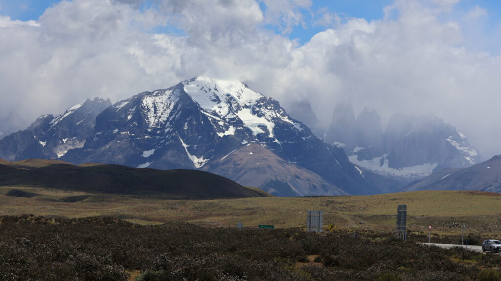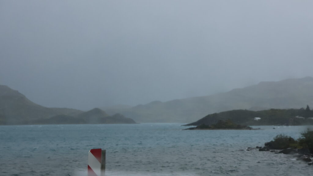 Wir hoffen, dass wir an der Laguna Amarga die Türme von der hinteren Seite sehen. Aber wir warten vergebens über eine Stunde, dass sich der Nebel lichtet. Am Lago del Toro sehe ich in den Rückspiegel und tatsächlich kann man die Torres schemenhaft erkennen. Manfred muss sofort anhalten, damit ich ein Bild machen kann.