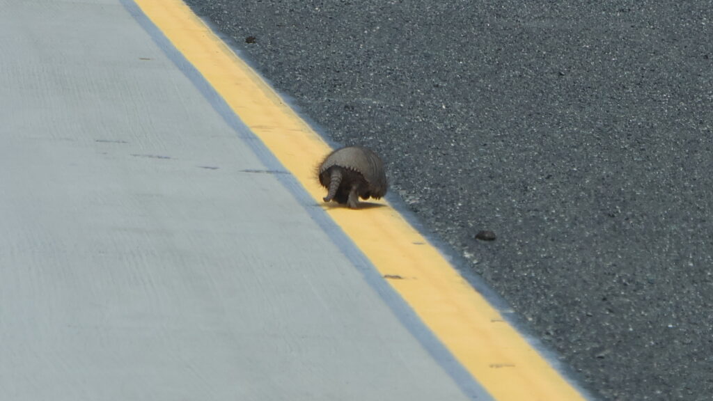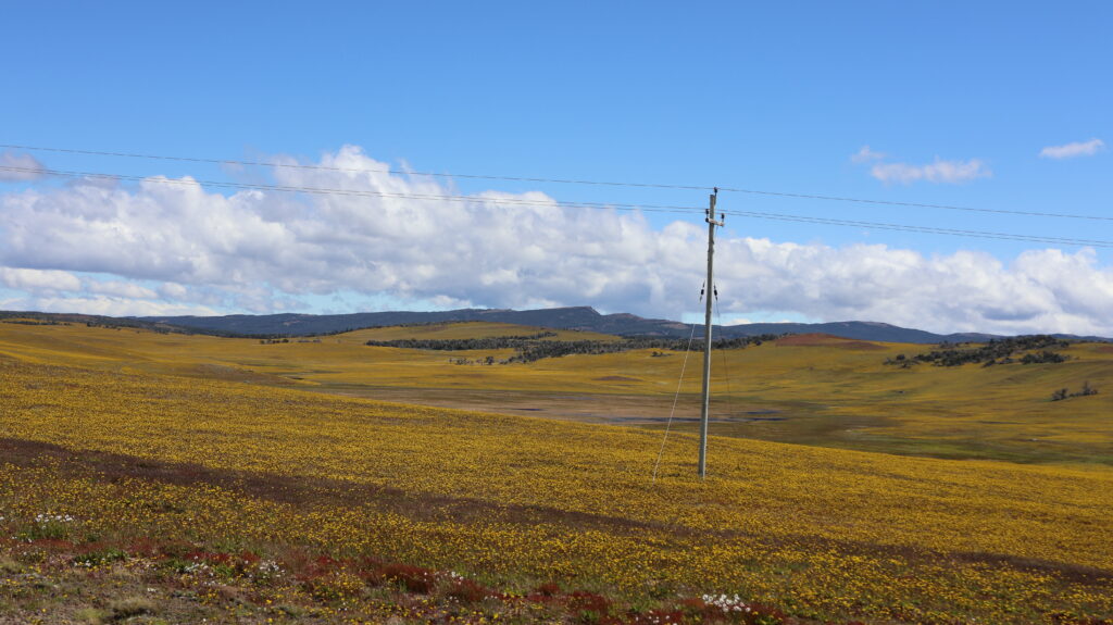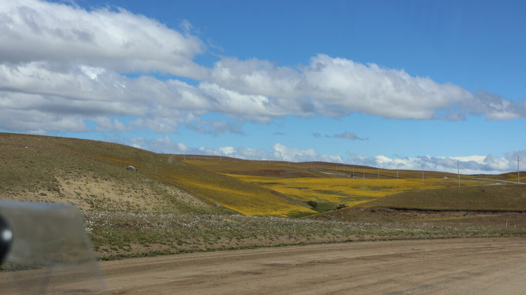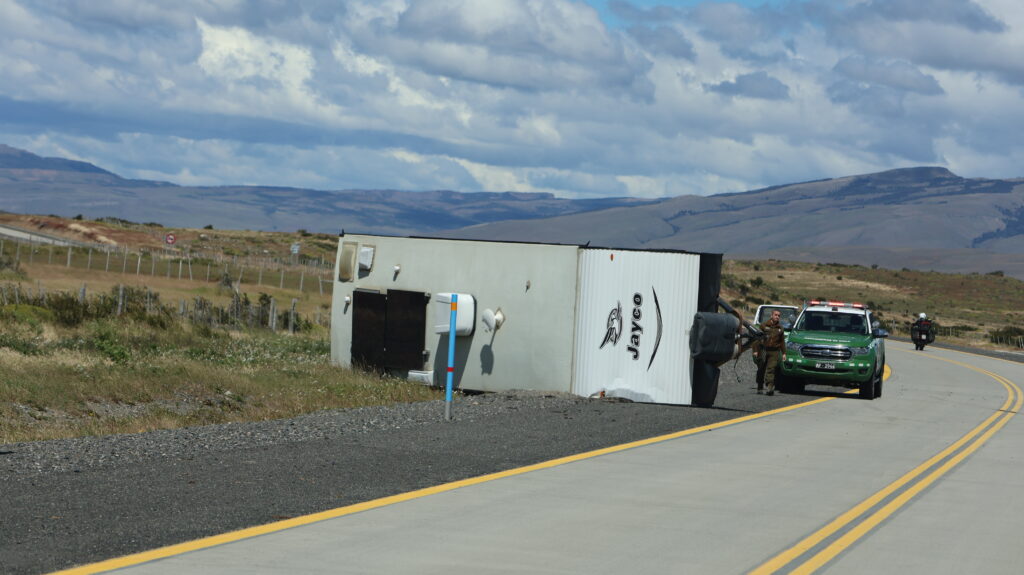 Zuerst fahren wir noch Piste, danach kommt Teer. Auf den Wiesen blühen gelbe Blumen. Am Strassenrand wiegen sich Margariten im Wind. Vor uns ein Motorradfahrer, der mit dem Wind kämpft und ein bisschen weiter vorne liegt ein langer Wohnwagen auf der Seite. Die Polizei ist schon da.