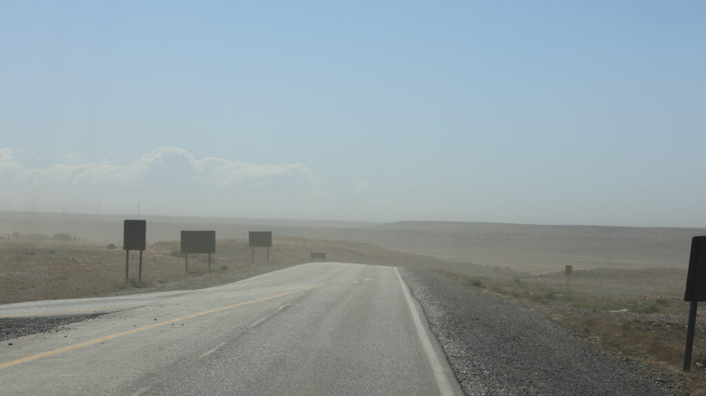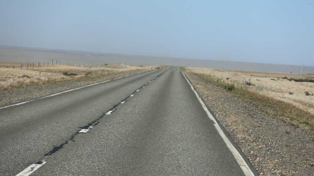 Als Manfred sieht, dass es wieder geradeaus in die Pampas geht, will er sofort umdrehen. Aber leider müssen wir eine Weile so fahren. Es hat viel Staub in der Luft. Kein Wunder bei diesem Wind. Man muss höllisch aufpassen, dass man nur eine Autotür aufs Mal aufmacht und auch auf welcher Seite. Pinkeln geht auch nicht draussen.
