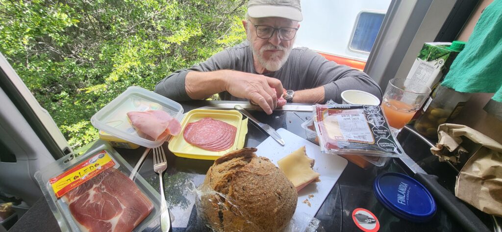 Wir essen beim Parkplatz und das Brot ist wirklich sensationell gut, nach all dem weichen Weissbrot. Auf dem Weg zurück ruft Manfred plötzlich: «Aha, ich weiss warum!» Ich bin völlig ratlos. Der Druck für die Federbälge der Hinterachse ist weg. Darum ruckelte das Auto so hart. Er hält aus, steigt aus und behändigt sich der Werkzeuge. Dann liegt er unter den Camper und findet den Fehler sofort. Einer der Schläuche hat ein Riss. Er schneidet ein Stück ab und schliesst ihn wieder an. Zum Glück ist der Schlauch genug lang.