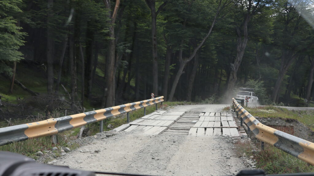 Wir fahren am Fluss entlang und überqueren etliche Bäche auf holprigen Brücken. Links und rechts hohe Berge. Auf halbem Weg machen wir eine kurze Pause.