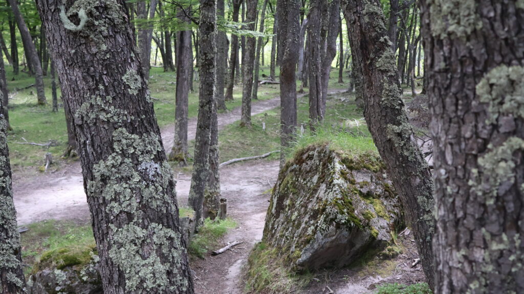 Obwohl die Maschine für die Strasse unterwegs ist, wird sie bis nach hinten nicht besser. Es staubt gewaltig. Ob es gesund ist, in dem Staub Fahrrad zu fahren und zu wandern? Ich spüre den Staub auch im Auto. Es knirscht zwischen den Zähnen. Das Auto ist absolut nicht dicht! Die Strasse endet und man kann den See nicht sehen. Einige Schritte muss man durch den Wald gehen, um ihn zu entdecken. Nirgends steht angeschrieben, wo er ist. Aber es hat so viele kleine Trampelpfade, einer führt bestimmt zum See. Er ist keine ausgenommene Schönheit. Ein See eben