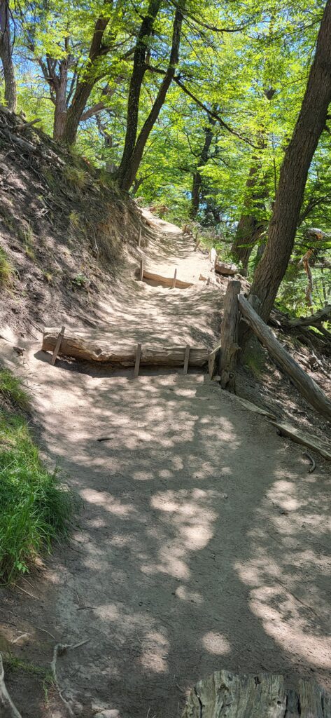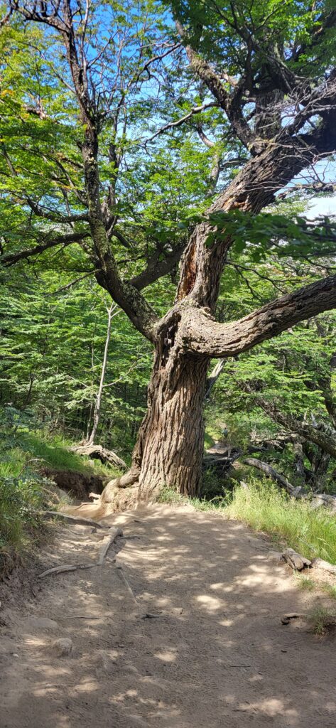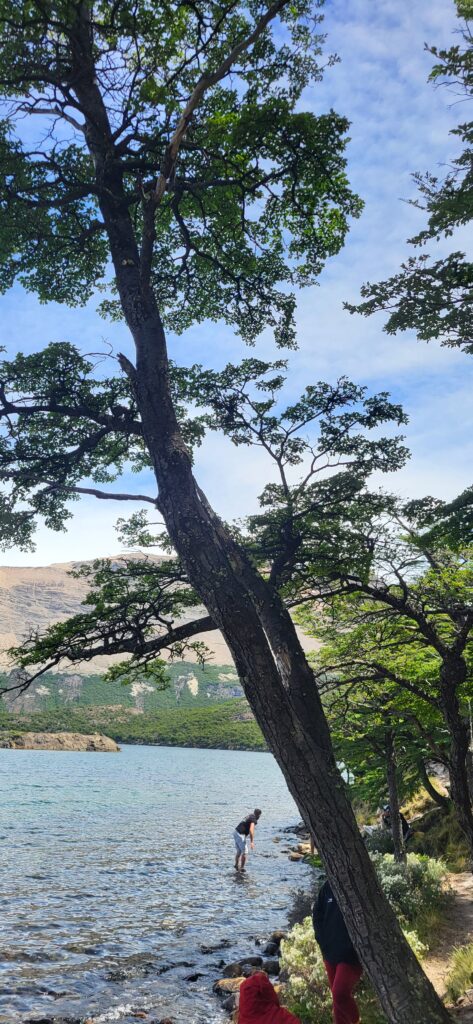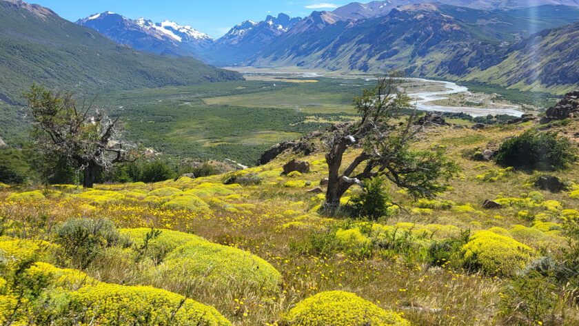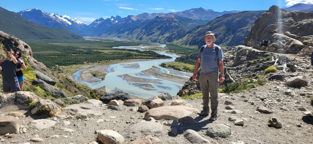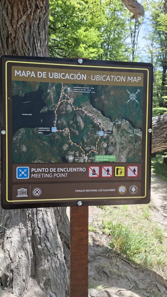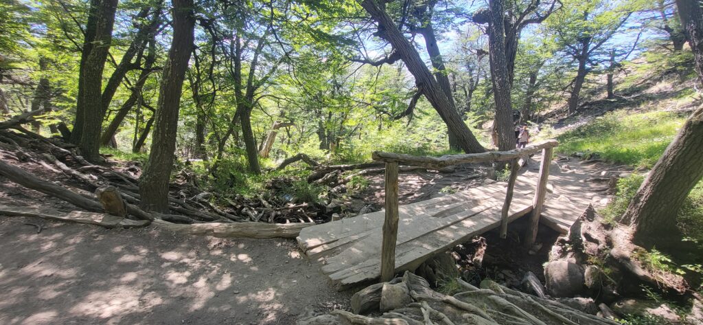 Es ist wie auf der Autobahn zur Feierabendzeit. Sehr viele Wanderer auf diesem Weg. Familien mit Kindern und eine 30-köpfige Schar Asiaten mit Führerin. Immer wieder trete ich zur Seite und lasse die schnelleren Wanderer passieren. Der erste Aussichtspunkt ist bald einmal erreicht. Wir sehen hinunter auf den Fitz Roy Fluss, dem wir gestern einige Zeit entlang gefahren sind.