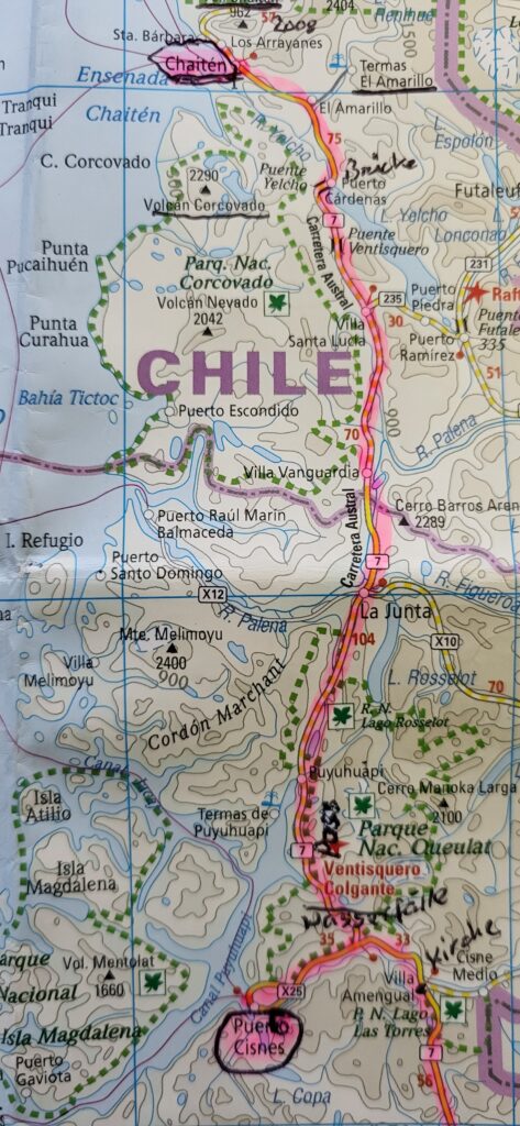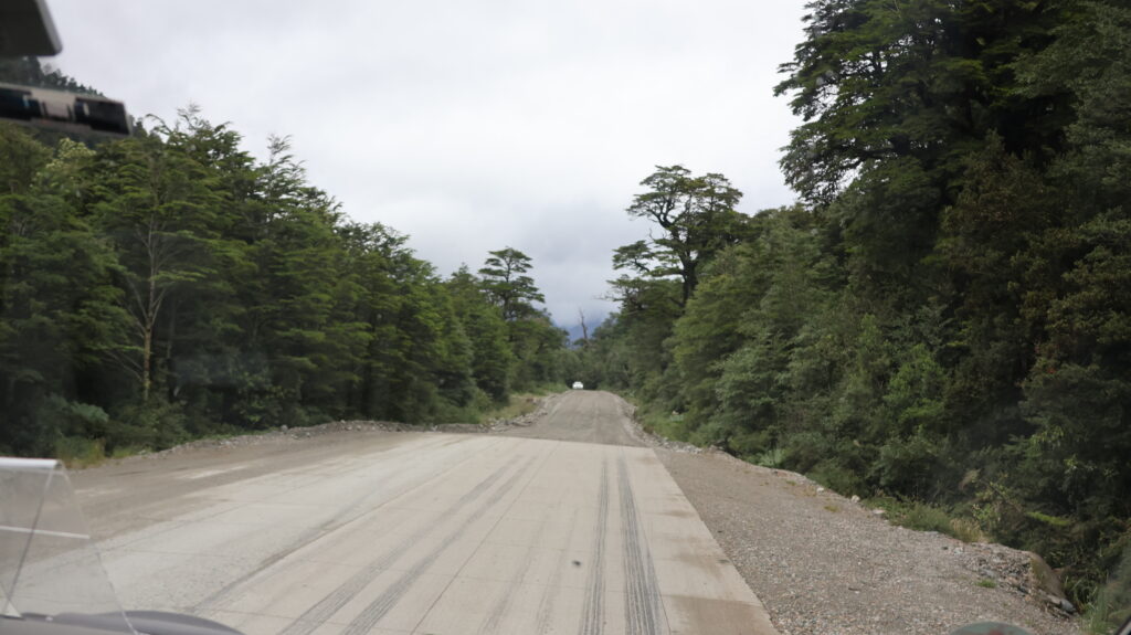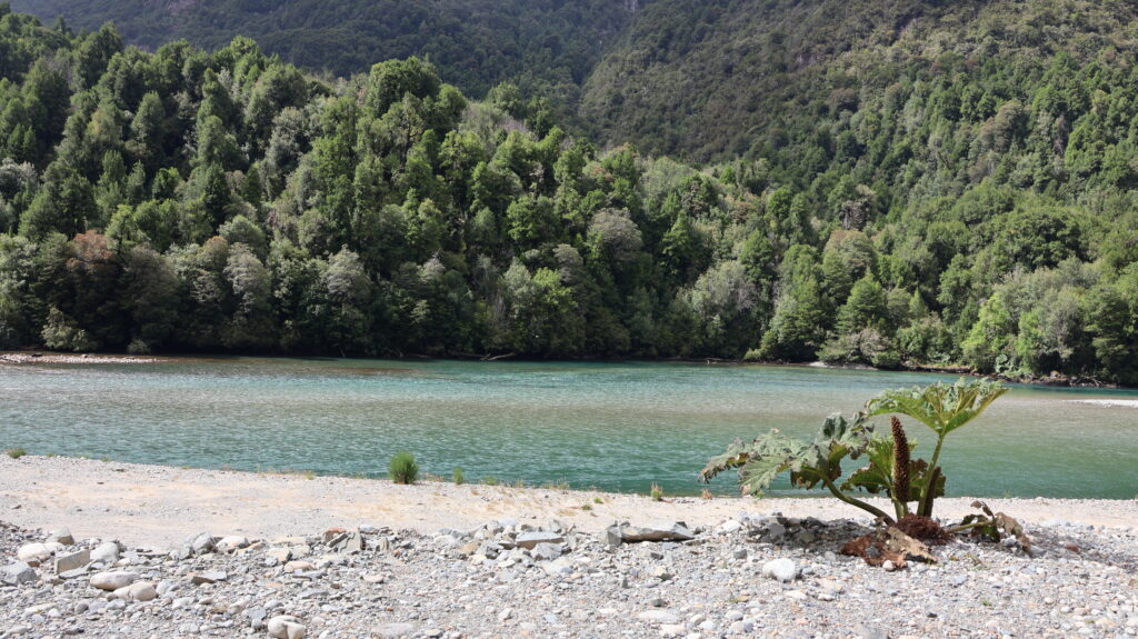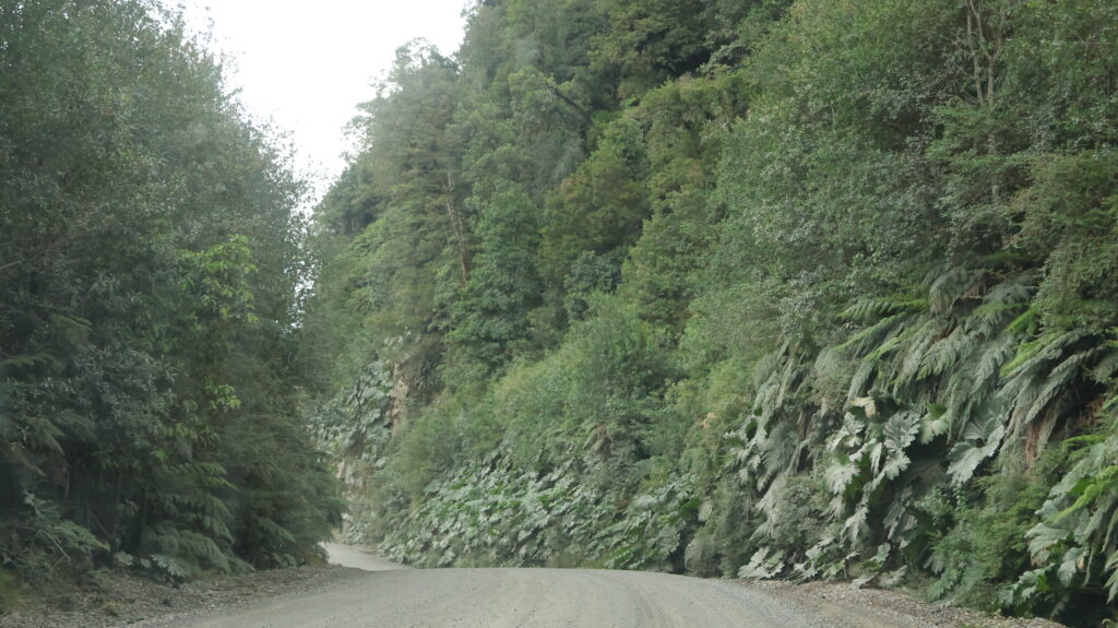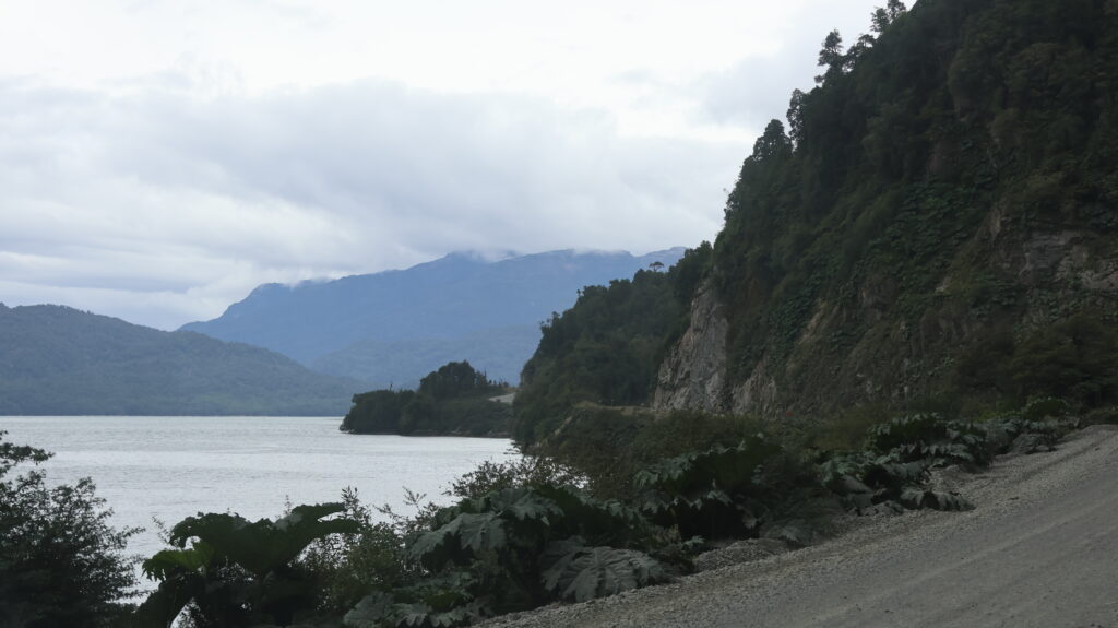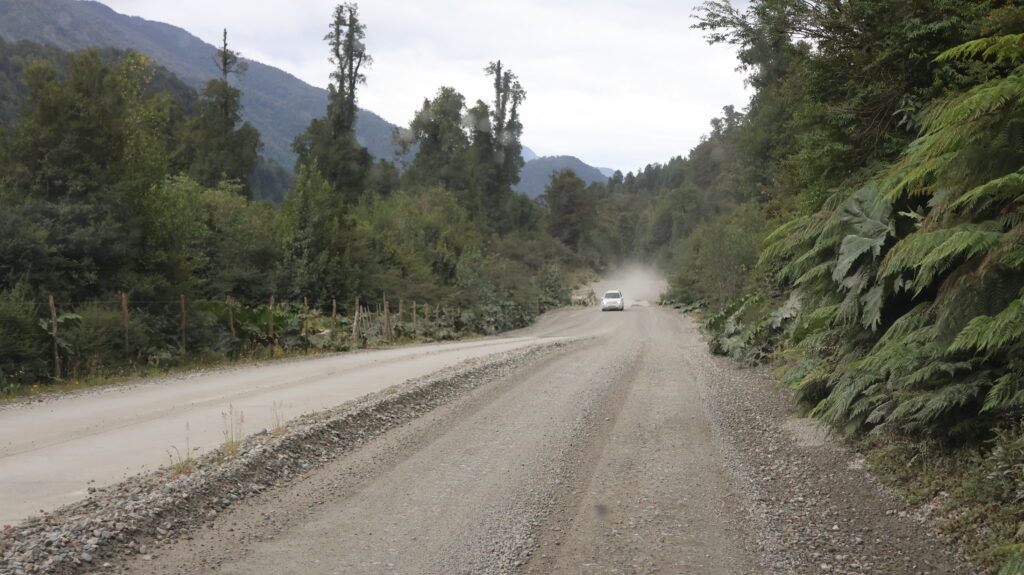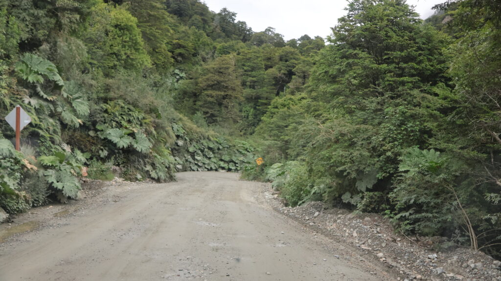Bald nach Cisnes fängt der Pass an und das ist wieder Schotterstrasse. Allerdings ist sie nur in den Kurven schlecht. Alles, was Räder hat, fährt auf dieser Strasse, weil sie besonders ist. Sie führt durch Urwald. Am Strassenrand kommen nun zu Riesenrhabarber und Fingerhut noch verschiedener Farn und mannshohe Fuchsien dazu. Es heisst schauen und geniessen.