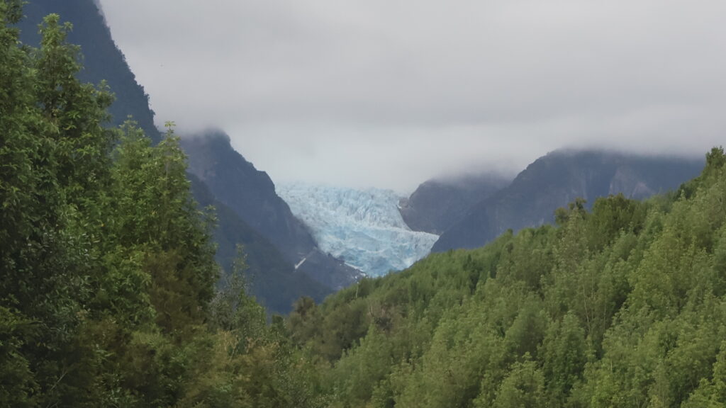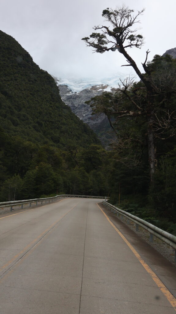 Unten angekommen, ist die Gegenfahrbahn betoniert, wir fahren weiterhin auf der Schotterstrasse. Es gibt hier einen Hängegletscher, das heisst, er hängt über eine Felswand. Ab und zu brechen Eisstücke ab und fallen hinunter. Man kann ganz in die Nähe wandern. Für uns ist das zu anstrengend. Aber man sieht die vordere Wand auch von der Strasse aus.