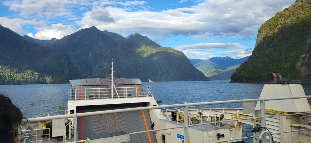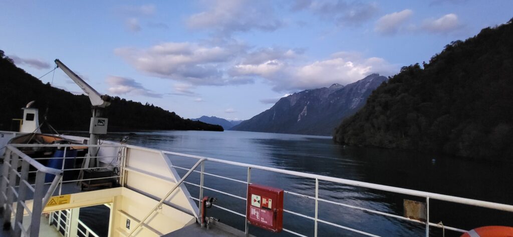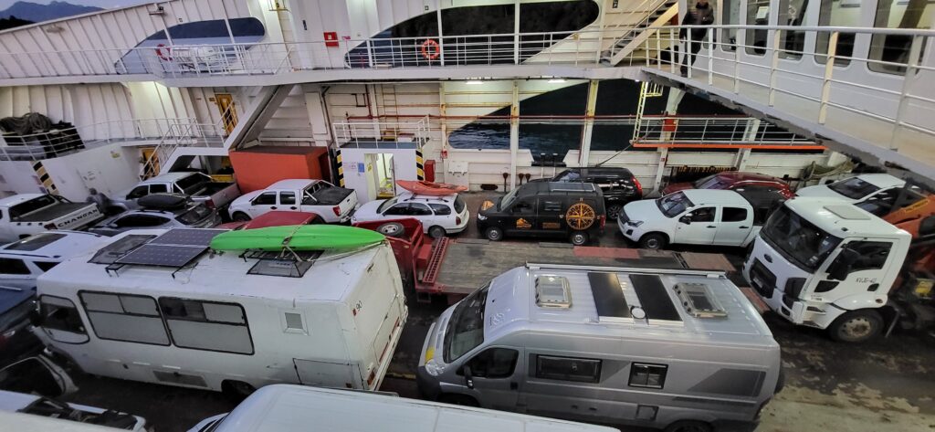 Um 17:30 Uhr soll man bei der Fähranlegestelle sein. Wir sind kurz nach 17 Uhr dort. Die Fähre soll um 19:30 ablegen. Bis um 19 Uhr geht gar nichts ausser warten. 19:10 Uhr einschiffen, 19:25 Uhr Abfahrt. Die Überfahrt dauert nur 30 Minuten. Danach muss man 10 Kilometer auf geteerter Strasse fahren und wieder auf die nächste Fähre warten. Sie ist grösser und fährt kurz nach 22 Uhr ab. Es steht geschrieben, sie hat für die Weiterreise 4 Stunden. Da man in der Nacht nichts sieht, legen wir uns in unserem Bett schlafen.