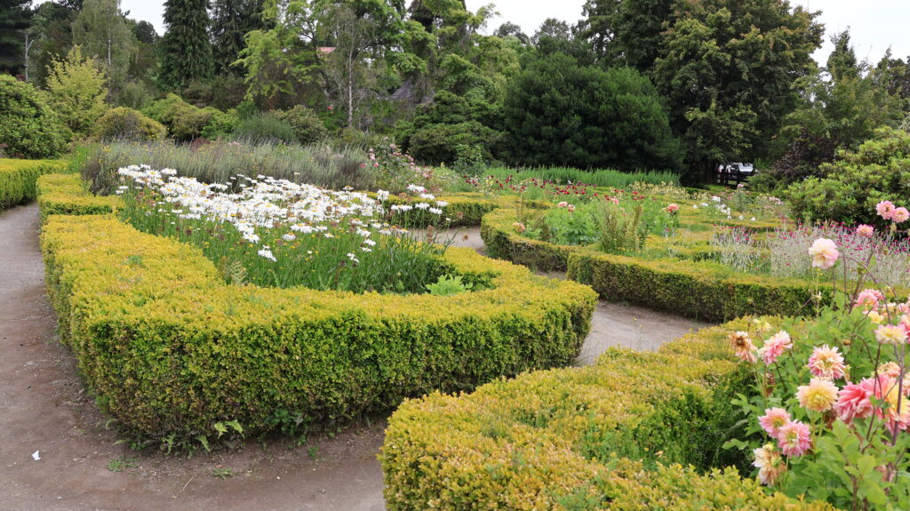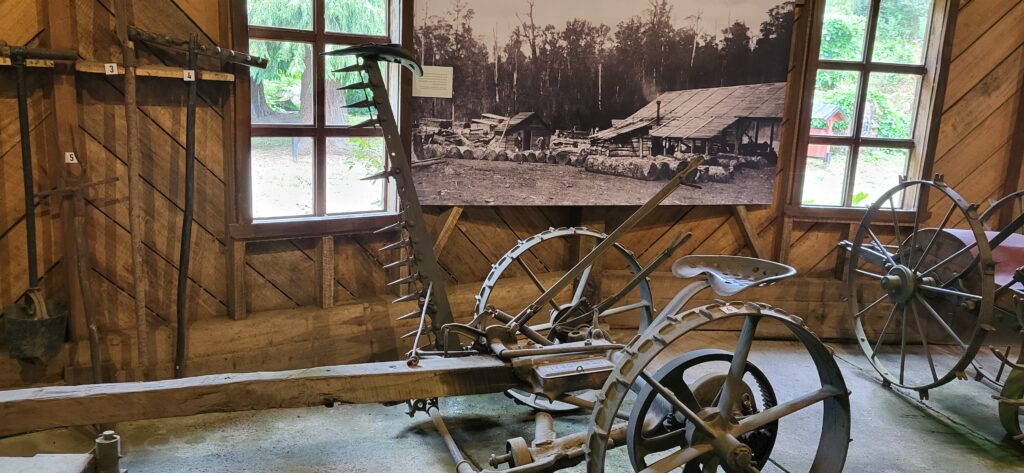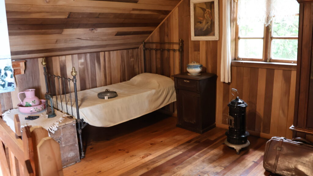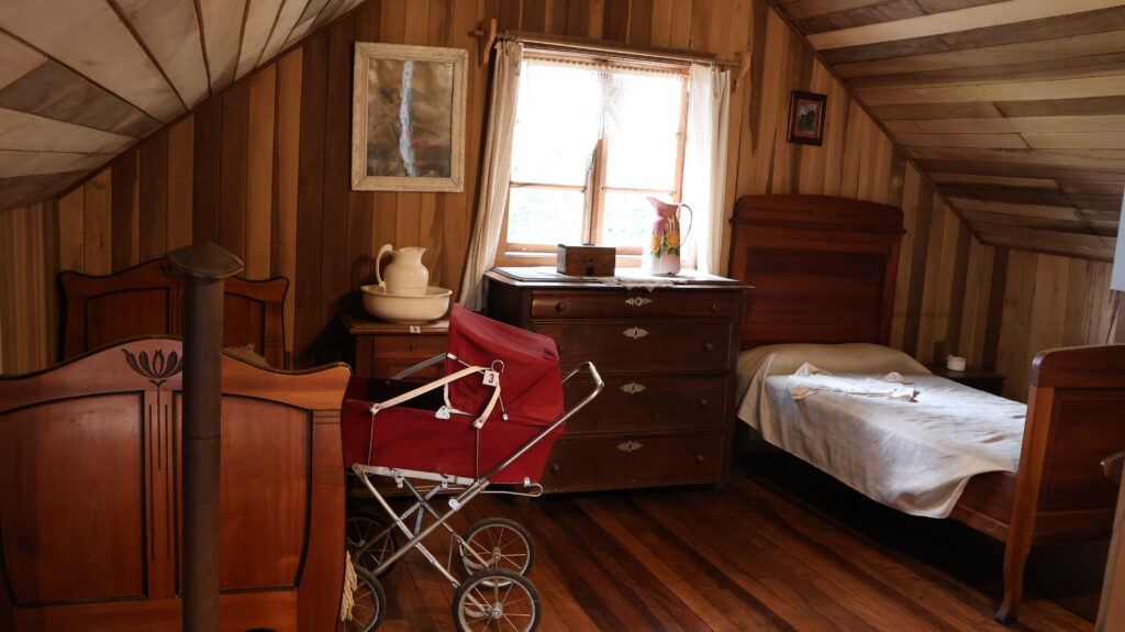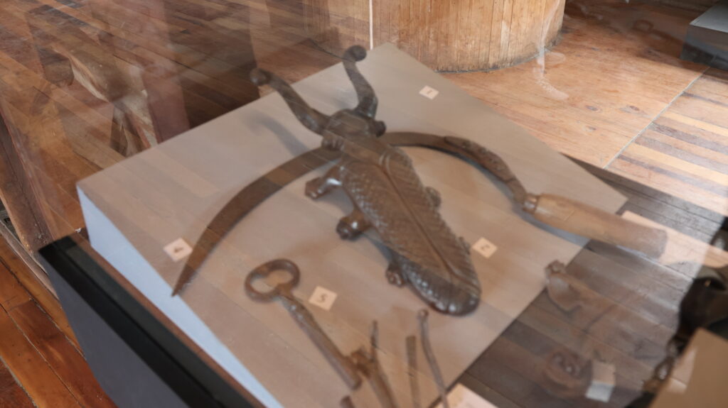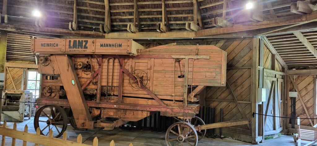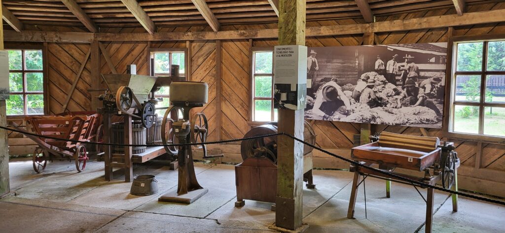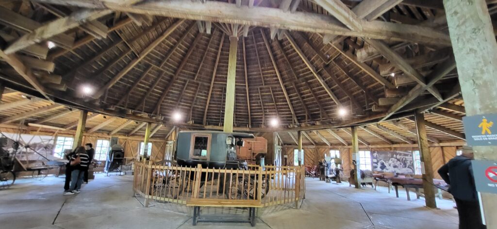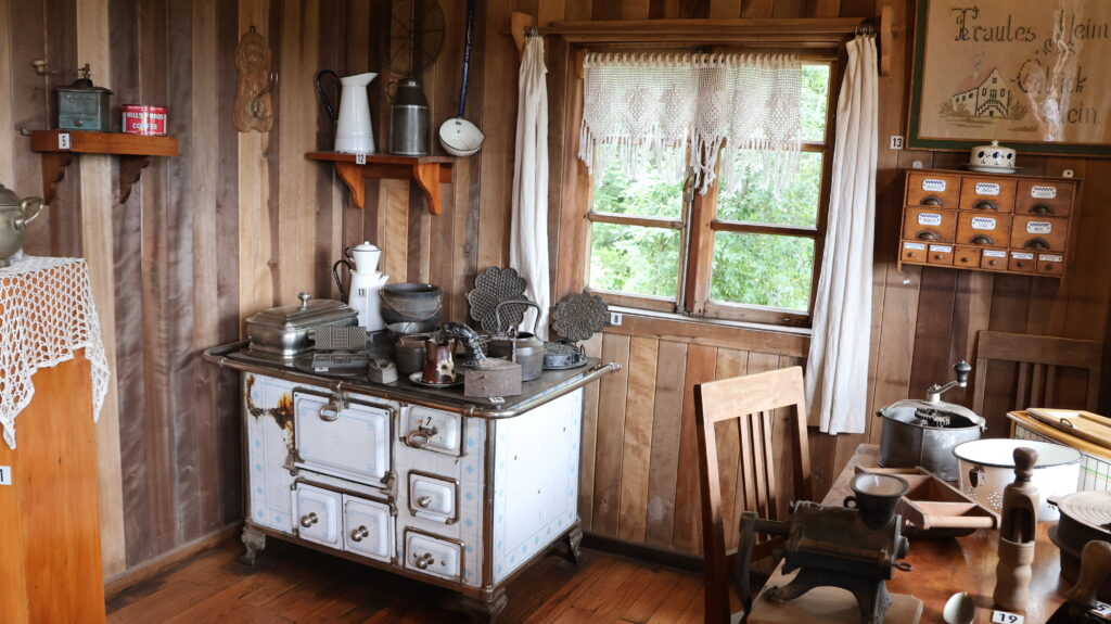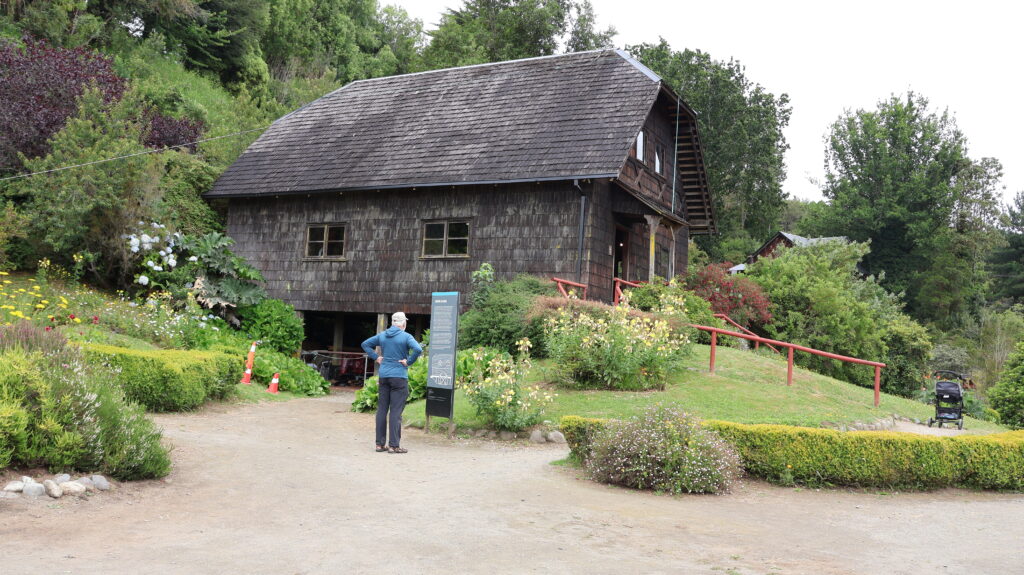 Gegen Mittag strömen Touristen wie wir in Bussen herbei. Sie werden von Fremdenführern durch die Stadt gelotst. Wir schauen uns noch das Museum Colonial an. Auf einem Parkareal stehen 4 Häuser. Eine Mühle, ein Wohnhaus, ein Haus ist geschlossen wegen Renovierungsarbeiten und ein runder Bau, in dem Landwirtschaftsmaschinen ausgestellt sind. Alles von den deutschen Einwanderern. Die Mühle läuft nicht mehr. Davor liegt ein prächtiger Blumengarten. Die Beete sind mit Buchsbaum eingefasst, wie bei uns die alten Bauerngärten. Höher gelegen ist ein Wohnhaus. Im Erdgeschoss war eine Schmiede eingerichtet. Wir sind auch zum geschlossenen Haus hinaufspaziert. Der runde Bau ist interessant. Teilweise kann ich mir gar nicht vorstellen, wozu die Geräte gebraucht wurden.