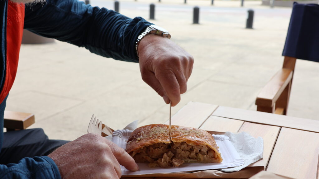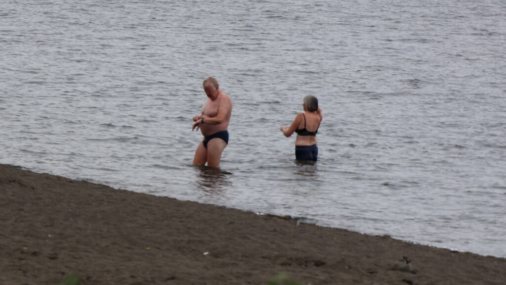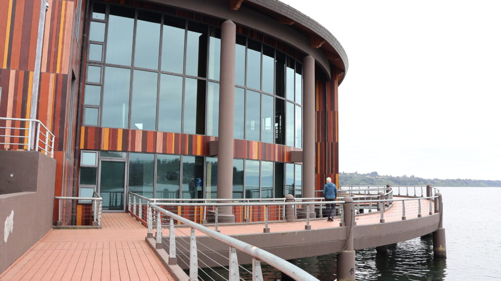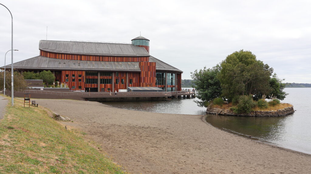 Der Ort besitzt ein grosses Theater am See. Aussen sind Kunststoffplatten befestigt. Sie sind überzogen mit einer Art Folie in Holzmuster oder Farben. Man kann um das ganze Gebäude herumlaufen. Die Hälfte davon steht auf Pfählen im See. Eingänge befinden sich je auf einer Seite. In der Mitte sind kleine Geschäfte etabliert. Eines davon verkauft guten Kaffee und Gebäck. Dort kann ich endlich ein Brot kaufen, das so schmeckt, wie wir es gewohnt sind. Manfred probiert einen Apfelstrudel, der mundet.