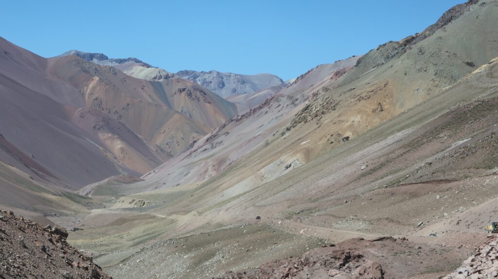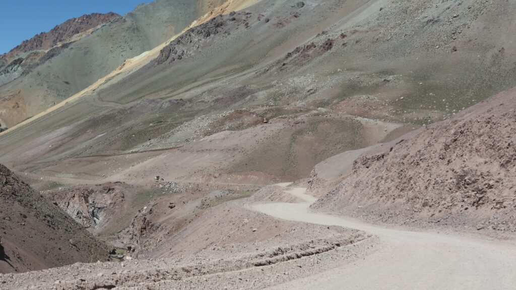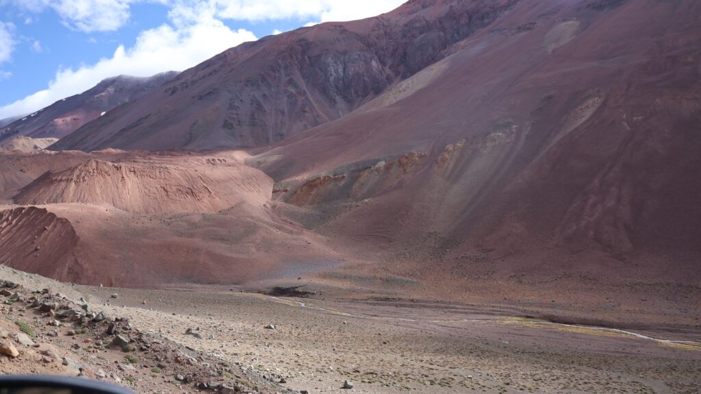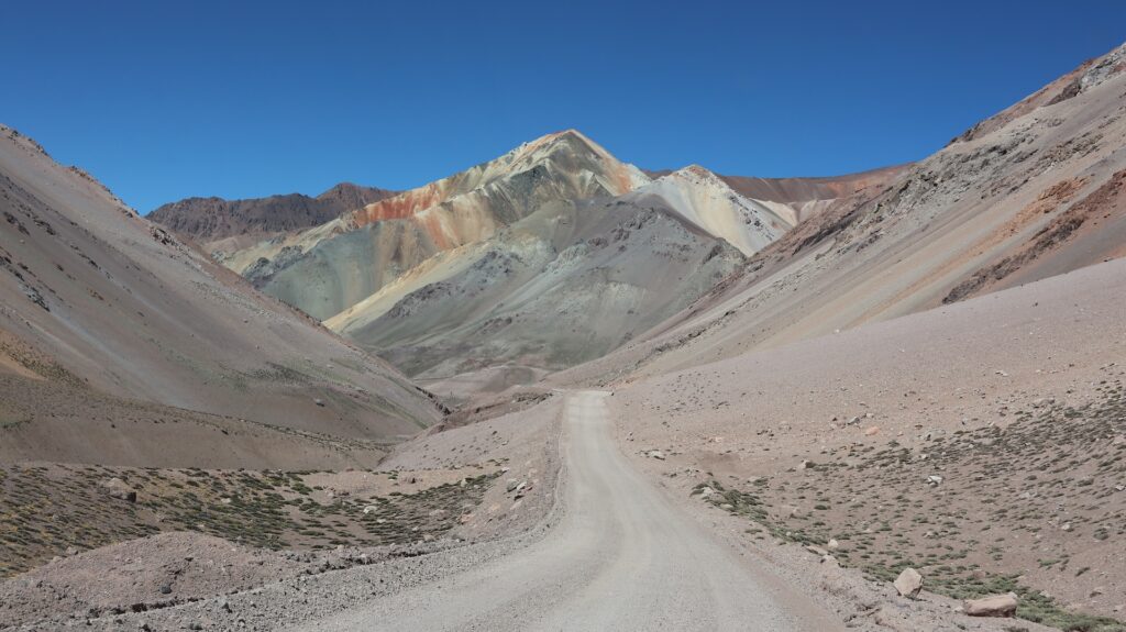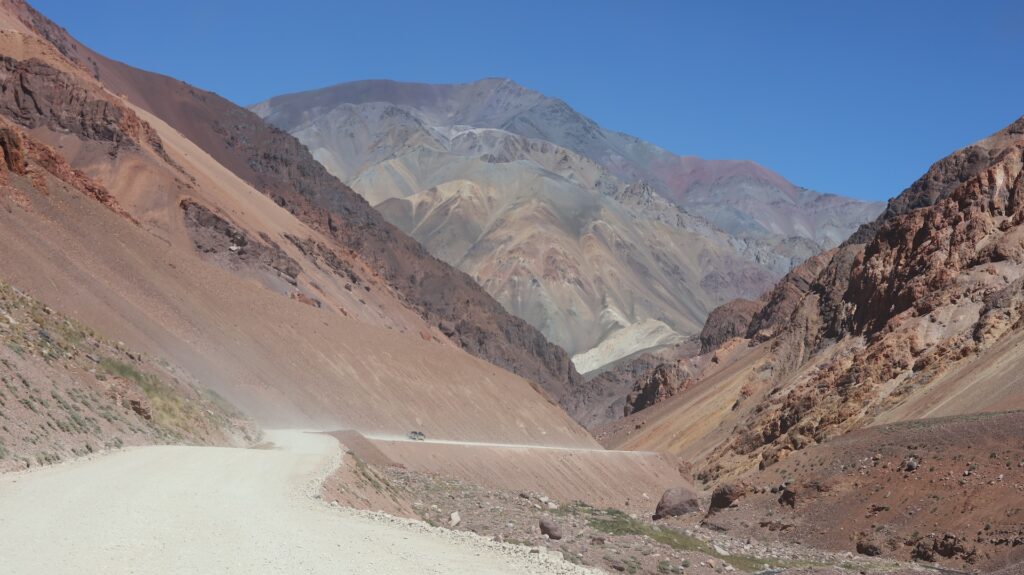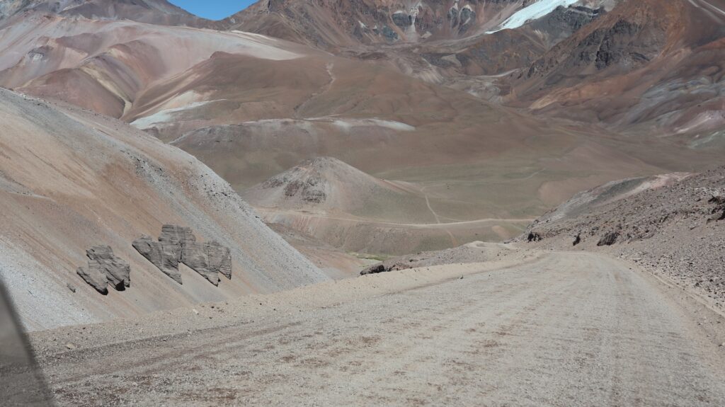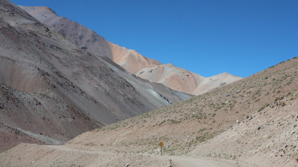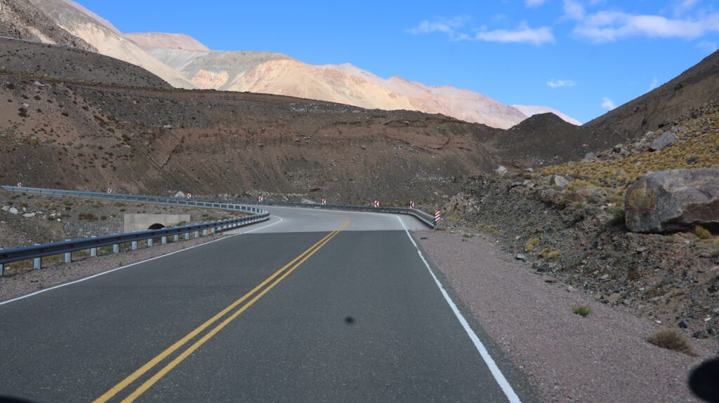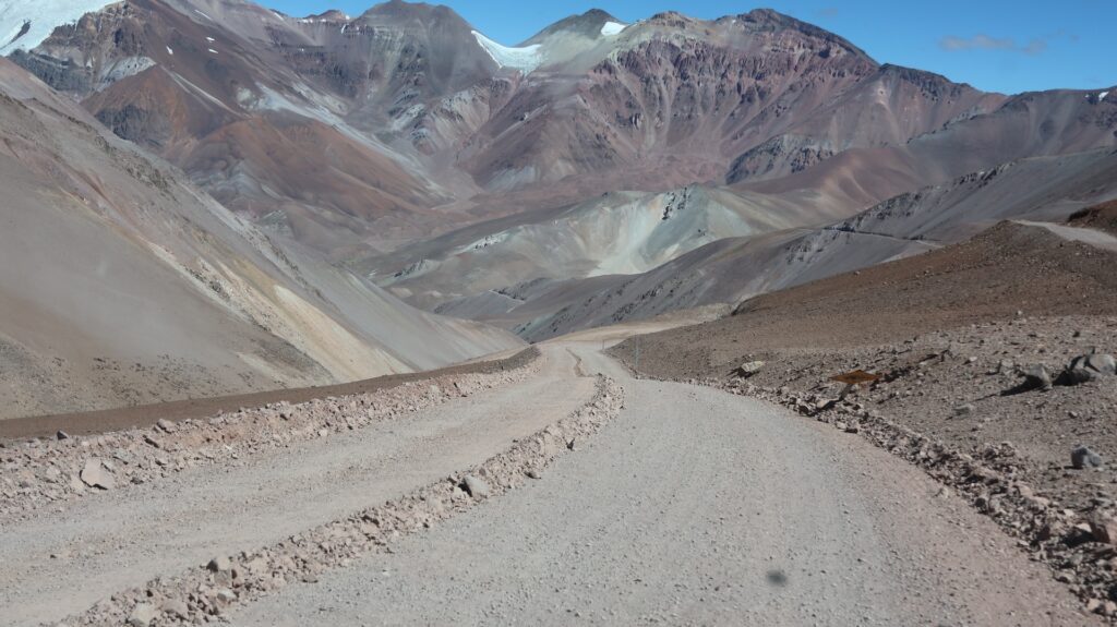 Wahnsinn, was da an Farben an den Bergen klebt. Wer hat da seine Farbresten entsorgt? Ich schaue und staune. Wir sind beinahe allein unterwegs und so kann Manfred langsam fahren und die Umgebung auch geniessen. Etwa halbwegs vor dem chilenischen Zoll steht ein Auto auf der Seite. Ein Mann steht daneben und scheint auf etwas zu warten. Wir halten an und erkundigen uns.