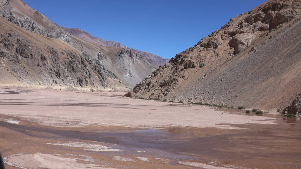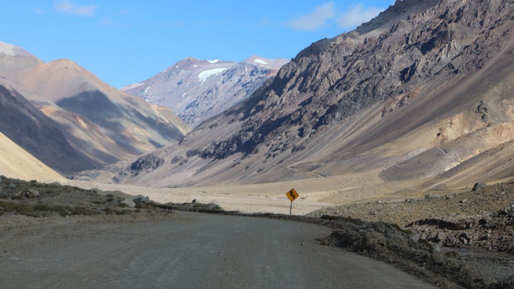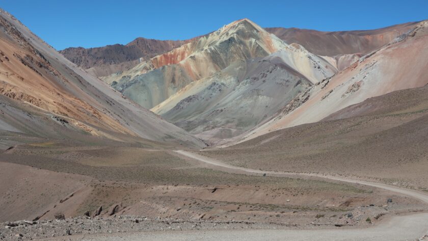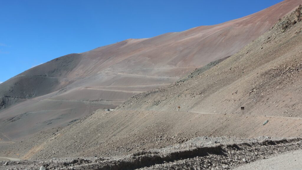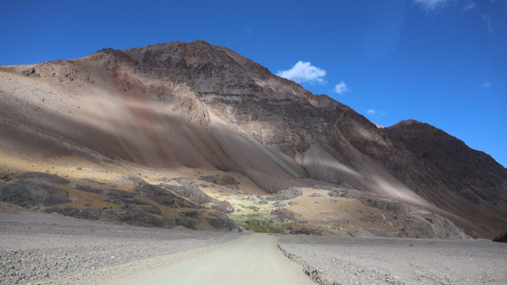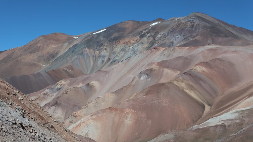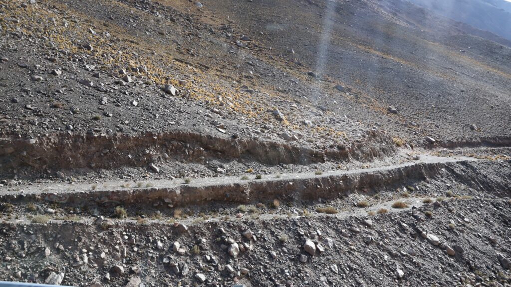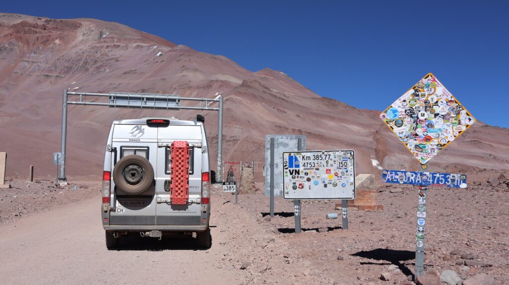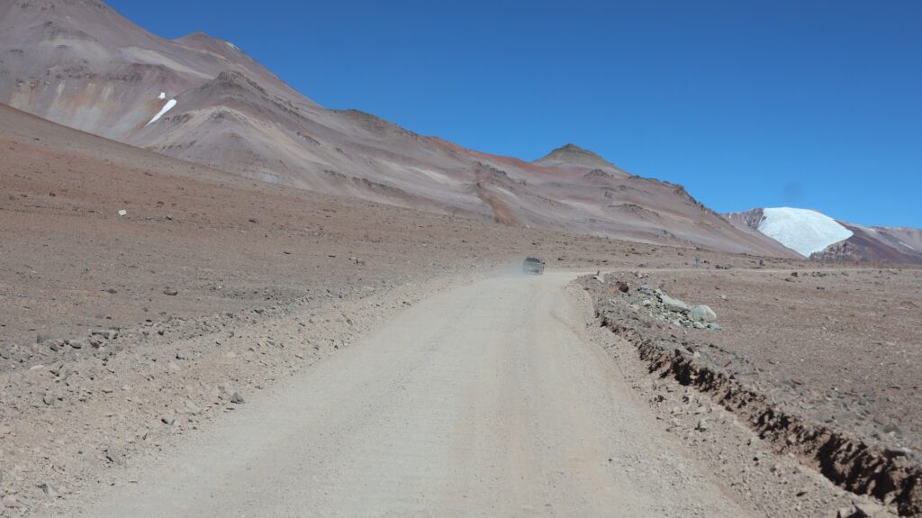 Wahnsinn, was da an Farben an den Bergen klebt. Wer hat da seine Farbresten entsorgt? Ich schaue und staune. Wir sind beinahe allein unterwegs und so kann Manfred langsam fahren und die Umgebung auch geniessen. Etwa halbwegs vor dem chilenischen Zoll steht ein Auto auf der Seite. Ein Mann steht daneben und scheint auf etwas zu warten. Wir halten an und erkundigen uns.