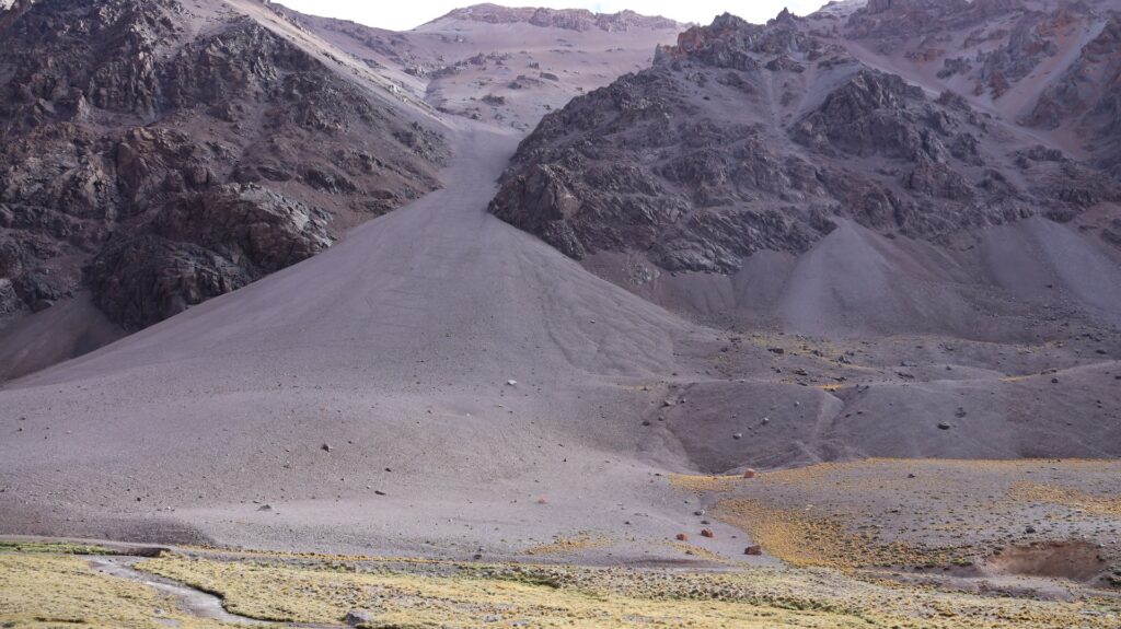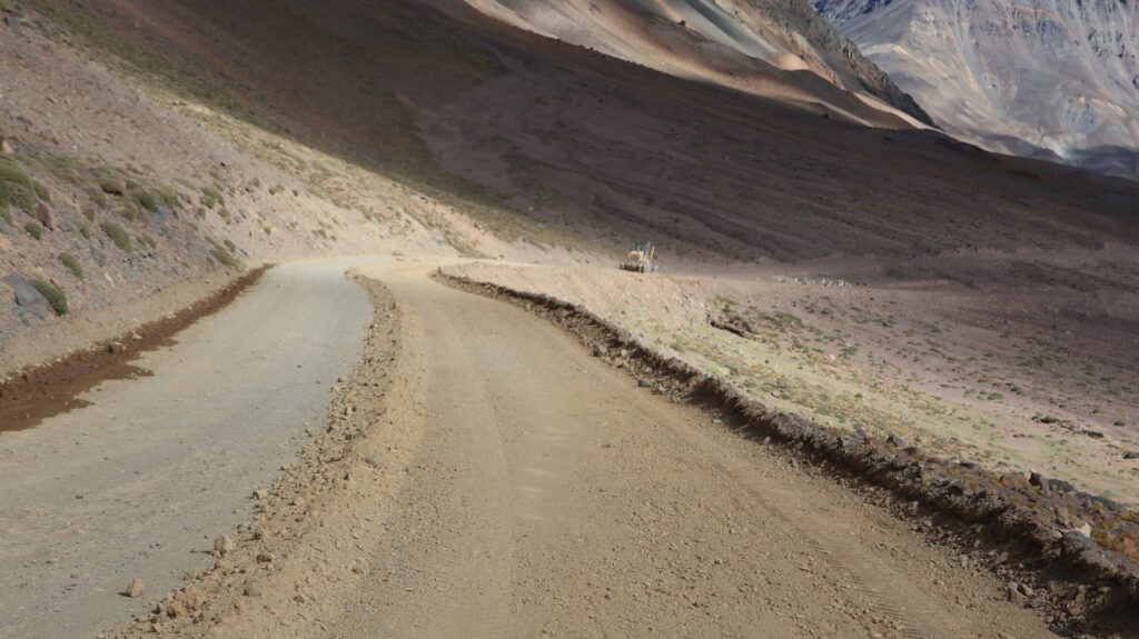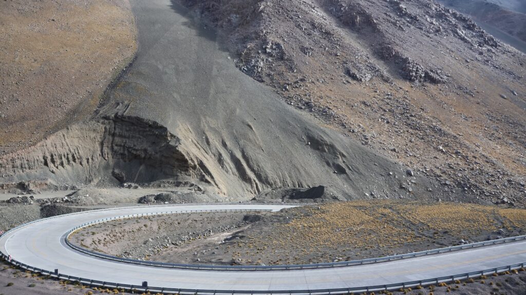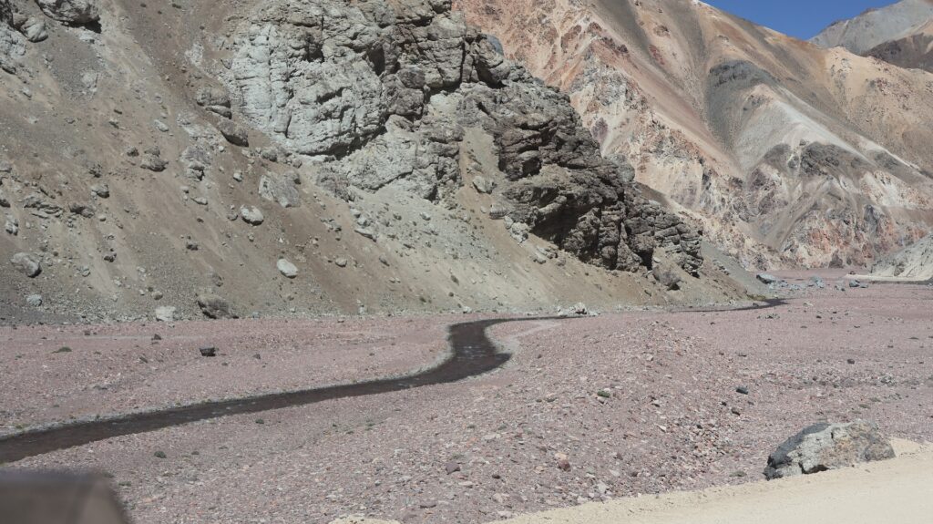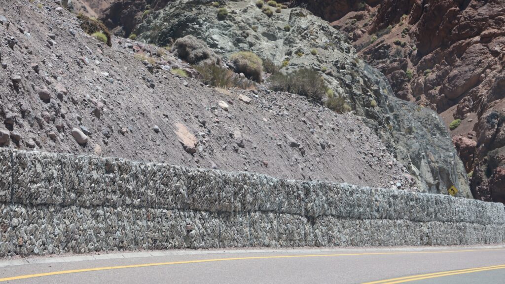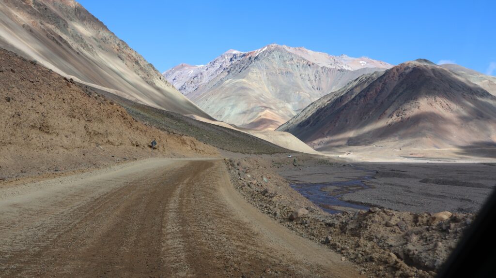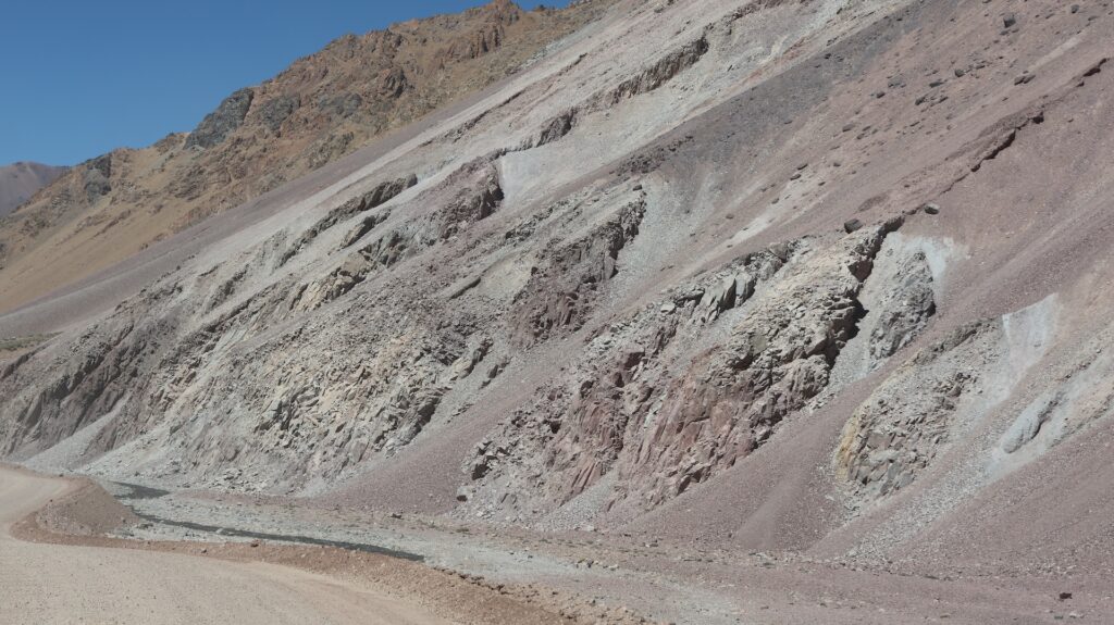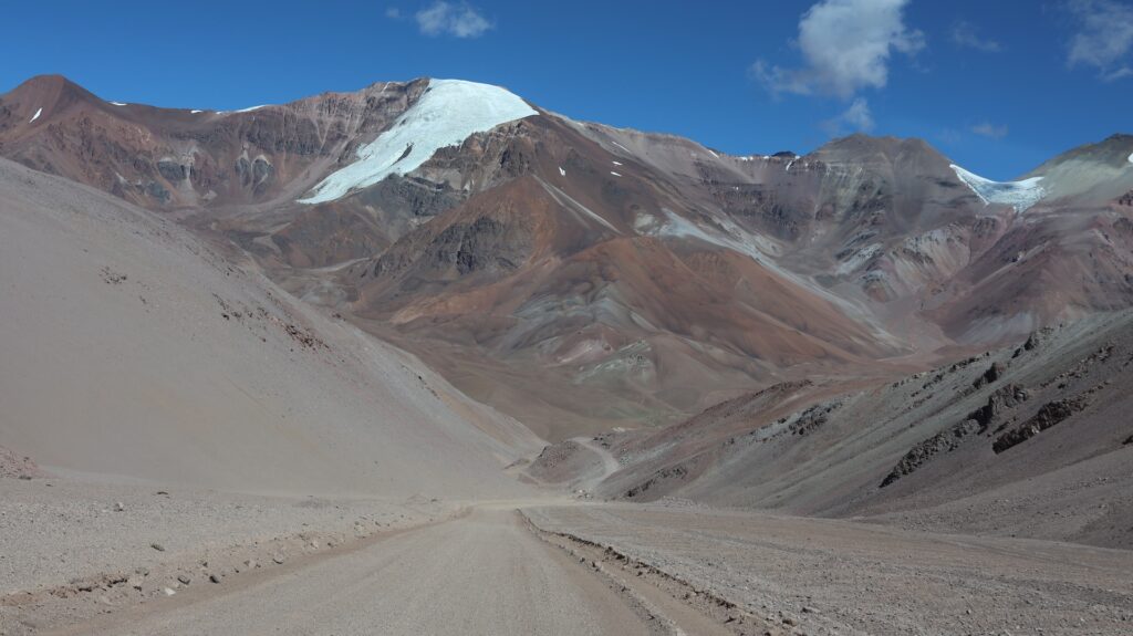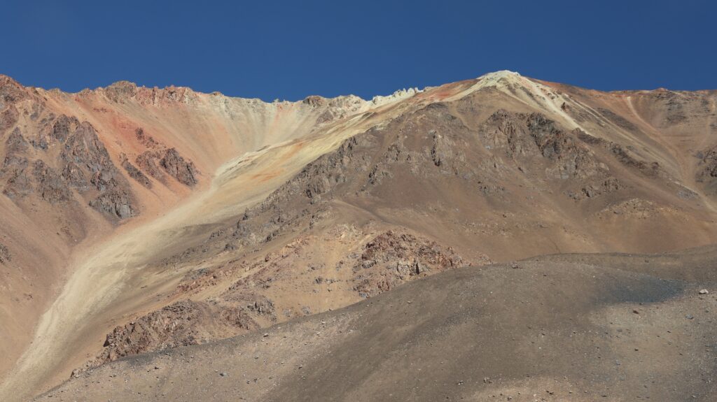 Wahnsinn, was da an Farben an den Bergen klebt. Wer hat da seine Farbresten entsorgt? Ich schaue und staune. Wir sind beinahe allein unterwegs und so kann Manfred langsam fahren und die Umgebung auch geniessen. Etwa halbwegs vor dem chilenischen Zoll steht ein Auto auf der Seite. Ein Mann steht daneben und scheint auf etwas zu warten. Wir halten an und erkundigen uns.