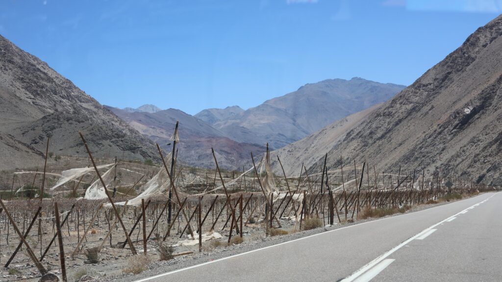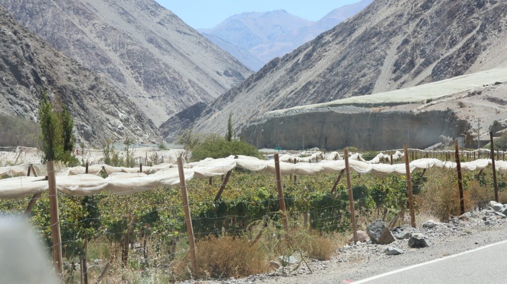 Auf 3100m ist auch die chilenische Seite geteert. 44 Kilometer vor Vicuna sehe ich Tücher am Berghang. Gleich darauf stellen wir fest, dass hier Rebstöcke damit bedeckt sind. Bis nach Vicuna wachsen Reben oder sie sind verdorrt. Die zerschlissenen Tücher flattern im Wind. Wassermangel setzt den Reben zu. Hier wird der Pisco gemacht. Vielleicht schauen wir uns morgen an, wie das passiert. Wir haben einen kleinen Campingplatz gefunden und Bruno und Ursi aus der Schweiz getroffen. Sie sind schon längere Jahre unterwegs, mit Pause. Sie kommen vom Norden.