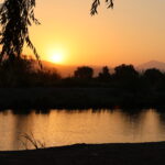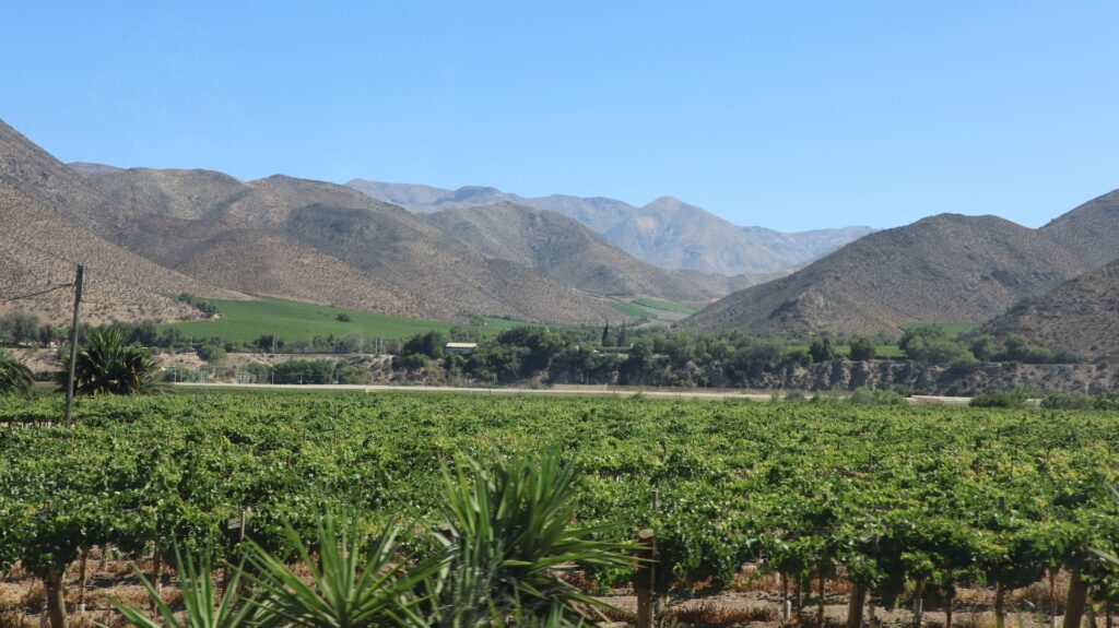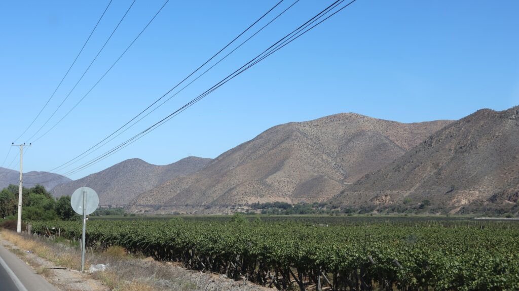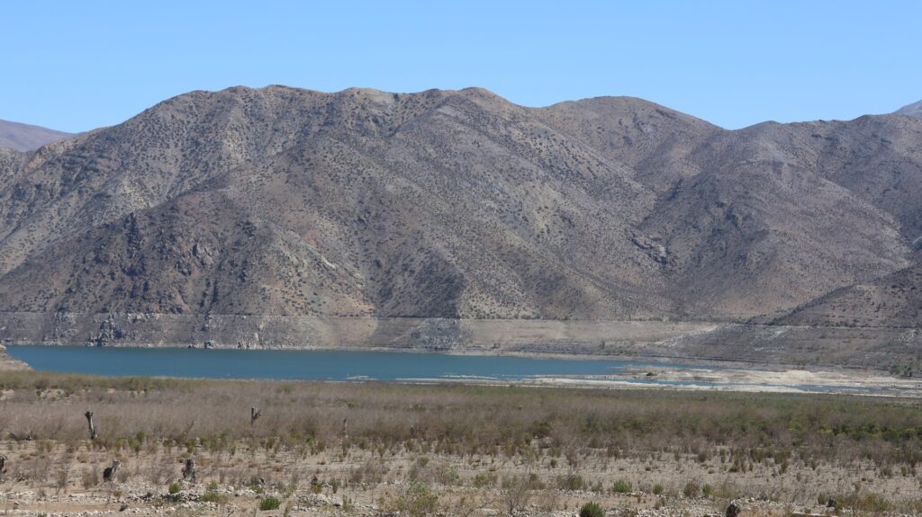 Am Anfang sehen wir noch viele Reben. Darum herum ist es karg und trocken. Ein Stausee hat wahrscheinlich auch schon sehr viel mehr Wasser gestaut.