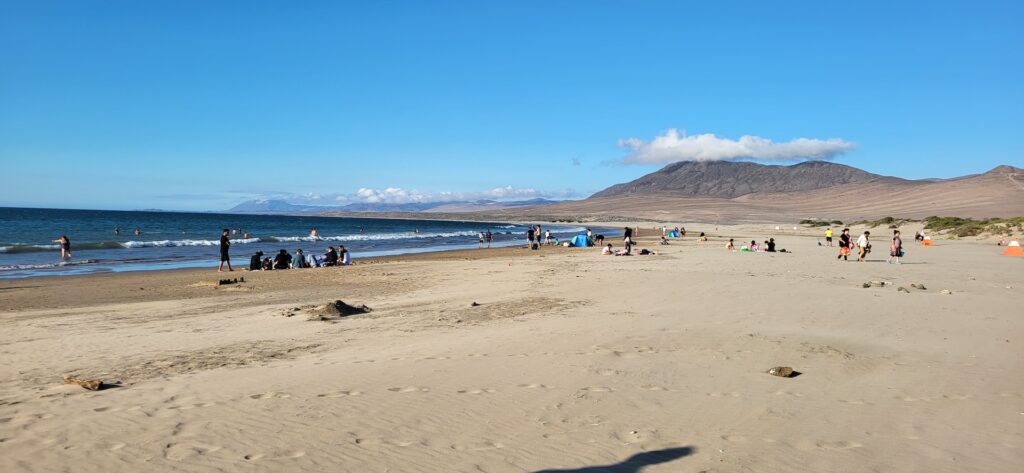Manfred verlässt die Autobahn, um Schatten zu suchen. In Higuera findet er tatsächlich einen Baum. Ich bin erstaunt, in diesem Ort gibt es für einmal mehr schöne Häuschen als Hütten. Wir fahren hinter einem kleinen Laster her, der Pools geladen hat. Woher nehmen die hier das Wasser für so einen Luxus? Nach der Autobahnzahlstelle steht ein Mann mitten auf der Autobahn und hält etwas feil. Ich stell mir das gerade in der Schweiz vor.