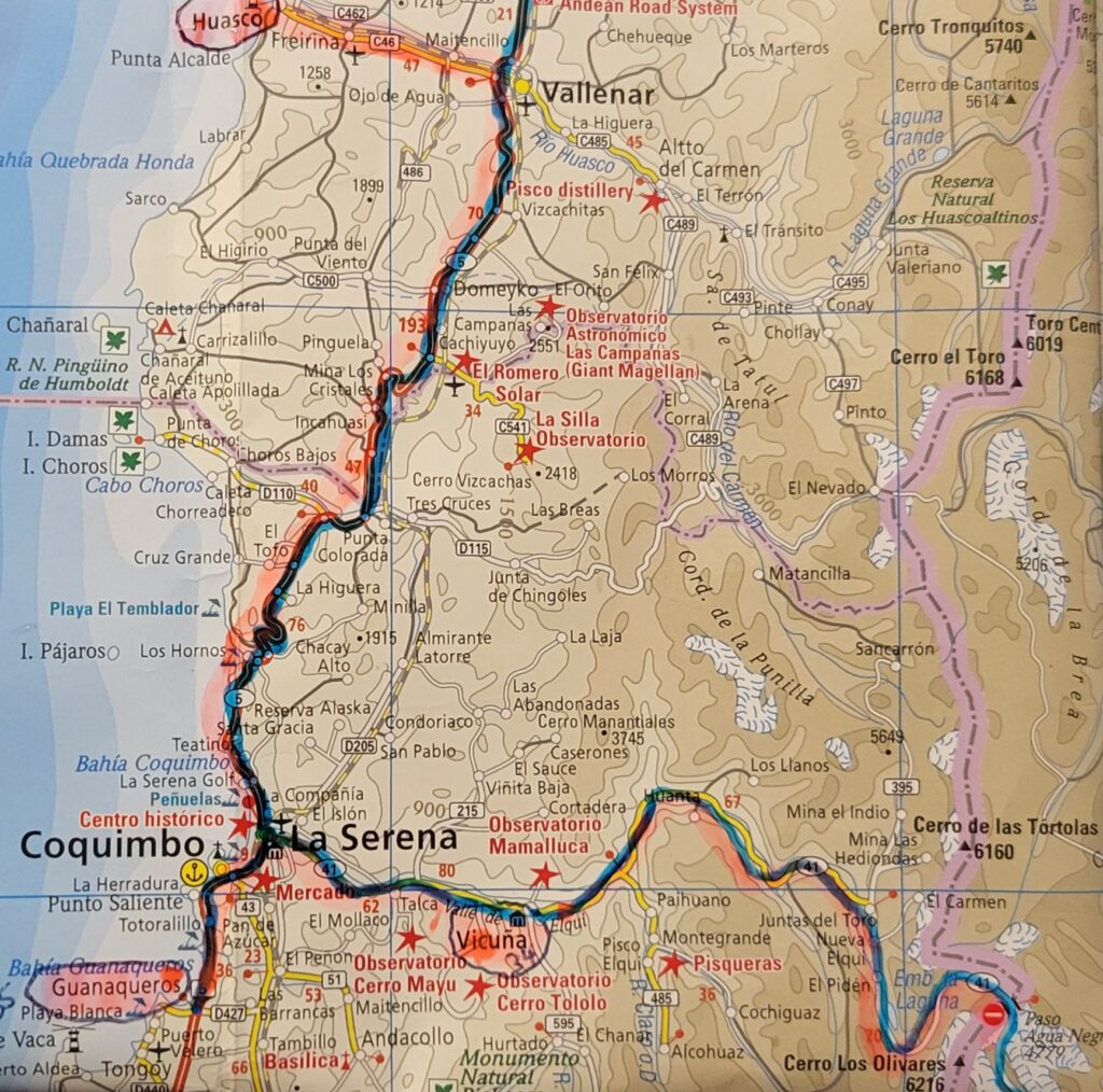 Wir packen zusammen und machen uns spät auf den Weg. In Coquimbo ist wieder Stau angesagt. Um durch die Stadt und La Serena zu kommen, brauchen wir 90 Minuten. Danach ist noch einkaufen angesagt. Alles braucht sehr viel Zeit. Nachdem wir vom Meer wegfahren, geht es bis auf 1000m hinauf. Wir erreichen die Atacama Wüste.