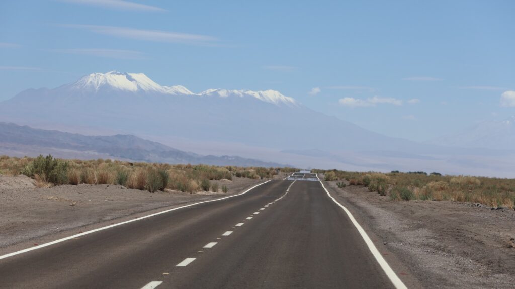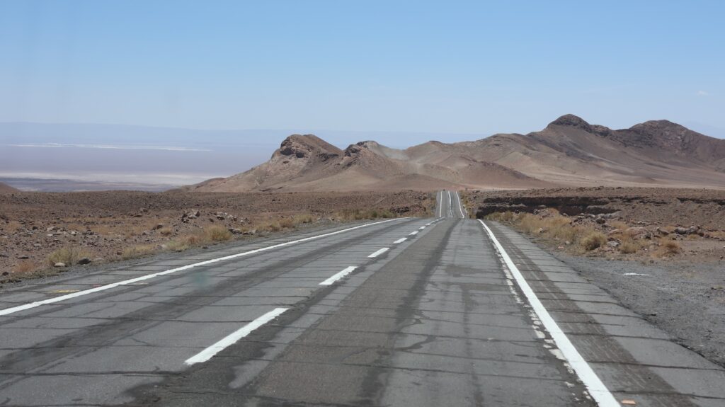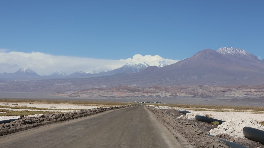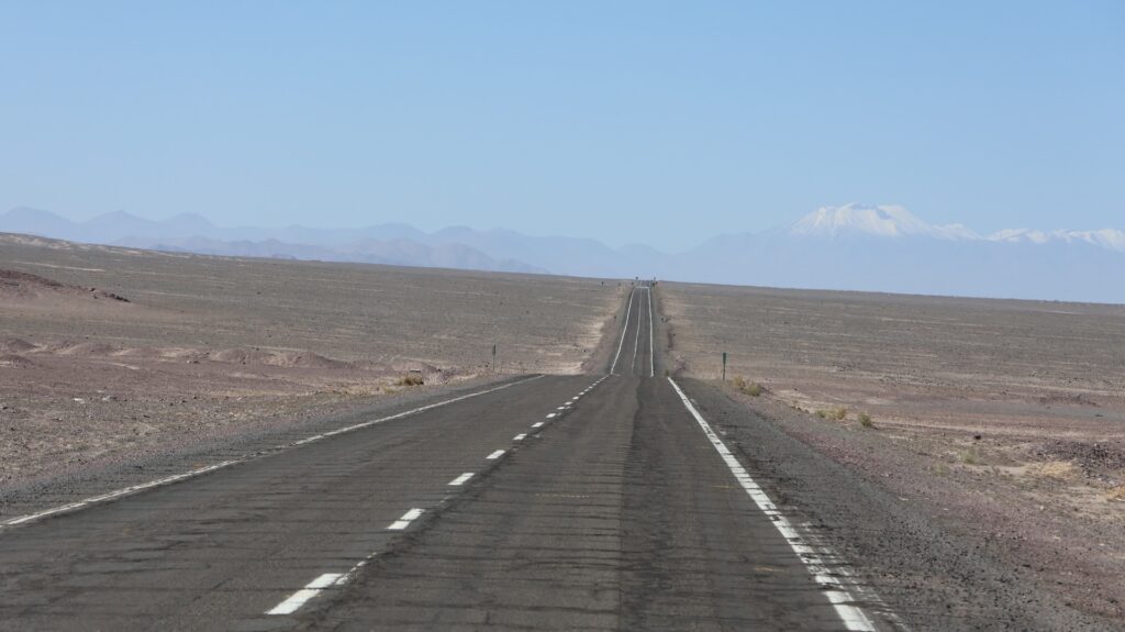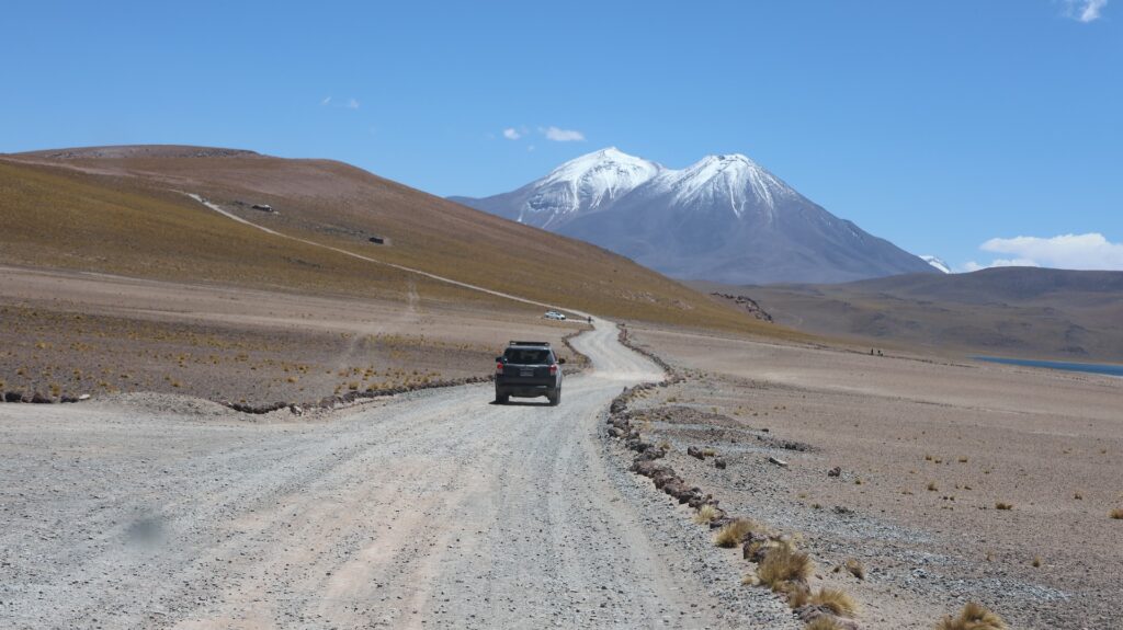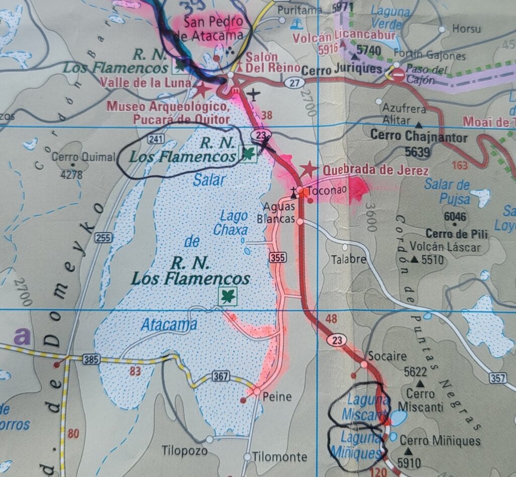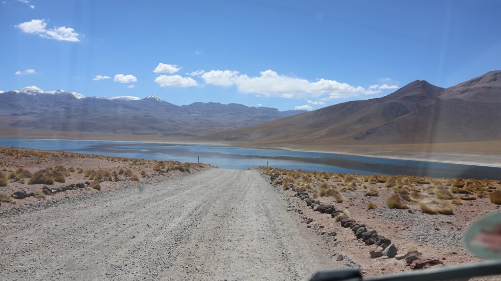 Die Teerstrasse führt zuerst entlang dem Salar Atacama. Danach führt sie ins Landesinnere nach Socaire, das auf 3300m liegt. Bei 3800m biegen wir in eine Schotterpiste ein. Die führt auf 4200m Höhe zum Eingang der Lagunen.