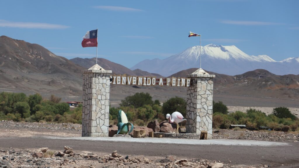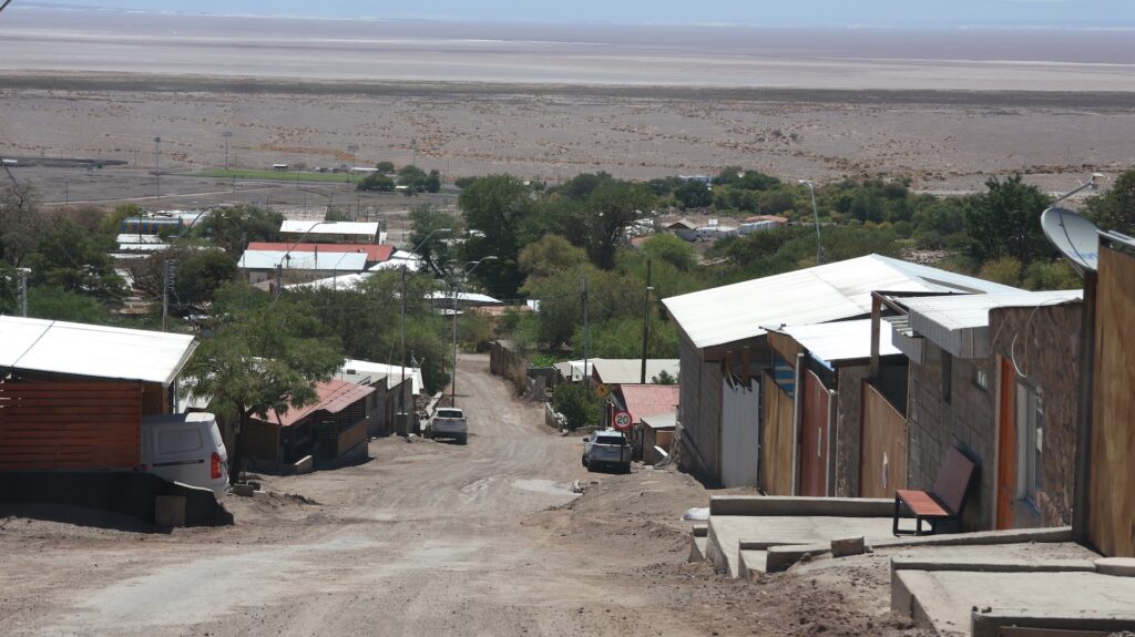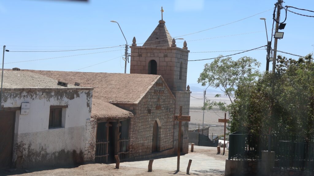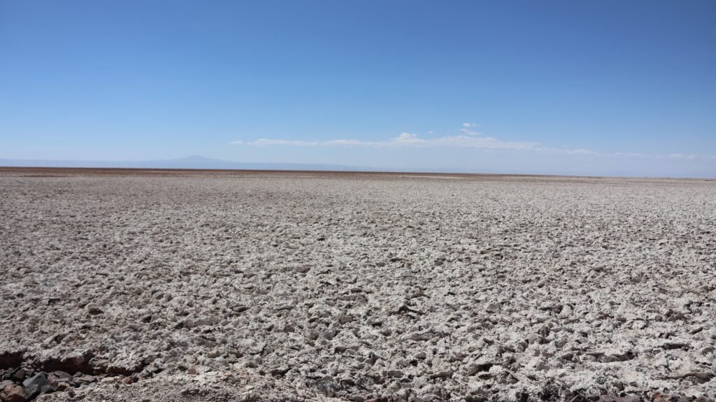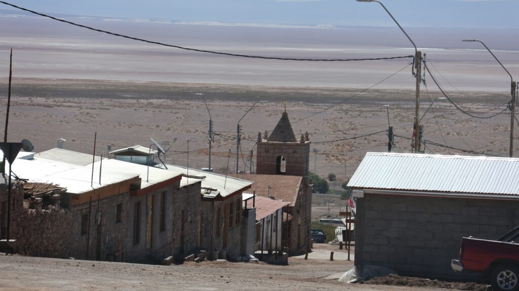 Wir fahren wieder hinunter auf 2500m und besuchen den Ort Peine. Er soll mal Charme gehabt haben schreibt jemand. Aber seit hier in der Gegend Lithium abgebaut wird, nicht mehr. Ich kann dort nirgends einen vergangenen Charme entdecken. Es gibt 3 Strassen den Hügel hinauf und ein paar Querstrassen. Die Häuser sehen aus wie überall hier und die Hütten auch. Wir fahren auf der kleinen Strasse wieder zurück und halbwegs in den See hinein. Aber wir sehen nichts Spezielles und drehen wieder um. Wir wissen nicht, wo wir schlafen sollen, es ist 30 Grad und kein Schatten. So entscheiden wir, wieder zum Wäldchen zu fahren und dort ein zweites Mal zu übernachten.