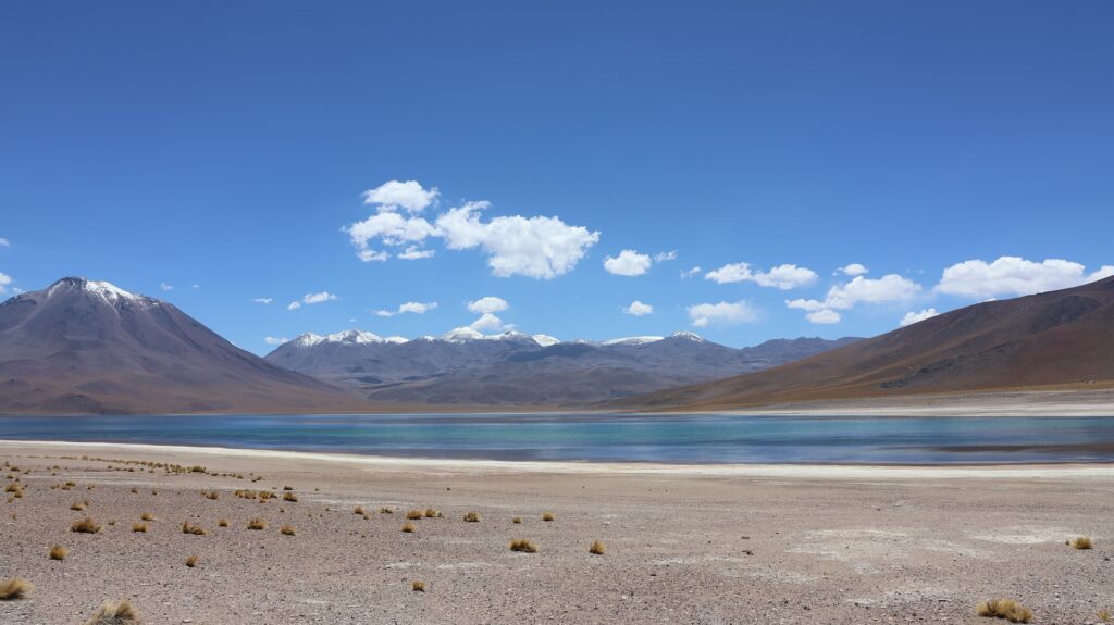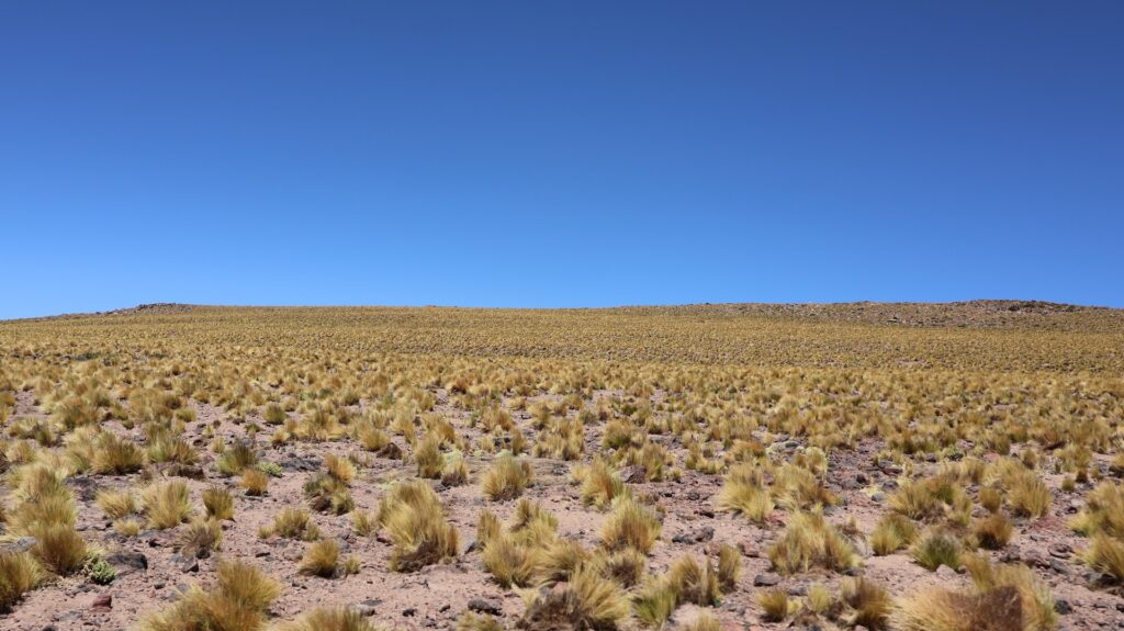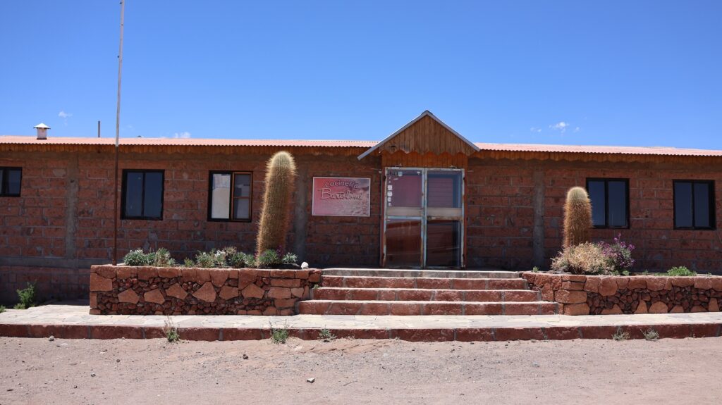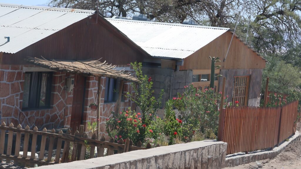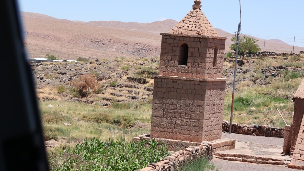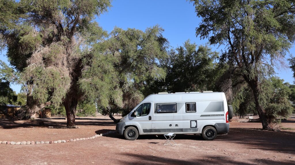 Wir fahren wieder hinunter auf 2500m und besuchen den Ort Peine. Er soll mal Charme gehabt haben schreibt jemand. Aber seit hier in der Gegend Lithium abgebaut wird, nicht mehr. Ich kann dort nirgends einen vergangenen Charme entdecken. Es gibt 3 Strassen den Hügel hinauf und ein paar Querstrassen. Die Häuser sehen aus wie überall hier und die Hütten auch. Wir fahren auf der kleinen Strasse wieder zurück und halbwegs in den See hinein. Aber wir sehen nichts Spezielles und drehen wieder um. Wir wissen nicht, wo wir schlafen sollen, es ist 30 Grad und kein Schatten. So entscheiden wir, wieder zum Wäldchen zu fahren und dort ein zweites Mal zu übernachten.