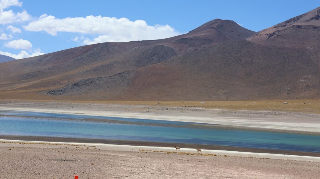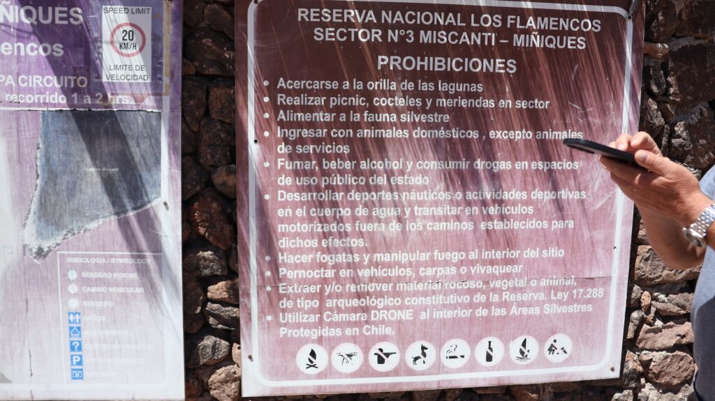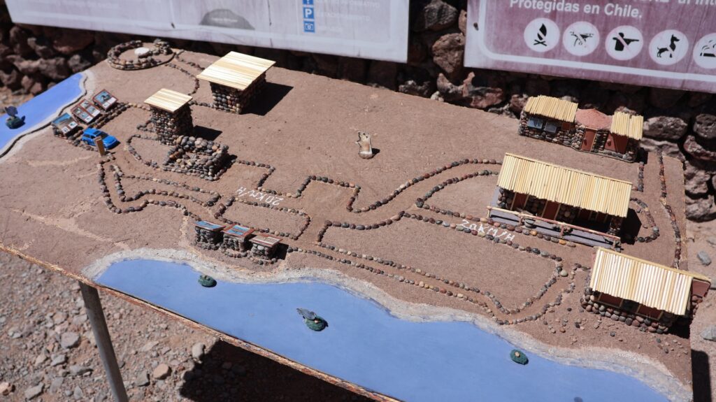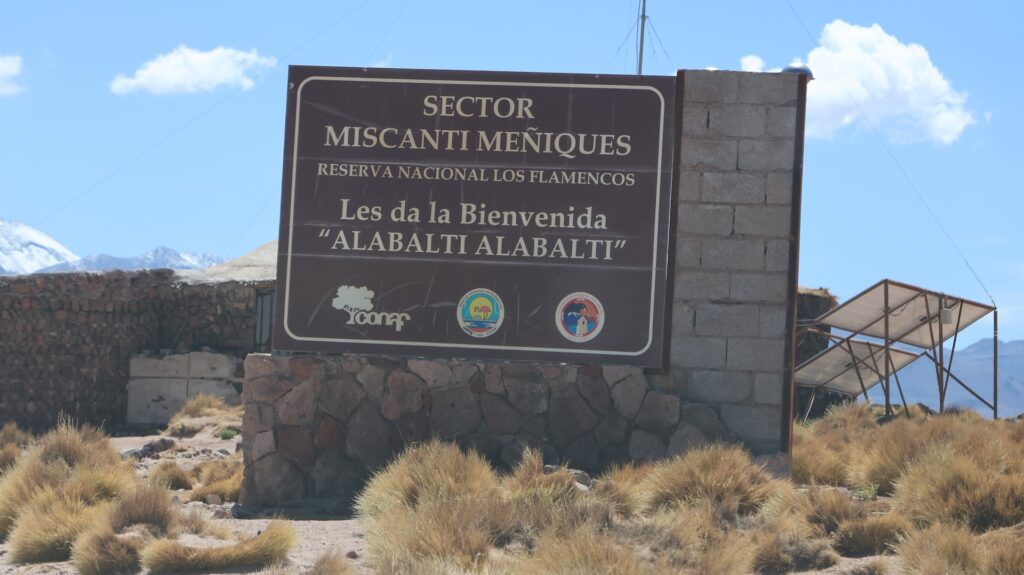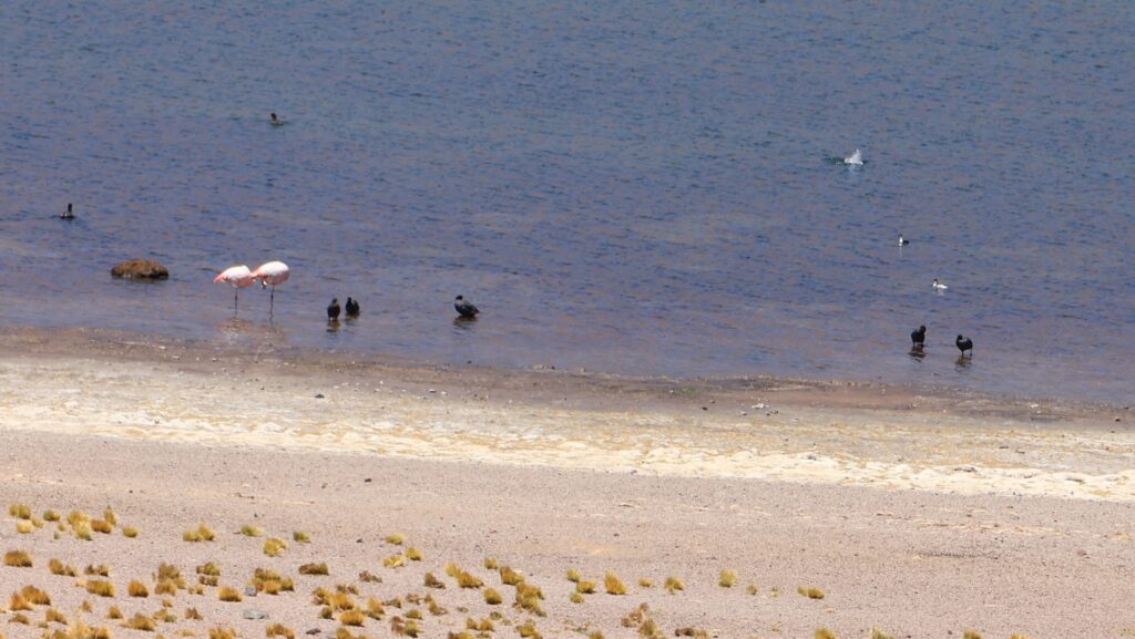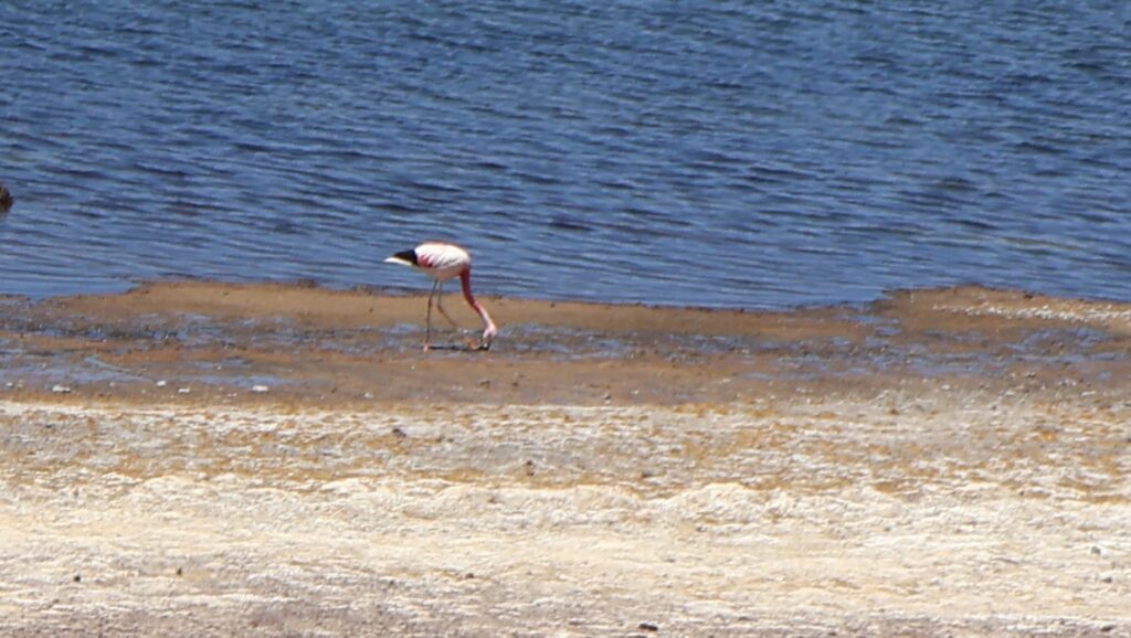 Ein Barriere und ein junger Mann hindern uns am Weiterfahren. Oh nein, das Foto gilt nicht als Eintritt. Wir sollten ein E-Mail bekommen haben! Da oben haben wir kein Internetempfang. Aber vielleicht kam ja vor unserer Abfahrt im Wäldchen ein E-Mail. Tatsächlich, wir dürfen hineinfahren. In der Hütte wird von Hand ein Billett ausgestellt!! Auf dem Dach hockt ein Vogel. Ein anderer Mann erklärt anhand einer Tafel und einer Miniaturanlage, was man darf und was nicht. Ich kann schon verstehen, dass sie diese Geldquelle schützen wollen. Pro Stunde dürfen nur eine bestimmte Anzahl Besucher hinein. Man darf nicht ans Wasser und muss überall innerhalb der Steinbegrenzung bleiben. Nebst der wunderbaren Landschaft mit den hohen Bergen, sehen wir Vicunas, eine Lama Art, Flamingos und andere Wasservögel. Allerdings sind sie weit weg. Manfred spürt die Höhe, es ist ihm schwindlig. Als er mit Aargauer Touristen redet, geht es ihm besser.